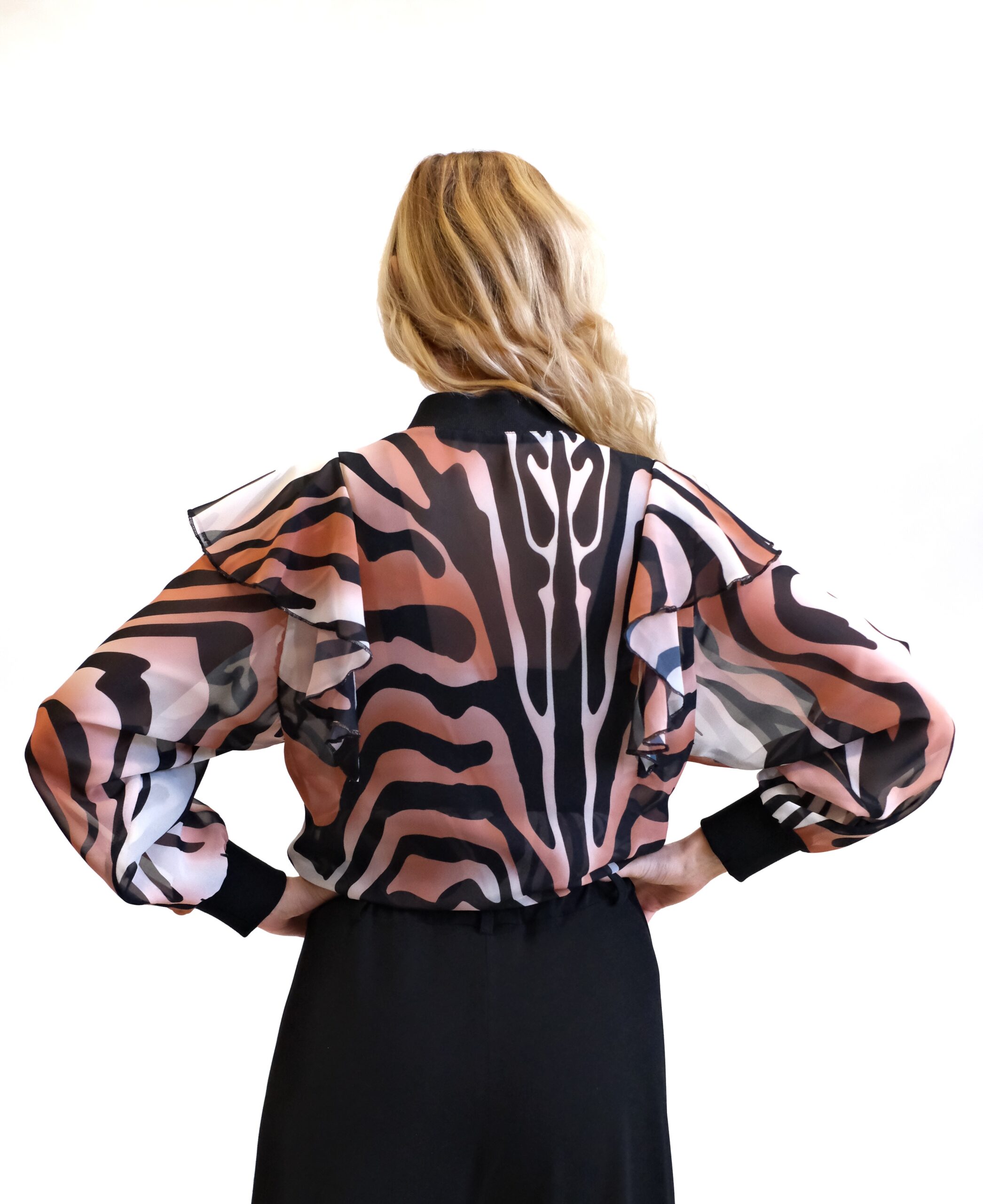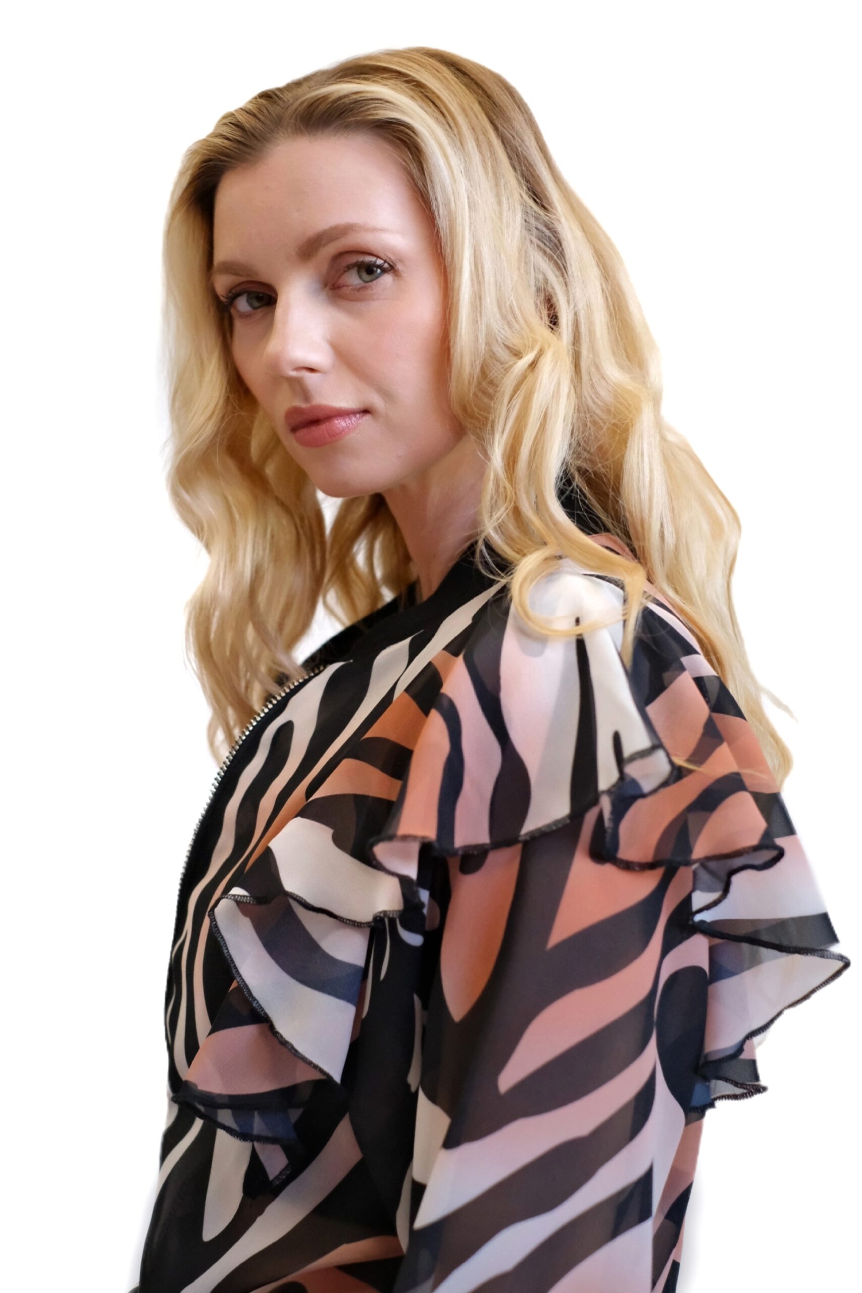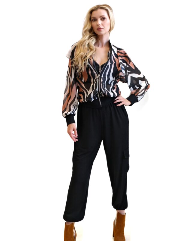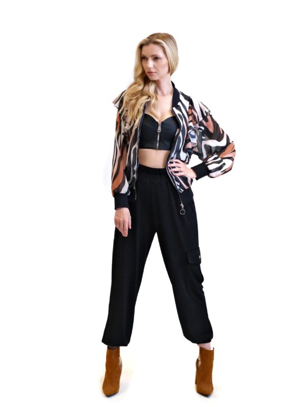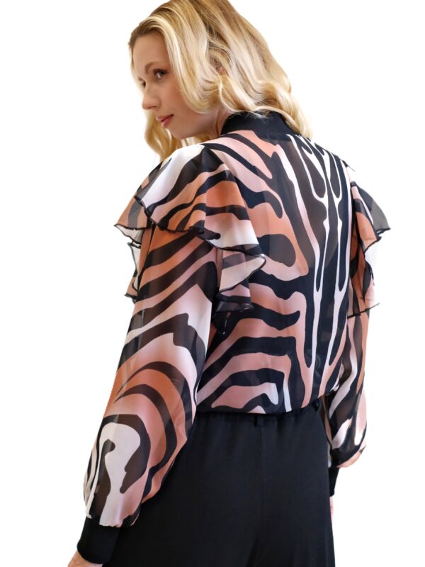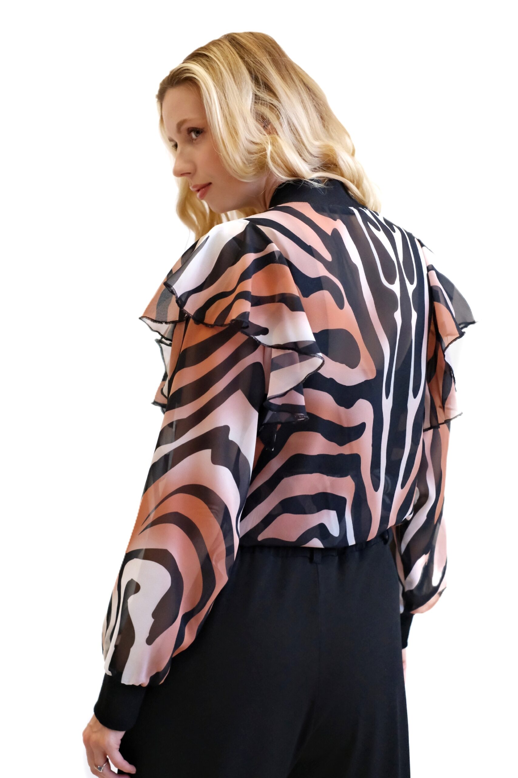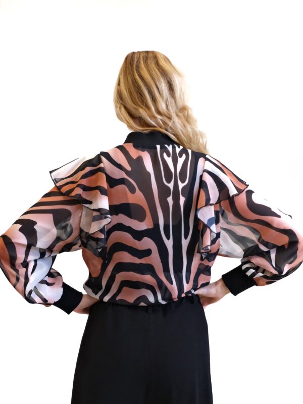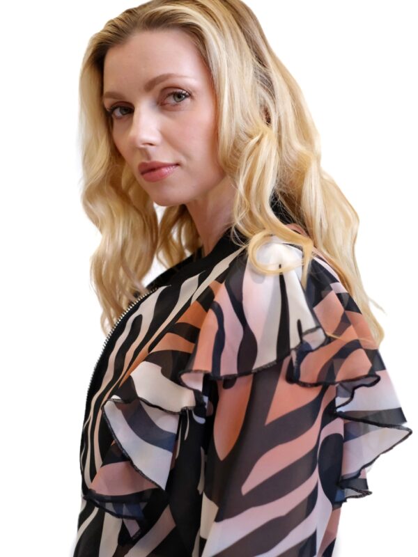 Bombera je ušitá z ľahkého presvitajúceho šifónu, ktorý sa skvele hodí na nadchádzajúce obdobie. Ráno a večer keď sa ochladí Vás zahreje a počas horúceho dňa Vám ľahký materiál nebude prekážať. Bombera je navrhnutá v klasickom strihu s výrazným zipsom a kontrastným patentom na golieri a rukách. Zaujímavým detailom je našitý volán na ramenách bombery, čo jej dodává na vzdušnosti. Bombera je navrhnutá v zvieracom motíve, ktorý poľahky kombinuje čierno-bielu kombináciu so zemitou hnedou farbou.