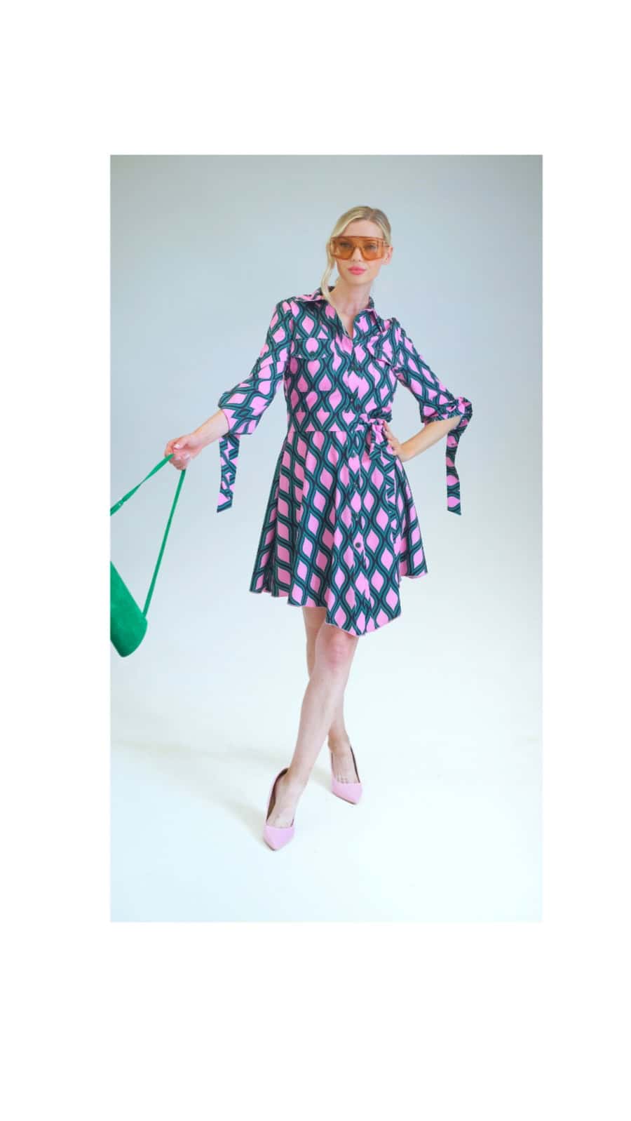 Šaty sú ušité v obľúbenom košeľovom strihu ktorý výborne sadne na každý typ postavy. Šaty sú navrhnuté v zaujímavom asymetrickom vzore ktorý kombinuje jemnú ružovú farbu s výrazne smaragdovo zelenou farbou. Vzor vytvára krásny kontrast ktorý skvele vyznie na takom jednoduchom košeľovom strihu. Šaty majú rukávy ktoré sa dajú vyhŕňať čím im dodávajú ležérny nádych. Šaty sú vhodné do práce aj do spoločnosti kombinujte ich ako naša aranžérka s jemnými pastelovými tónmi alebo výraznými smaragdovými odtieňmi. Zaujímavým detailom na šatách je asymetrický strihaná suknica ktorá sa postupne z bokov smerom dopredu a dozadu predlžuje čím vám opticky predĺži nohy. Šaty majú priložený opasok z rovnakého materiálu ale dajú sa nosiť aj bez neho.