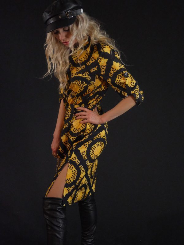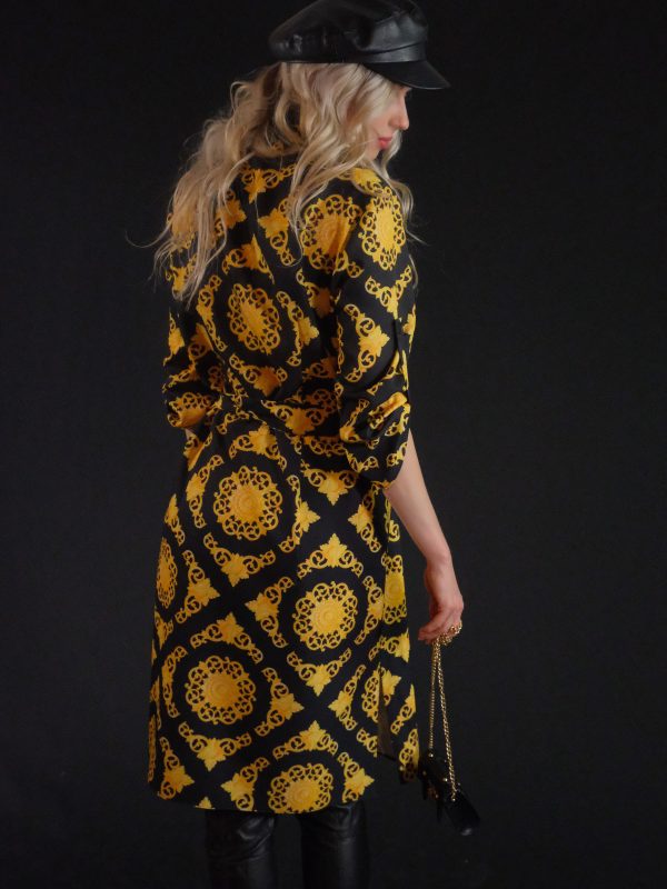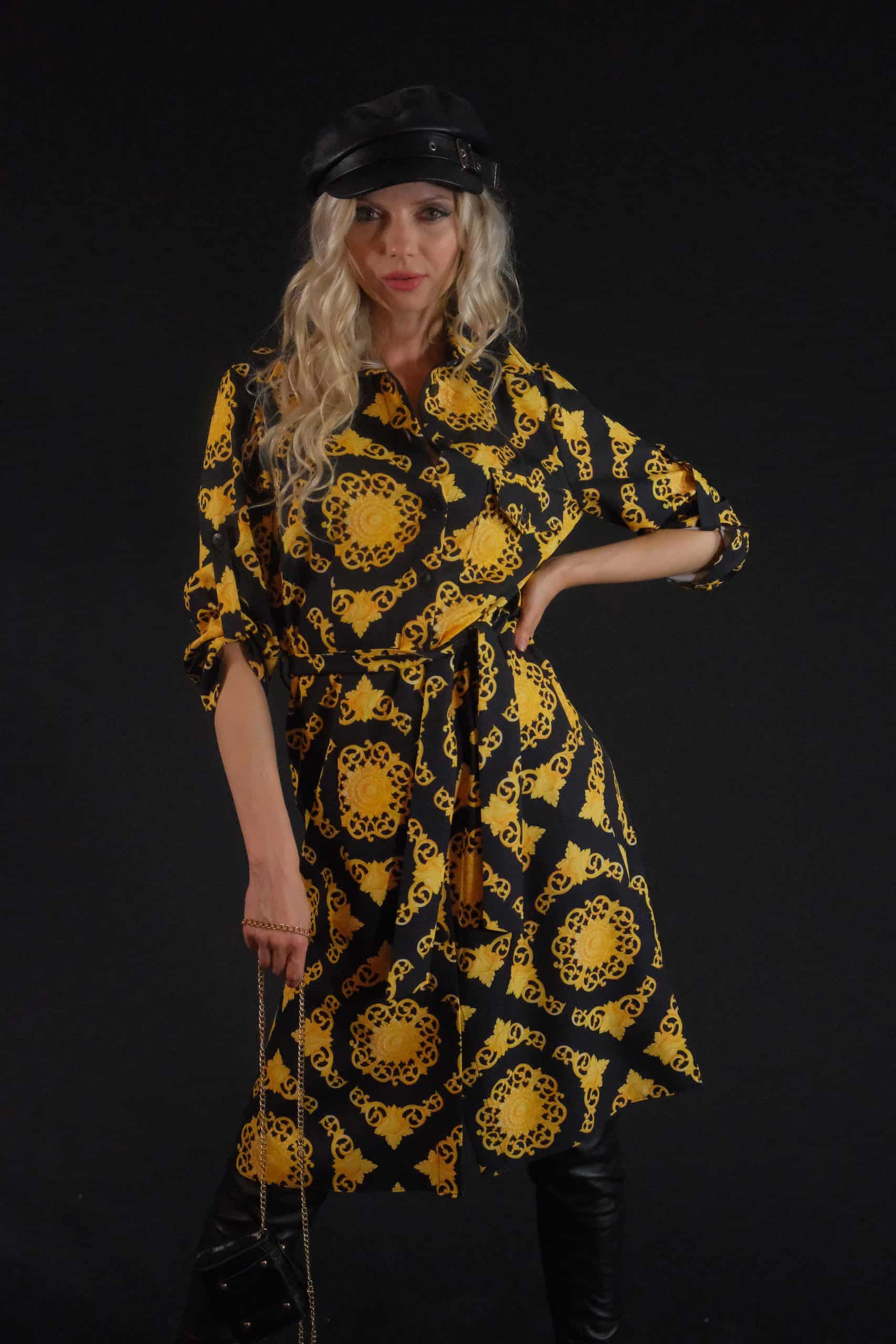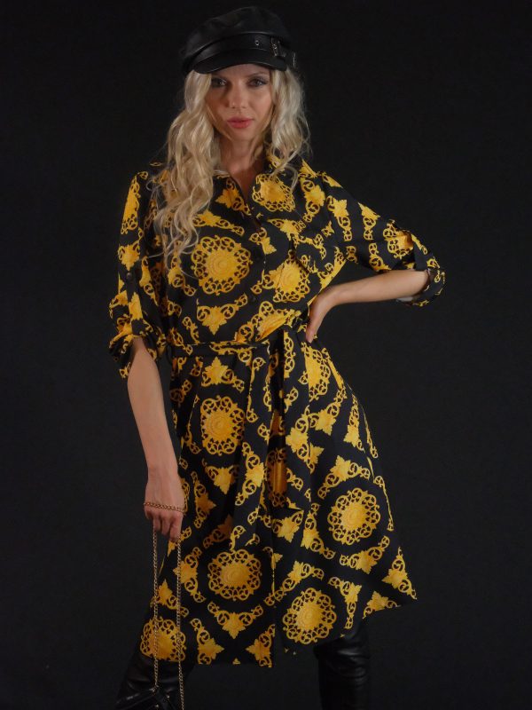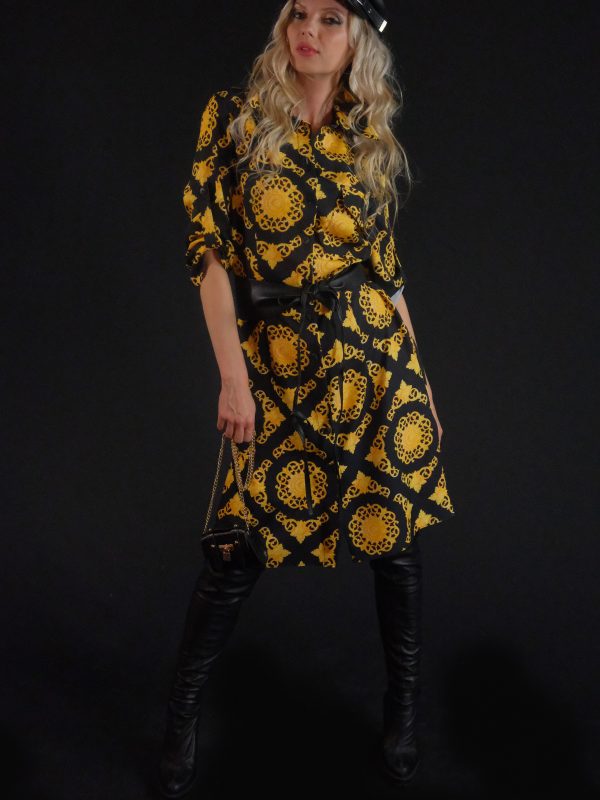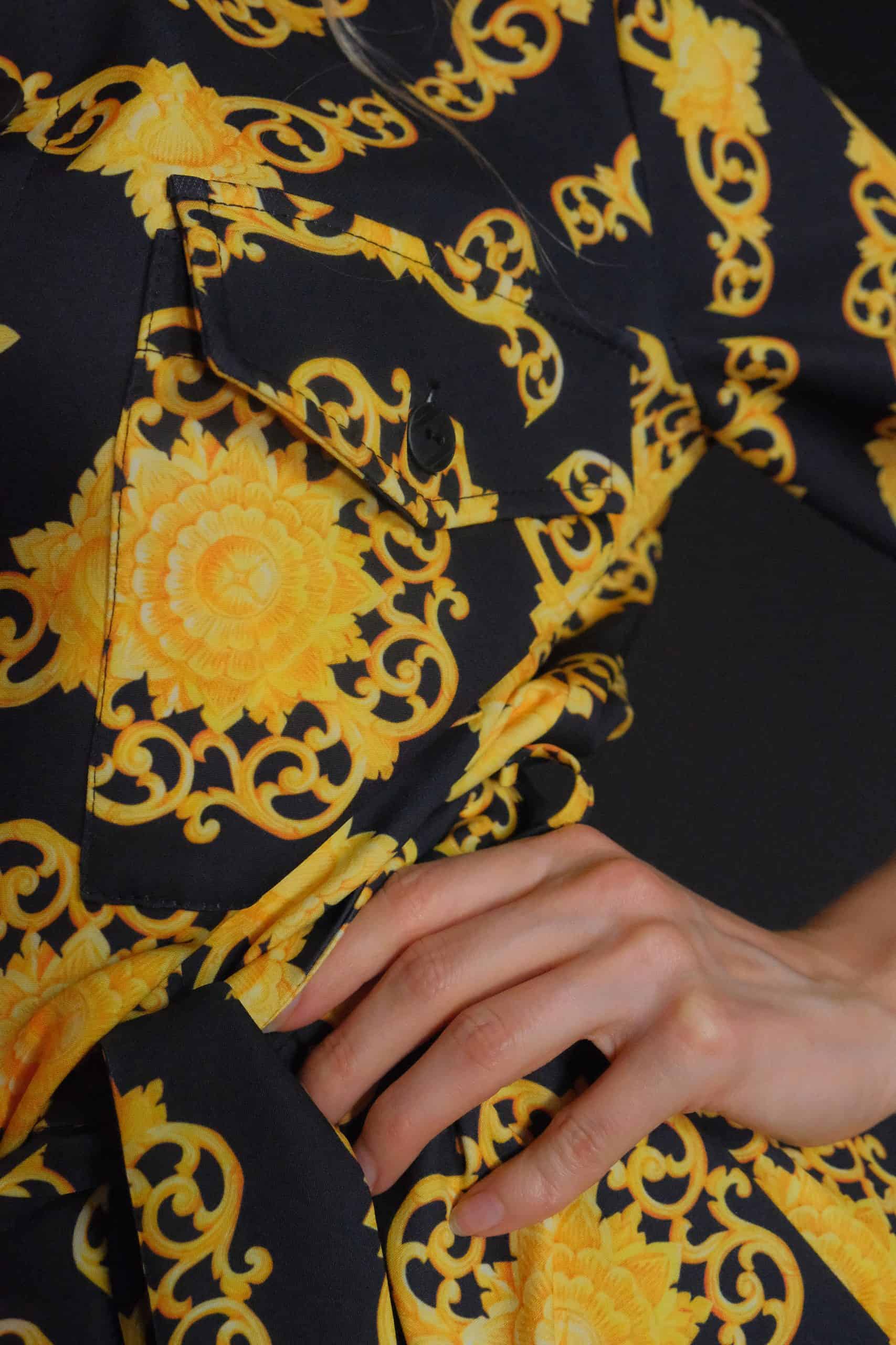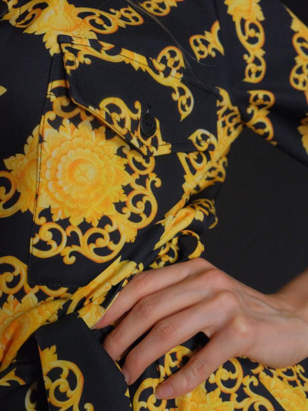 Šaty ušité v pohodlnom košeľovom strihu, v ktorom sa budete cítiť príjemne po celý deň aj počas oslavy. Šaty sú ušité v ikonickom barokovom motíve. Kombinácia čiernej a zlatej farby je nadčasová a môžete ju nosiť počas celého roka. Šaty majú rozstrihy po bokoch a môžete ich nosiť s opaskom aj bez.