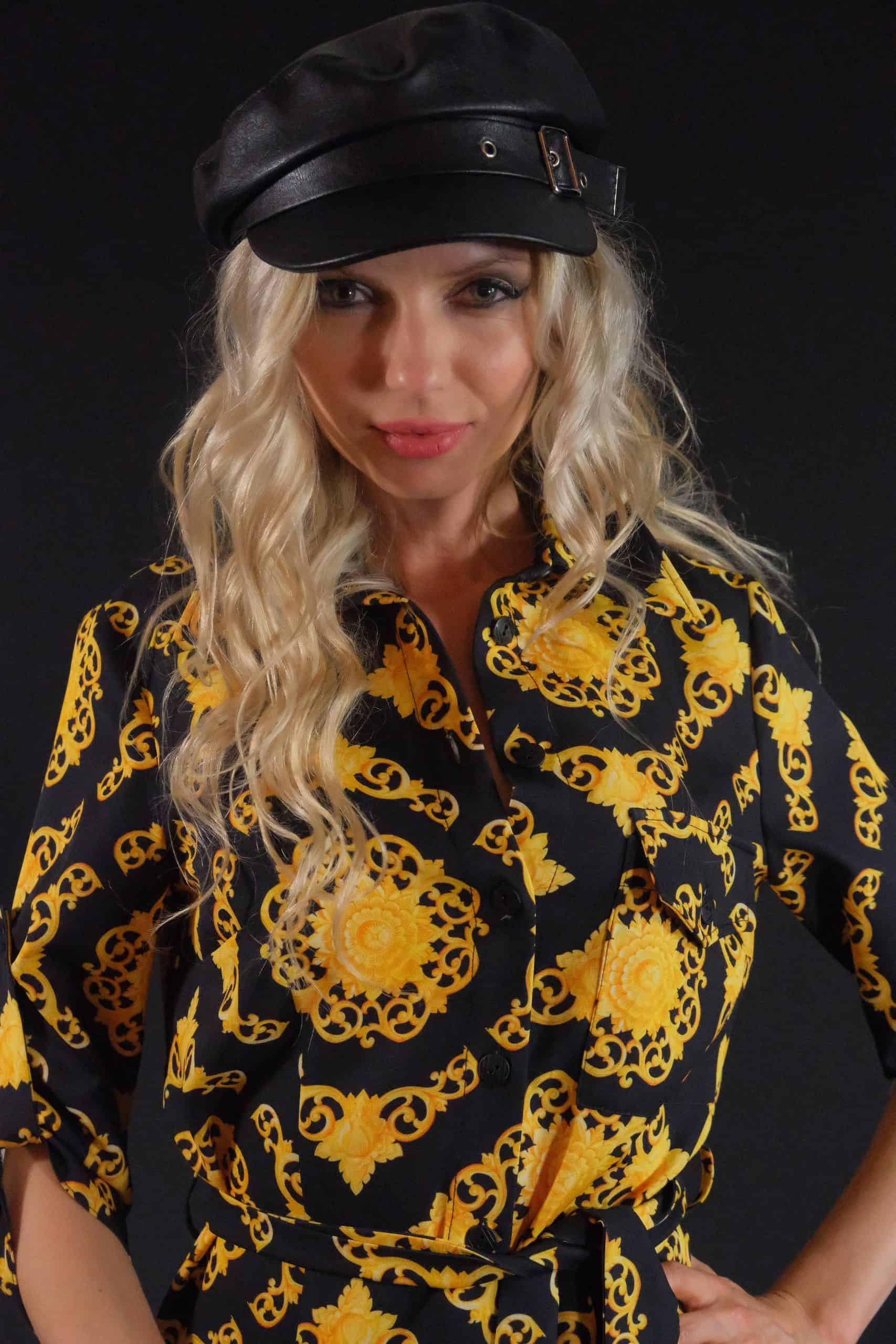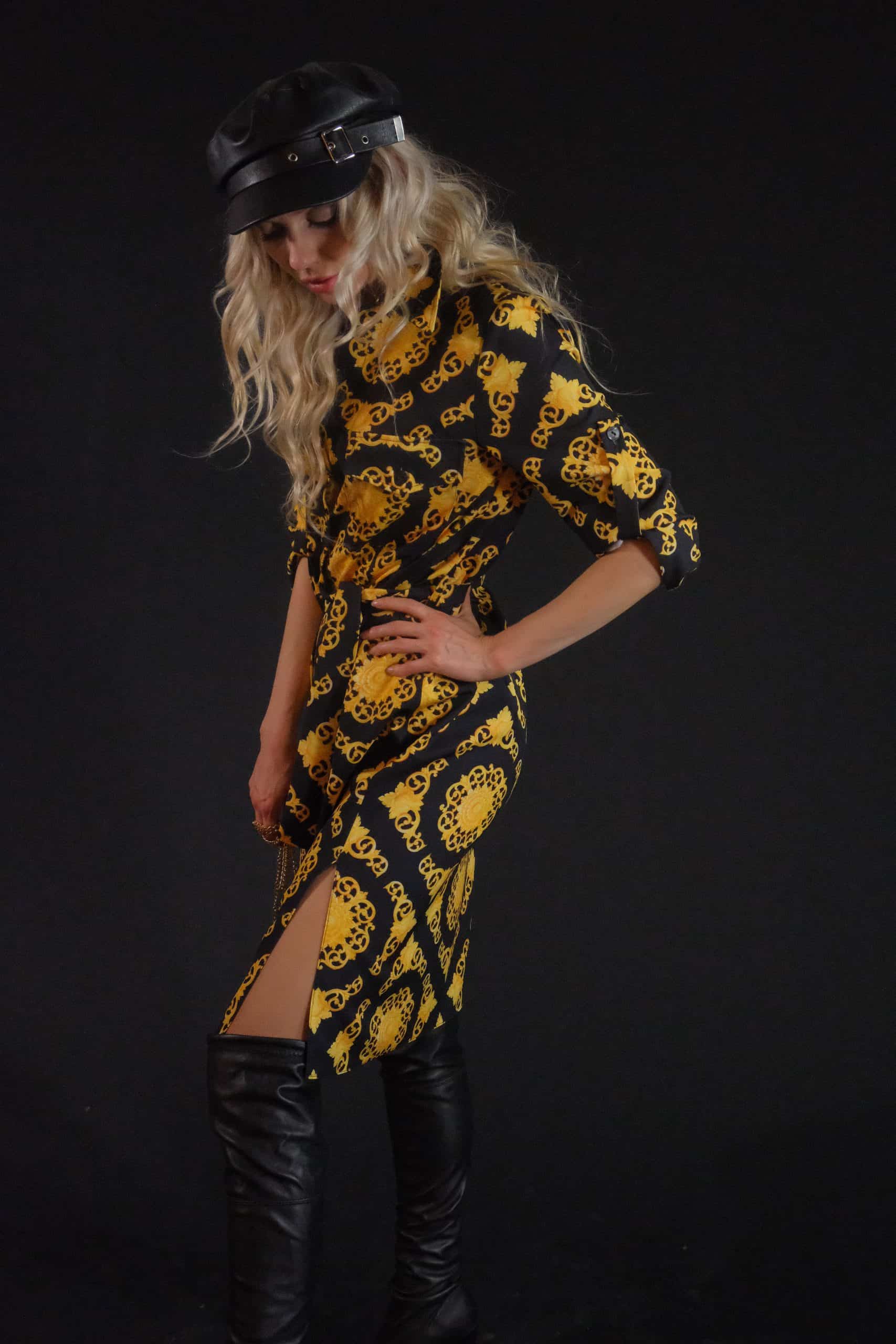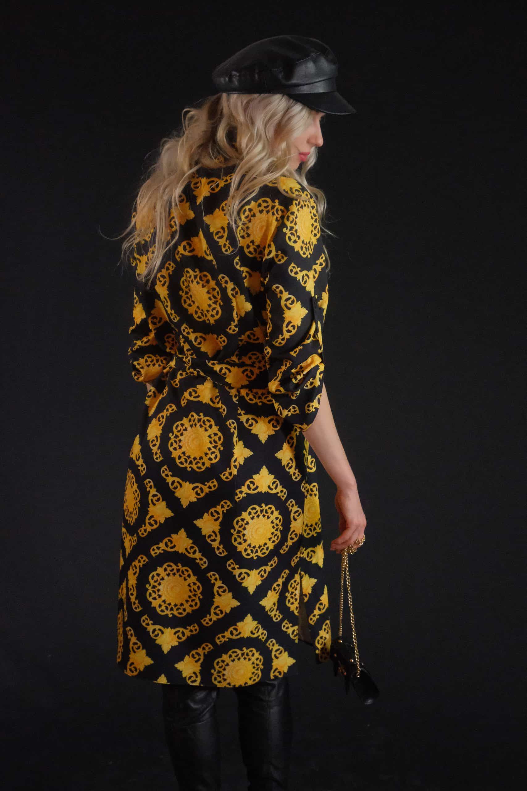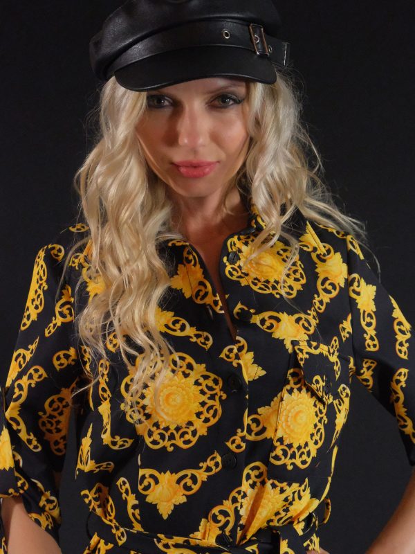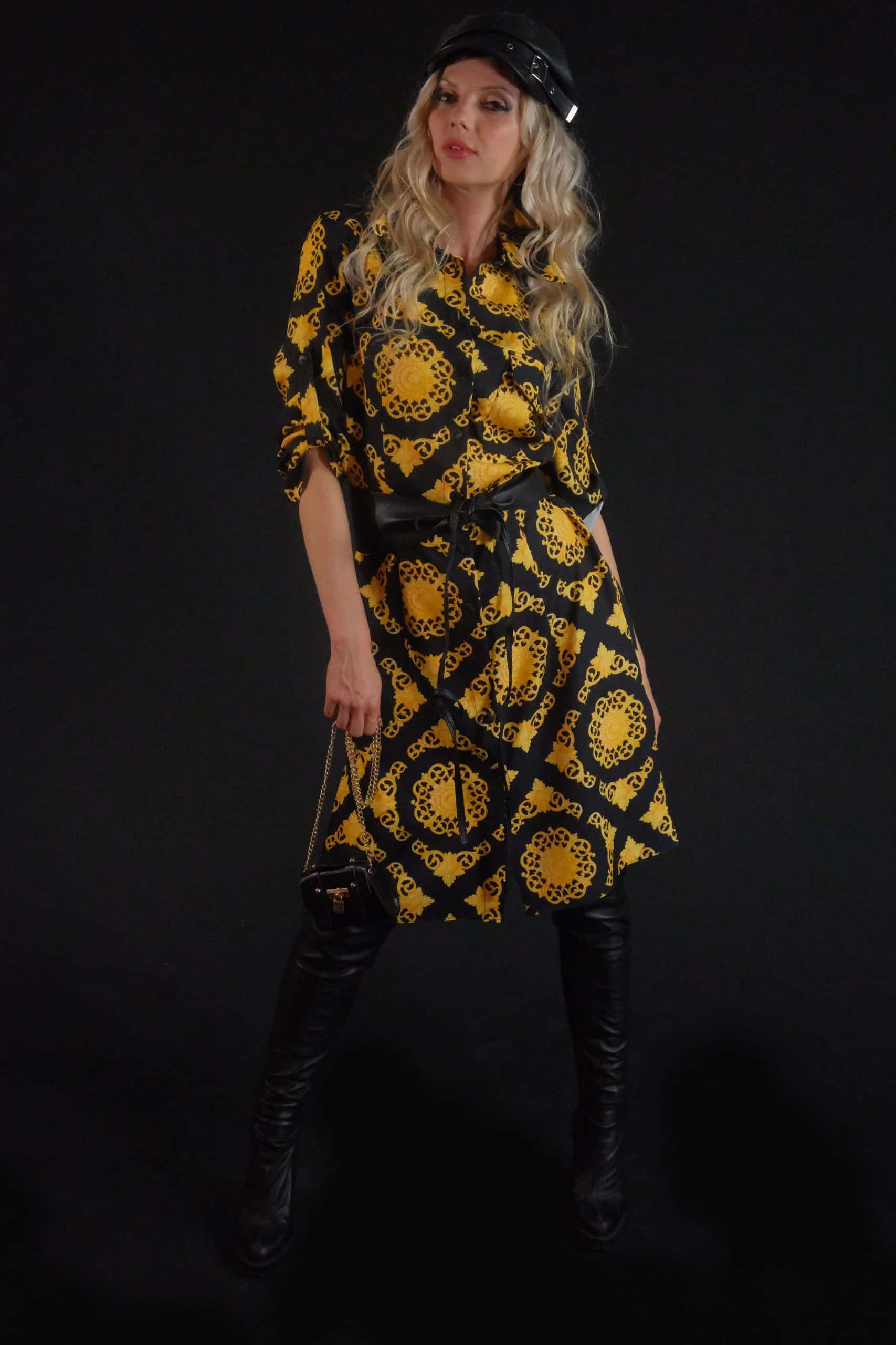 Šaty ušité v pohodlnom košeľovom strihu, v ktorom sa budete cítiť príjemne po celý deň aj počas oslavy. Šaty sú ušité v ikonickom barokovom motíve. Kombinácia čiernej a zlatej farby je nadčasová a môžete ju nosiť počas celého roka. Šaty majú rozstrihy po bokoch a môžete ich nosiť s opaskom aj bez.