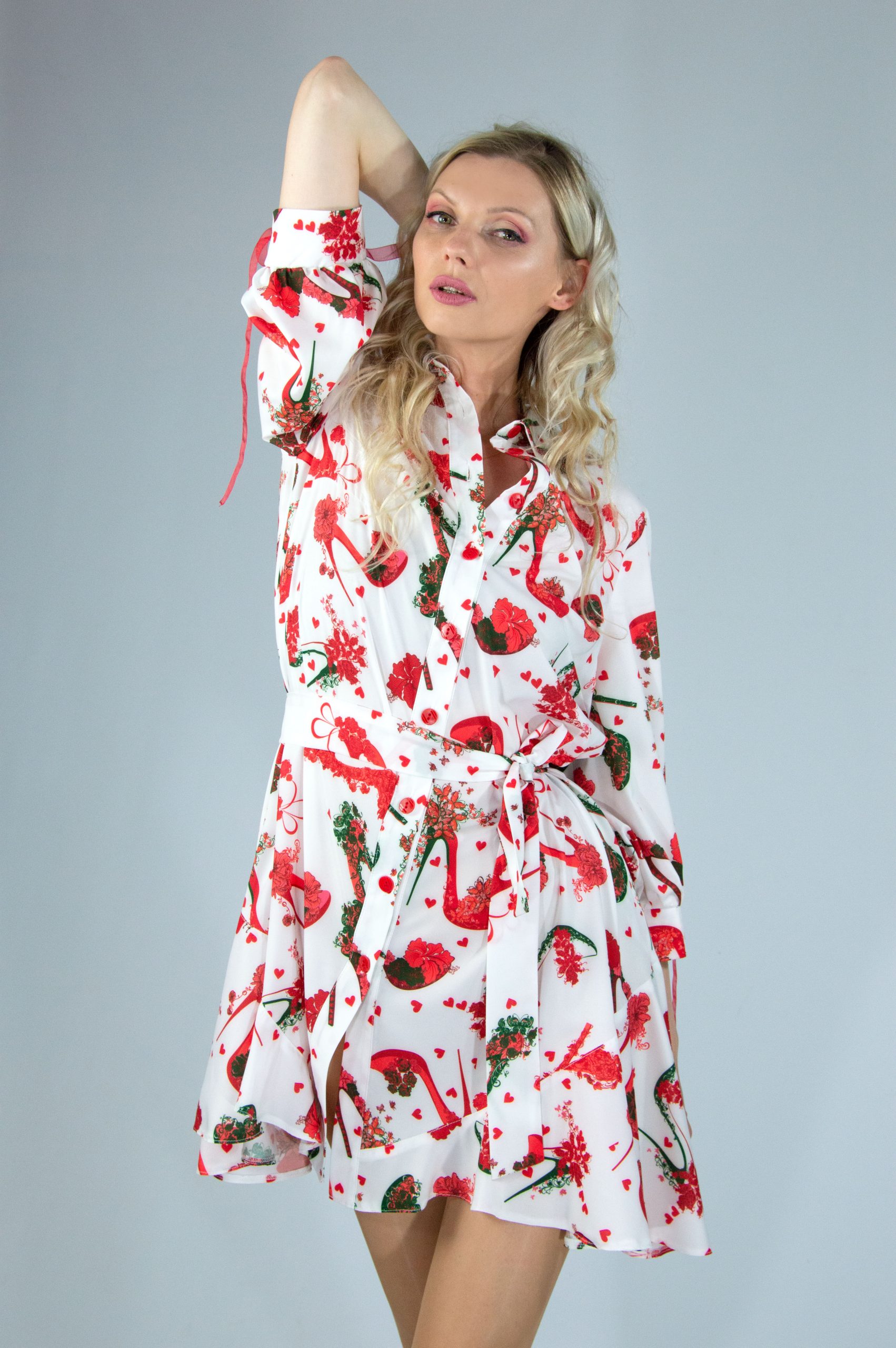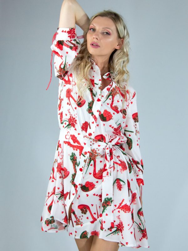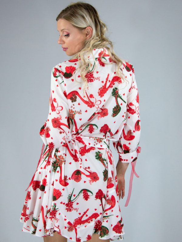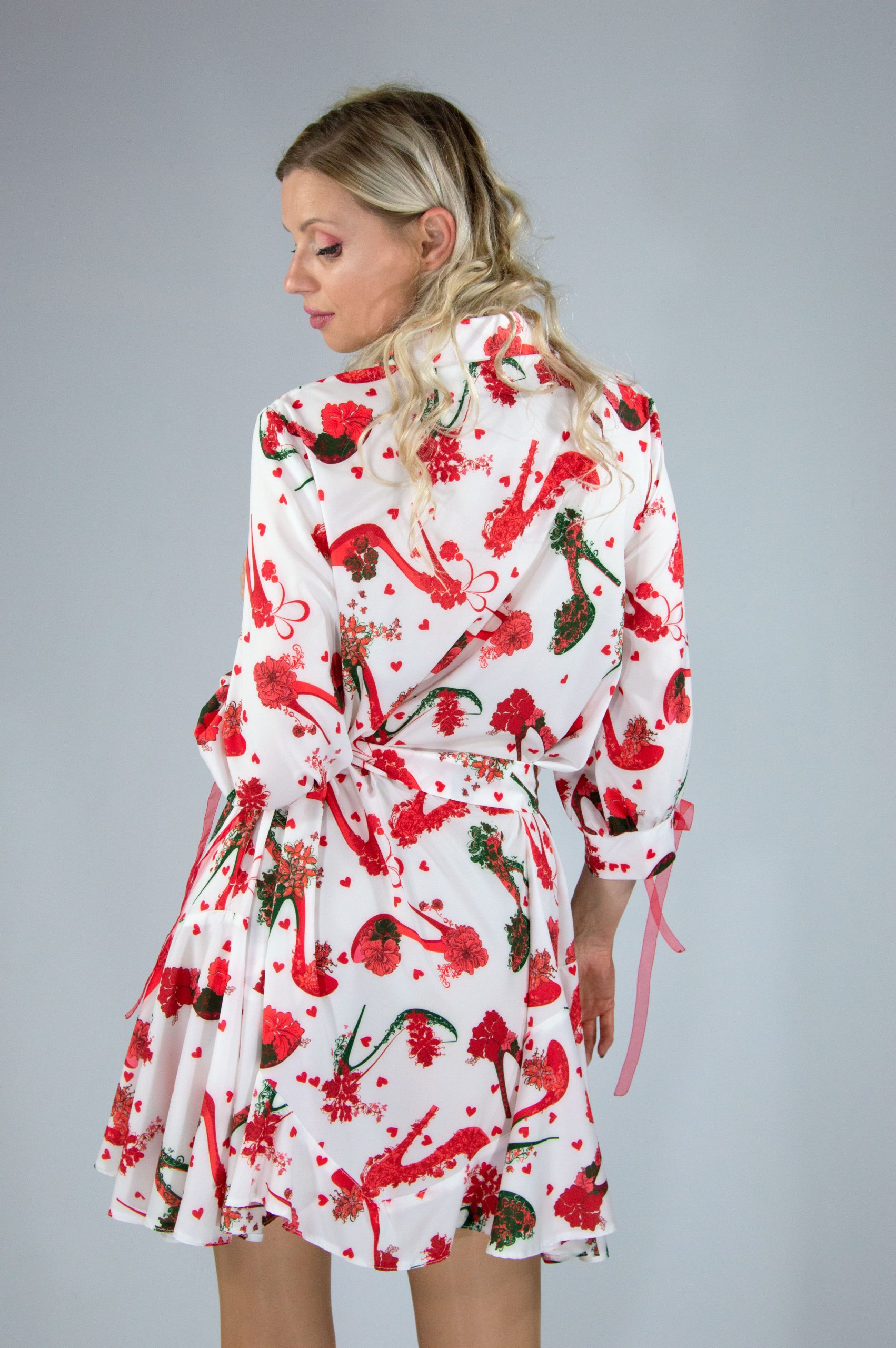 Šaty ušité vo výraznom áčkovom strihu. Šaty majú bohémske rukávy zviazané kontrastnou červenou stužkou a sú lemované romantickým volánom. Šaty sa dajú nosiť s priloženým opaskom aj bez. Zaujímavým prvkom je jednoznačne vzor, ktorý bol navrhnutý len pre našu značku. Namiesto tradičných bodiek máte teda srdiečka, ktoré vyjadrujú aj lásku každej ženy k topánkam. Topánky sú na vzore znázornenie taktiež vo forme ruže na vysokom opätku. Skutočne originálny vzor, ktorý rozžiari Vaše leto. Must-have kúsok pre milovníčky topánok.