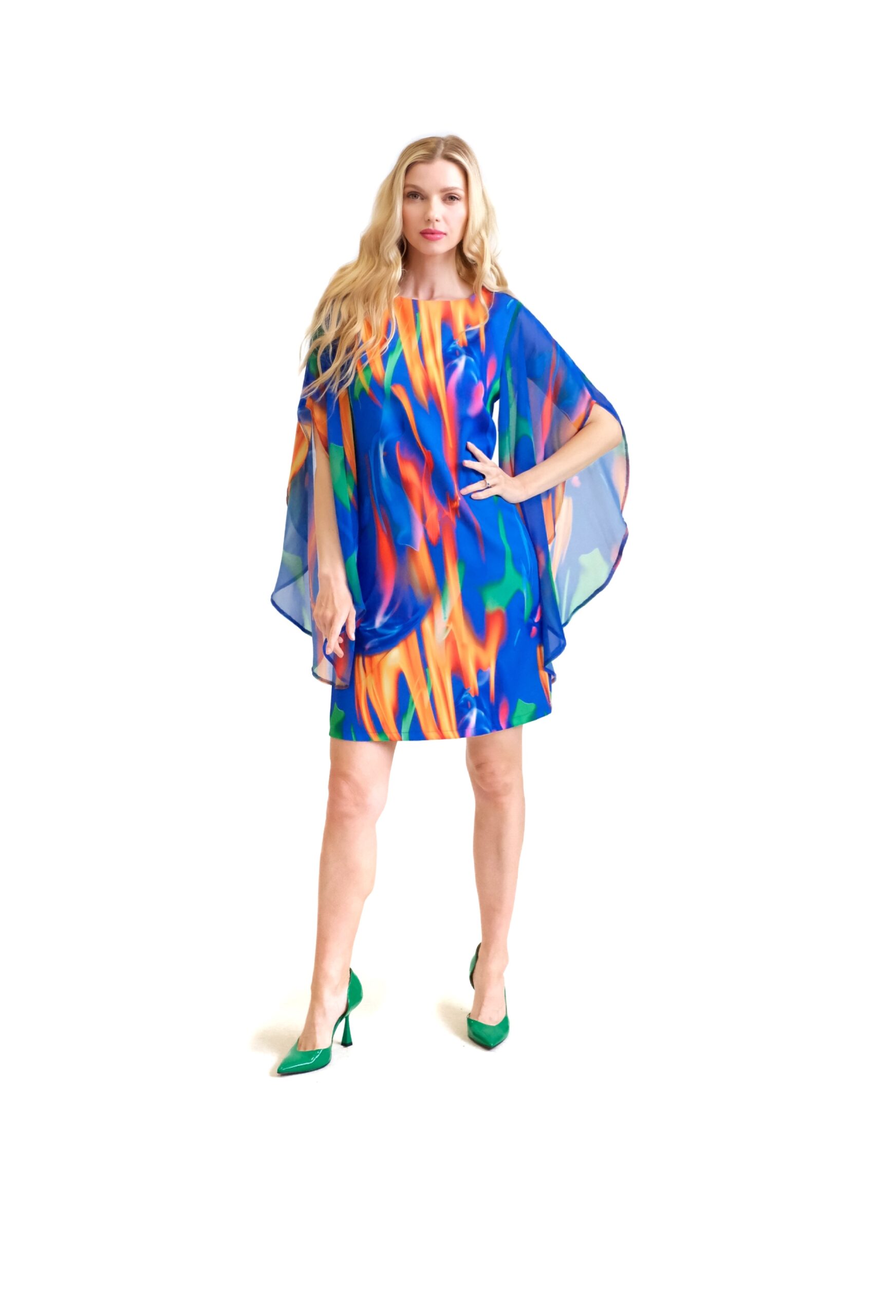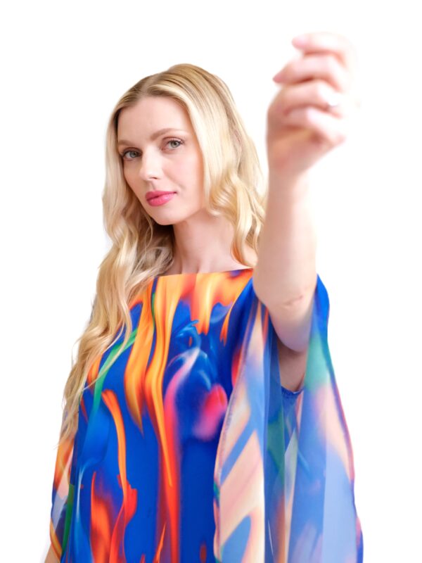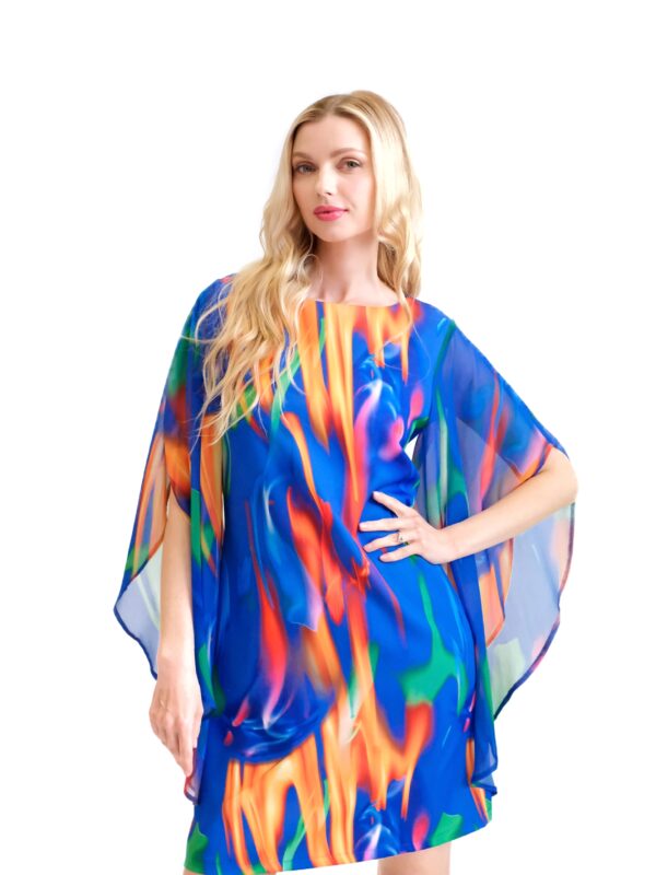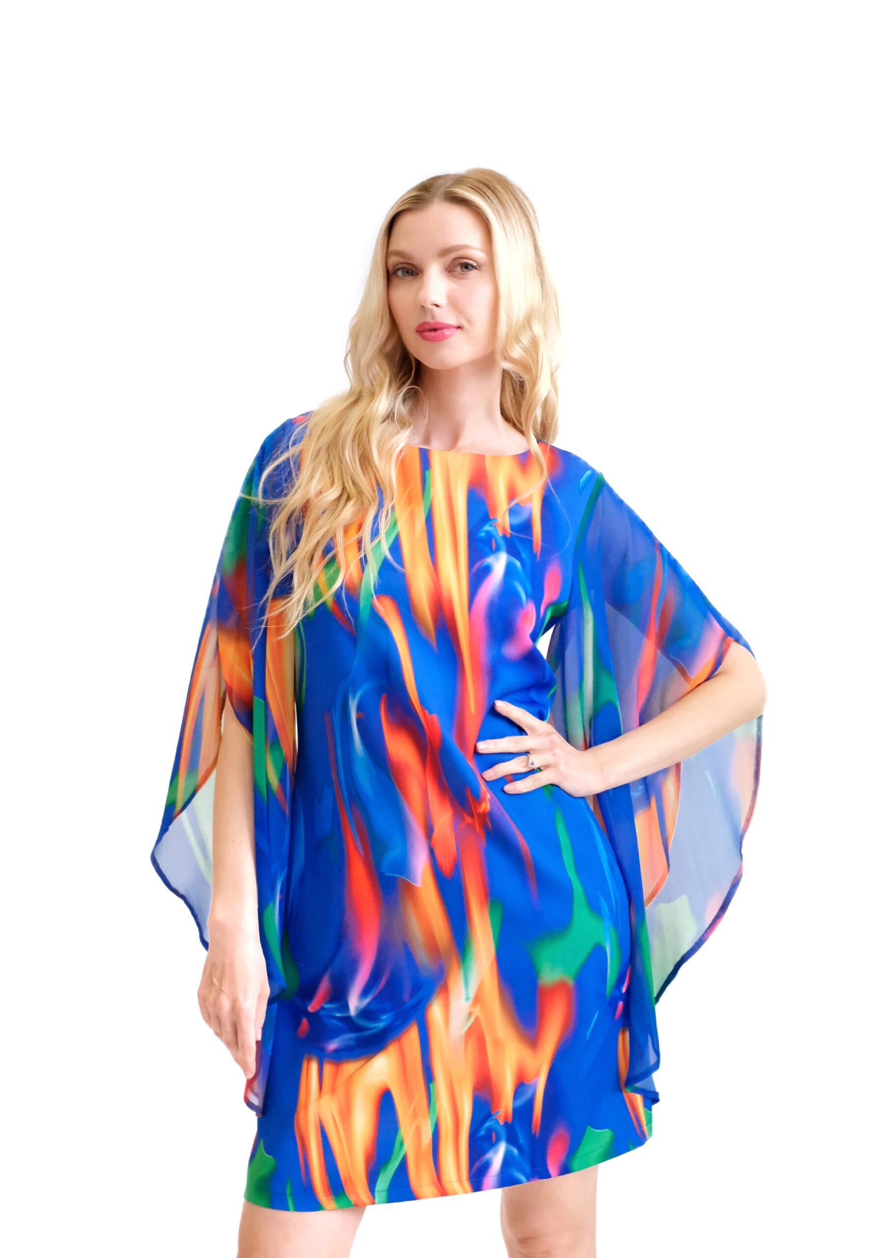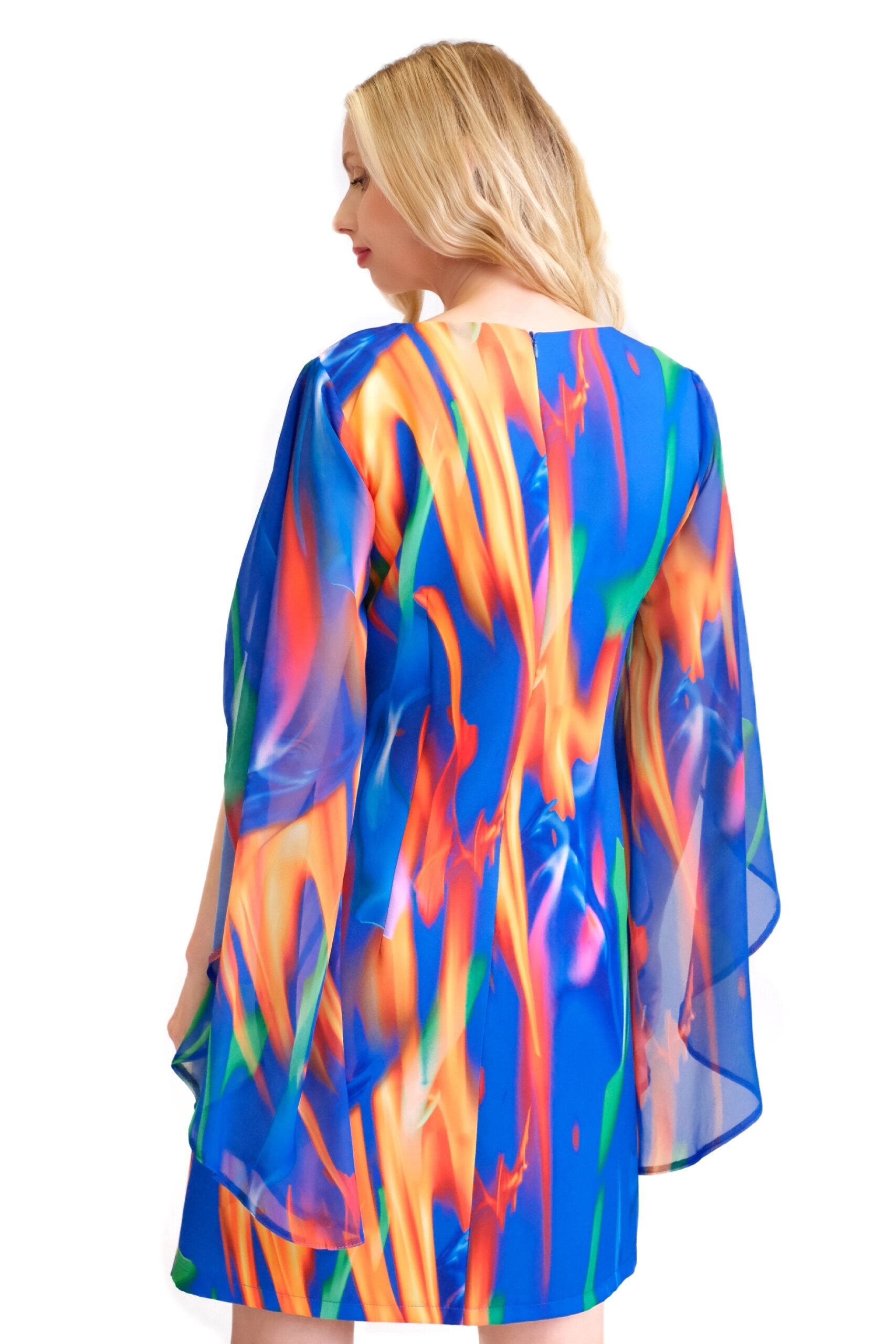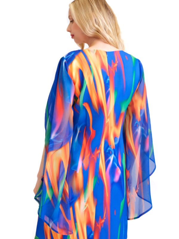 Šaty sú navrhnuté v jednoduchom áčkovom strihu, ktorý výborne sadne na každý typ postavy. Šaty sú ušité s ľahkými voľnými šifónovými rukávmi, ktoré im dodávajú na vzdušnosti a vytvárajú zaujímavú asymetrickú siluetu. Šaty majú zaujímavý vzor pripopominajúci plamene na vode. Kombinujte s červenými, zelenými alebo modrými doplnkami pre wau efekt.