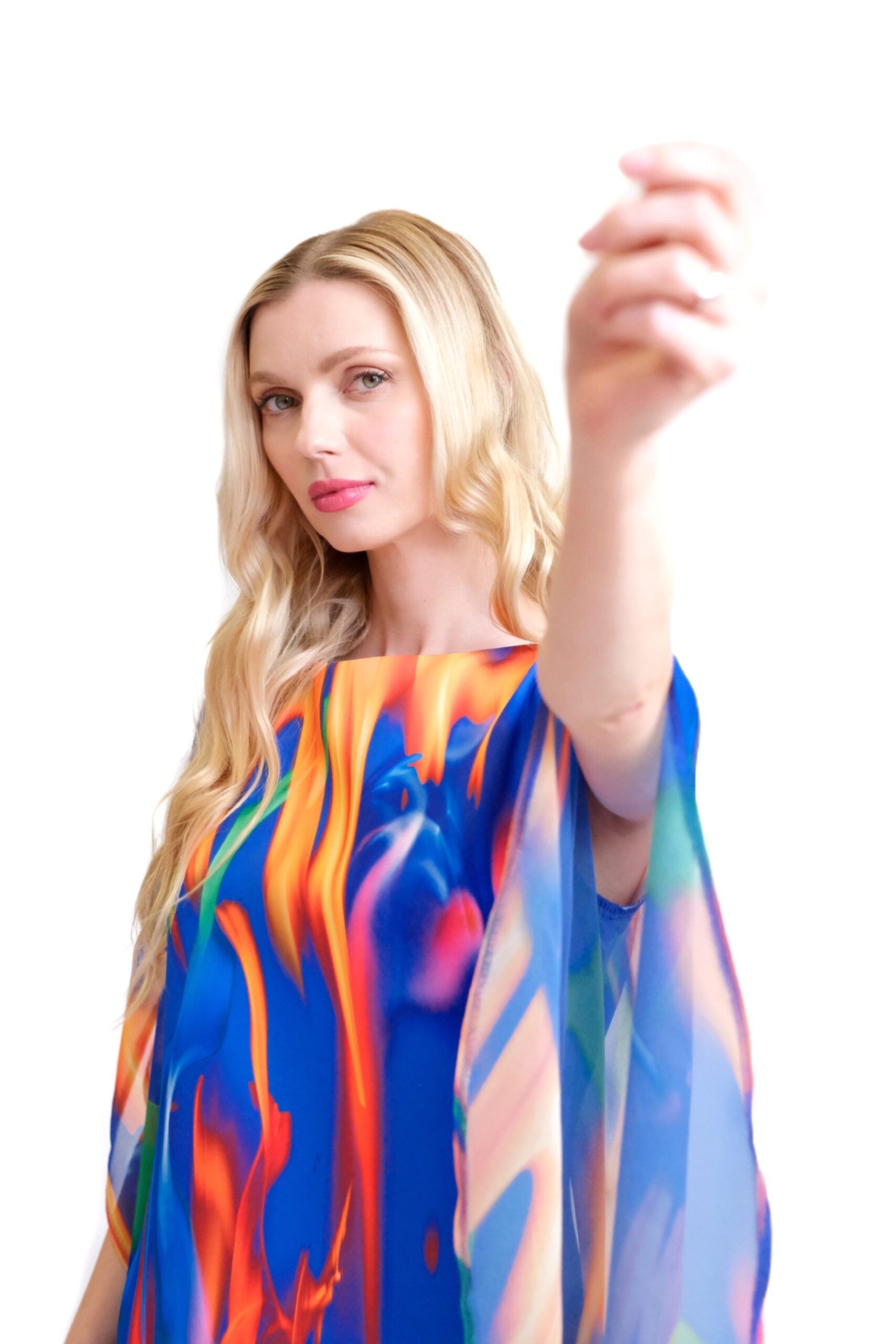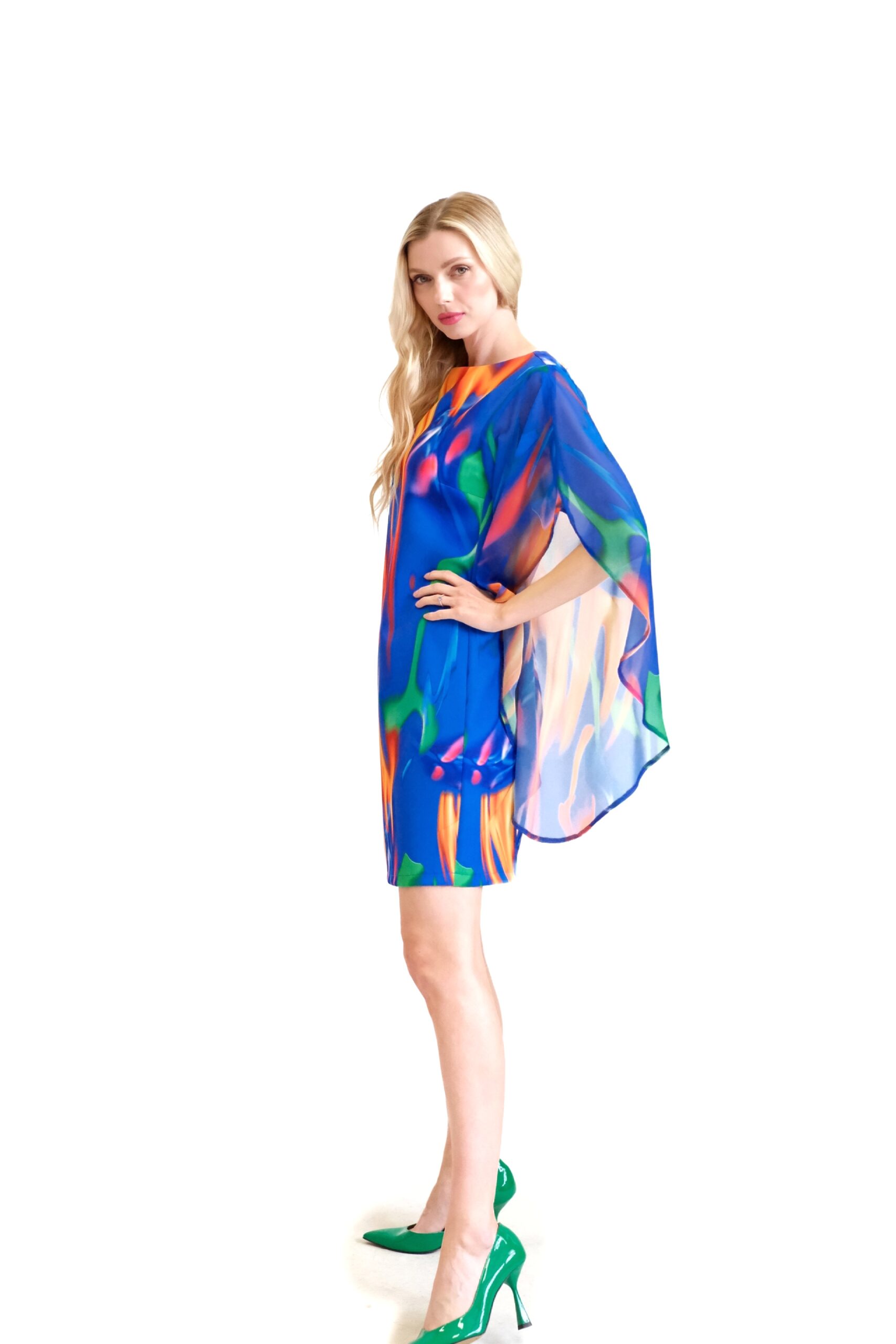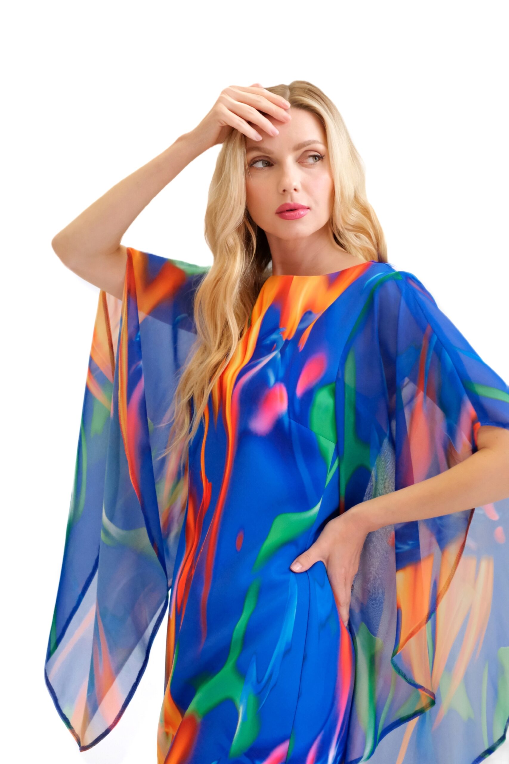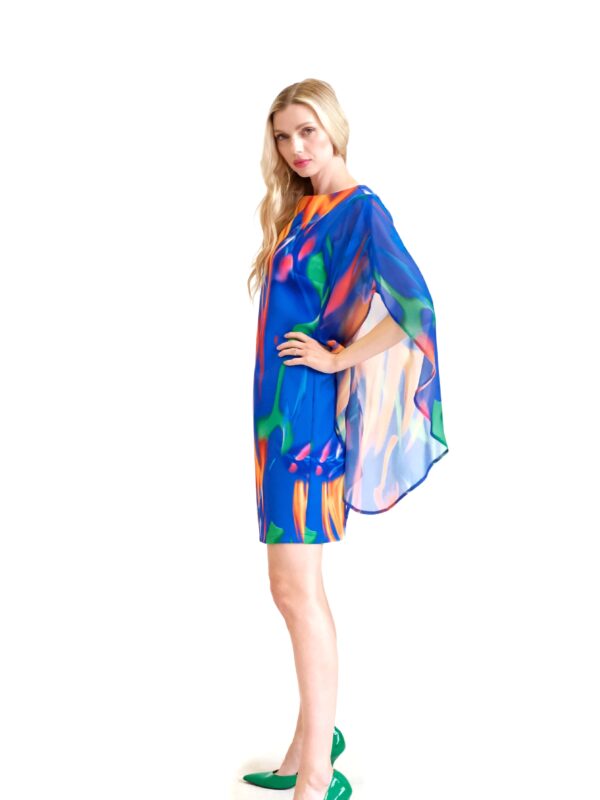 Šaty sú navrhnuté v jednoduchom áčkovom strihu, ktorý výborne sadne na každý typ postavy. Šaty sú ušité s ľahkými voľnými šifónovými rukávmi, ktoré im dodávajú na vzdušnosti a vytvárajú zaujímavú asymetrickú siluetu. Šaty majú zaujímavý vzor pripopominajúci plamene na vode. Kombinujte s červenými, zelenými alebo modrými doplnkami pre wau efekt.