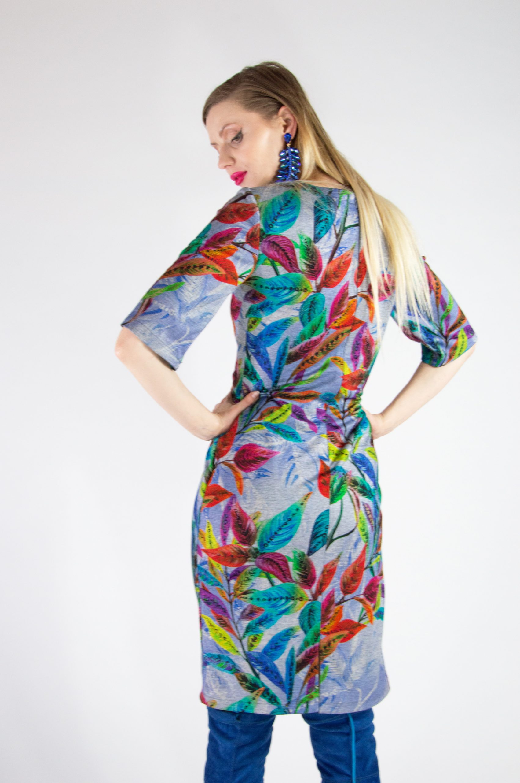 Šaty ušité v puzdrovom strihu z pohodlného a prispôsobivého strihu. Na šatách je zobrazený vzor jesenného lístia, ktorý hrá všetkými jesennými a zimnými farbami. Šaty sa výborne hodia na pracovný deň počas, ktorého sa v nich budete cítiť veľmi pohodlne.