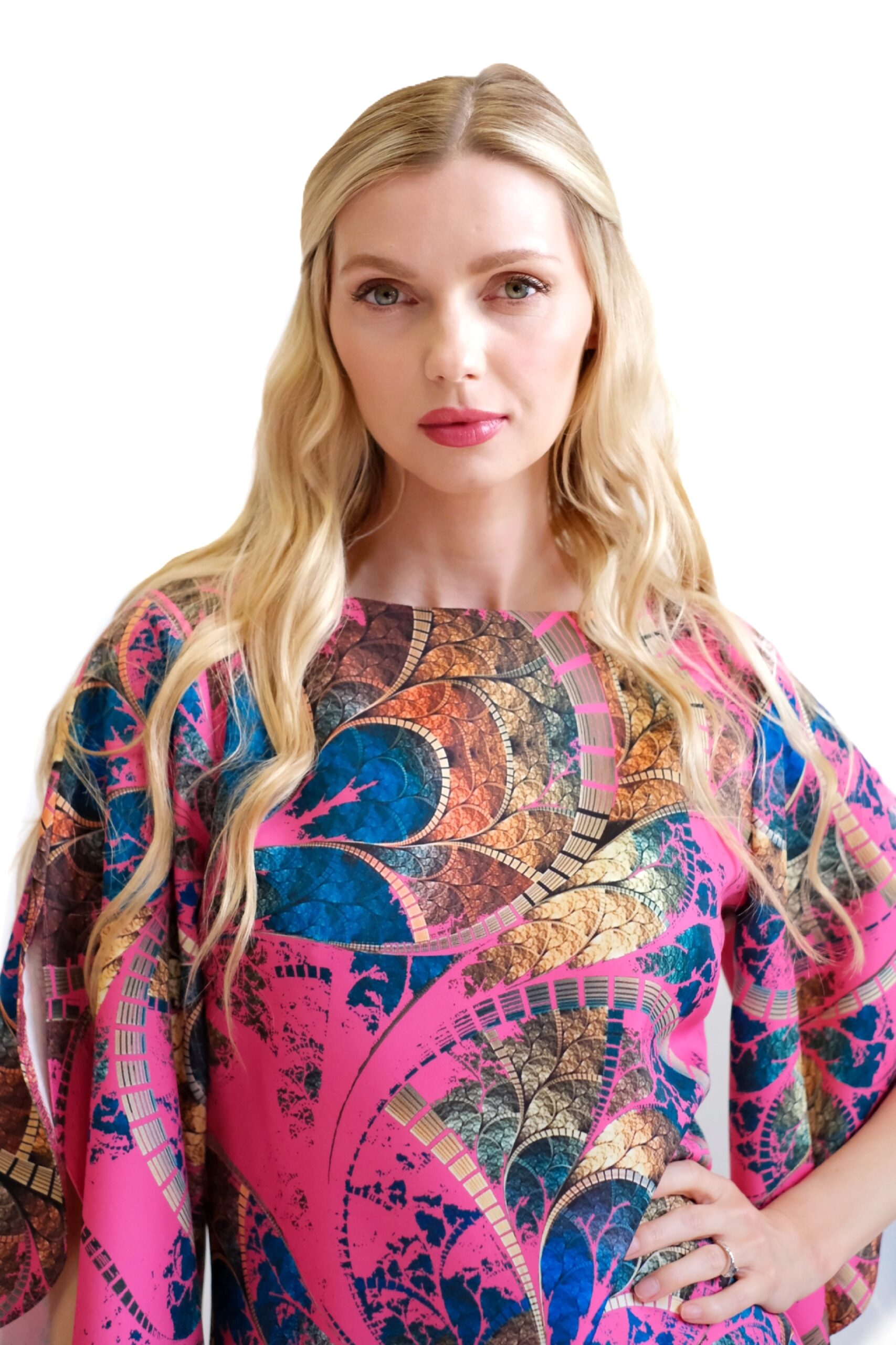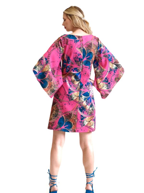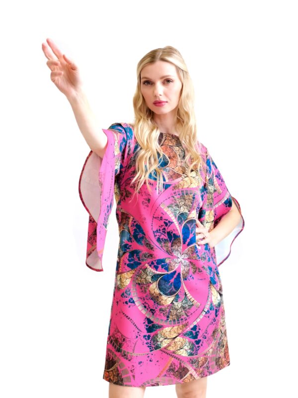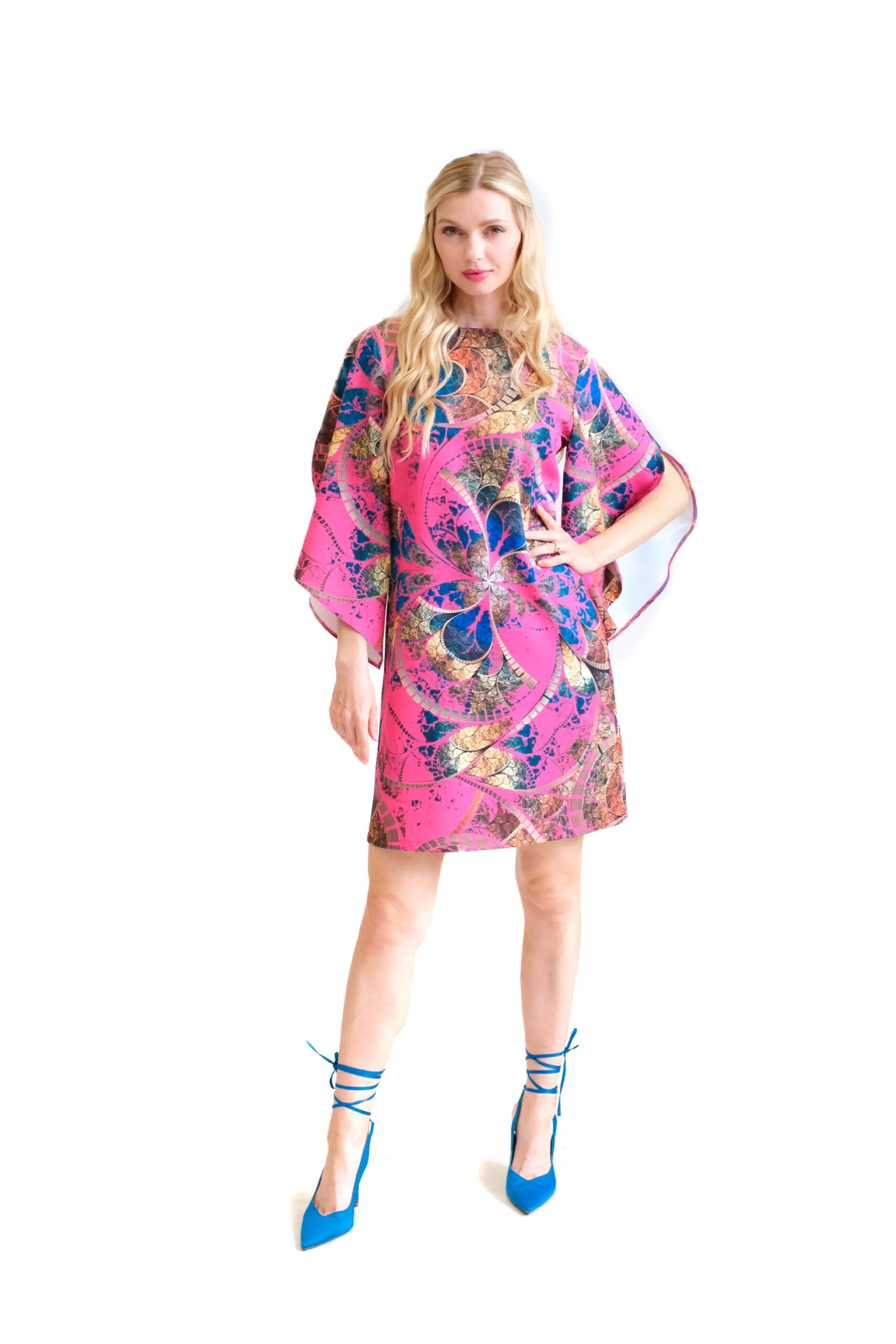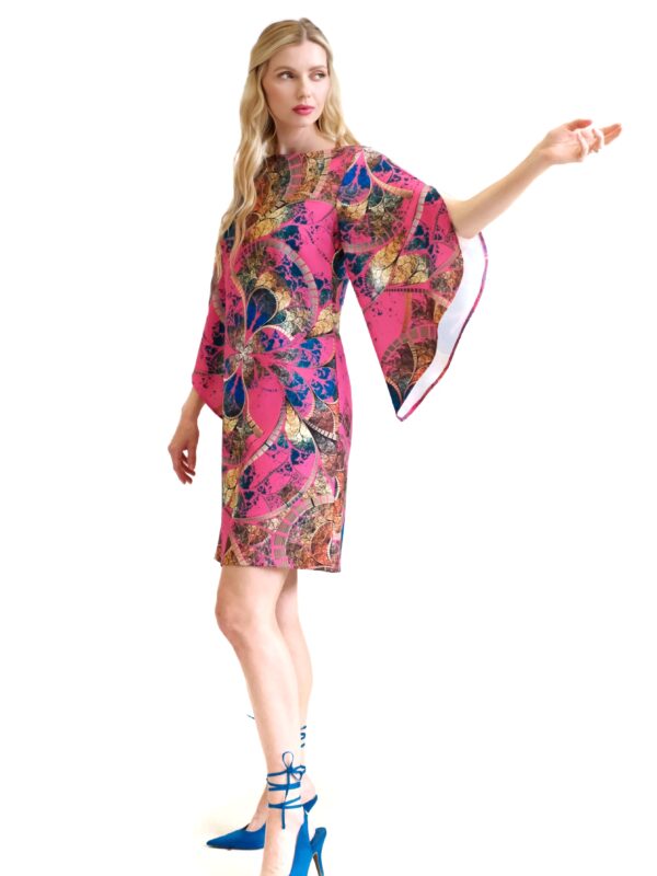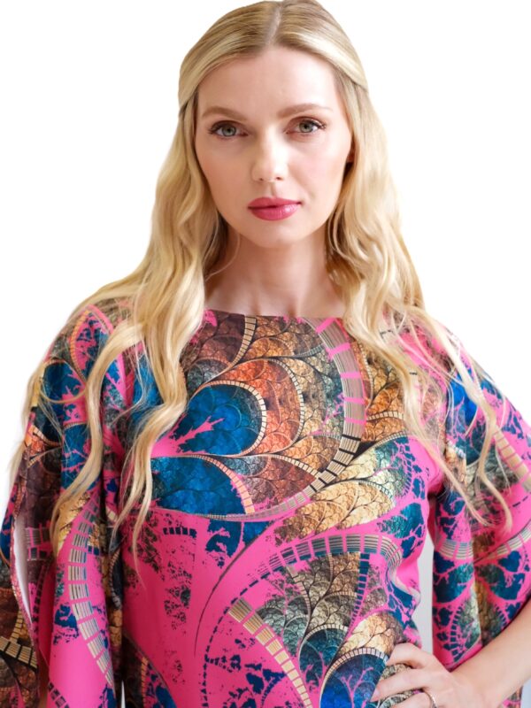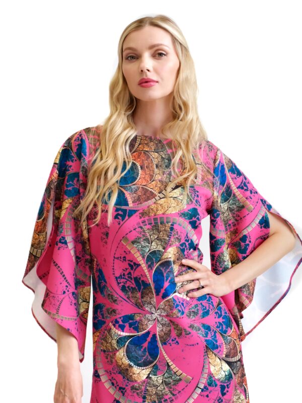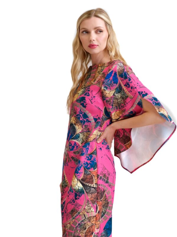 Šaty sú navrhnuté v jednoduchom áčkovom strihu, ktorý výborne sadne na každý typ postavy. Šaty majú asymetrické predlžené rukávy, ktoré im dodávaju na vzdušnosti a voľnosti. Najzaujímavejším prvkom šiat je výrazný vzor s cyklamémovým podkladom, ktorý je prepletený zlatými a modrými farbami. Kombinujte so zlatými alebo modrými doplnkami pre wau efekt.