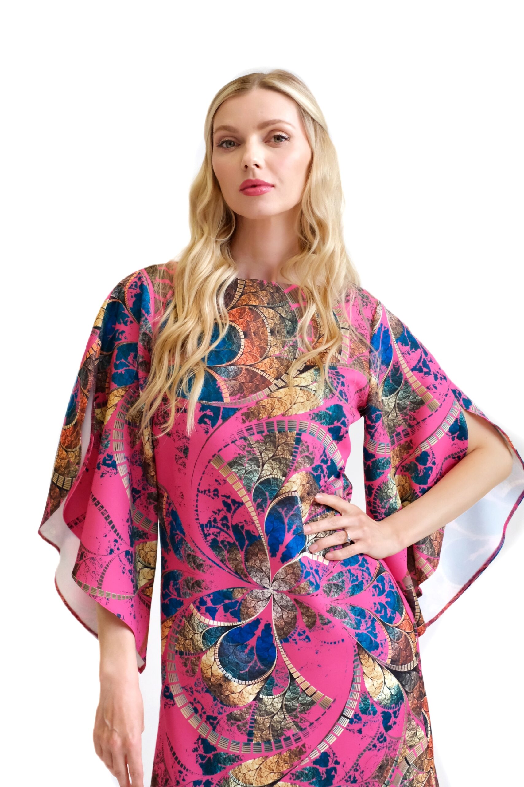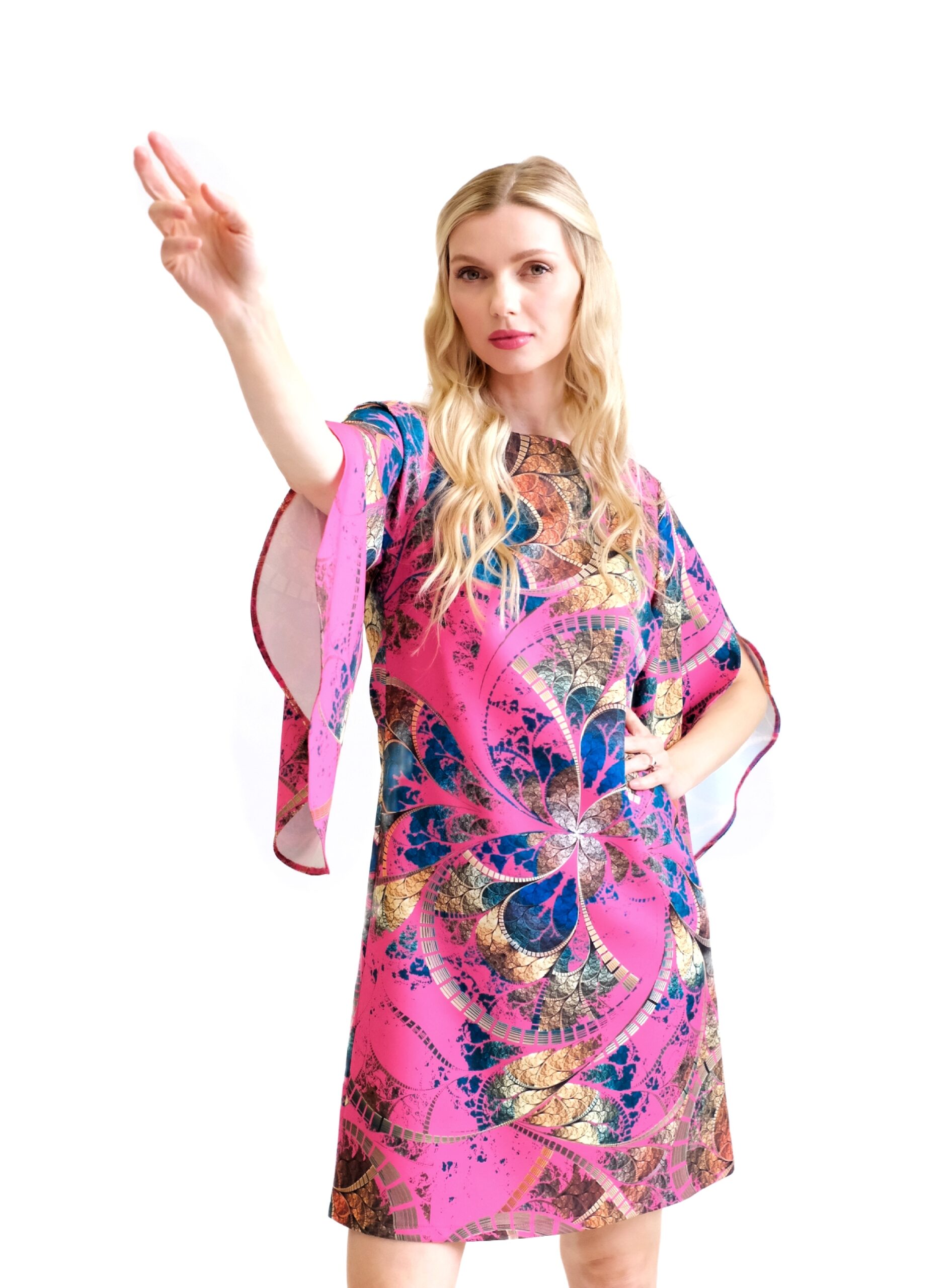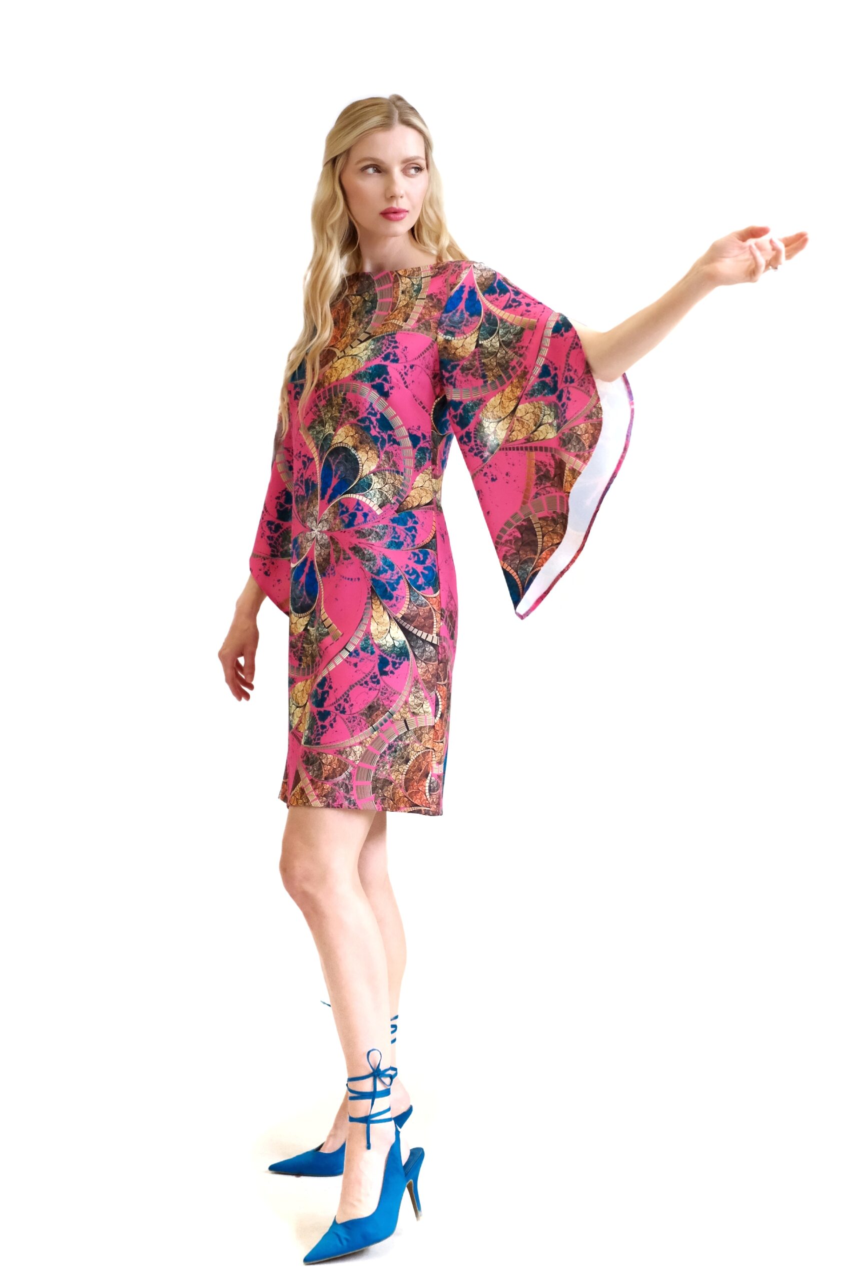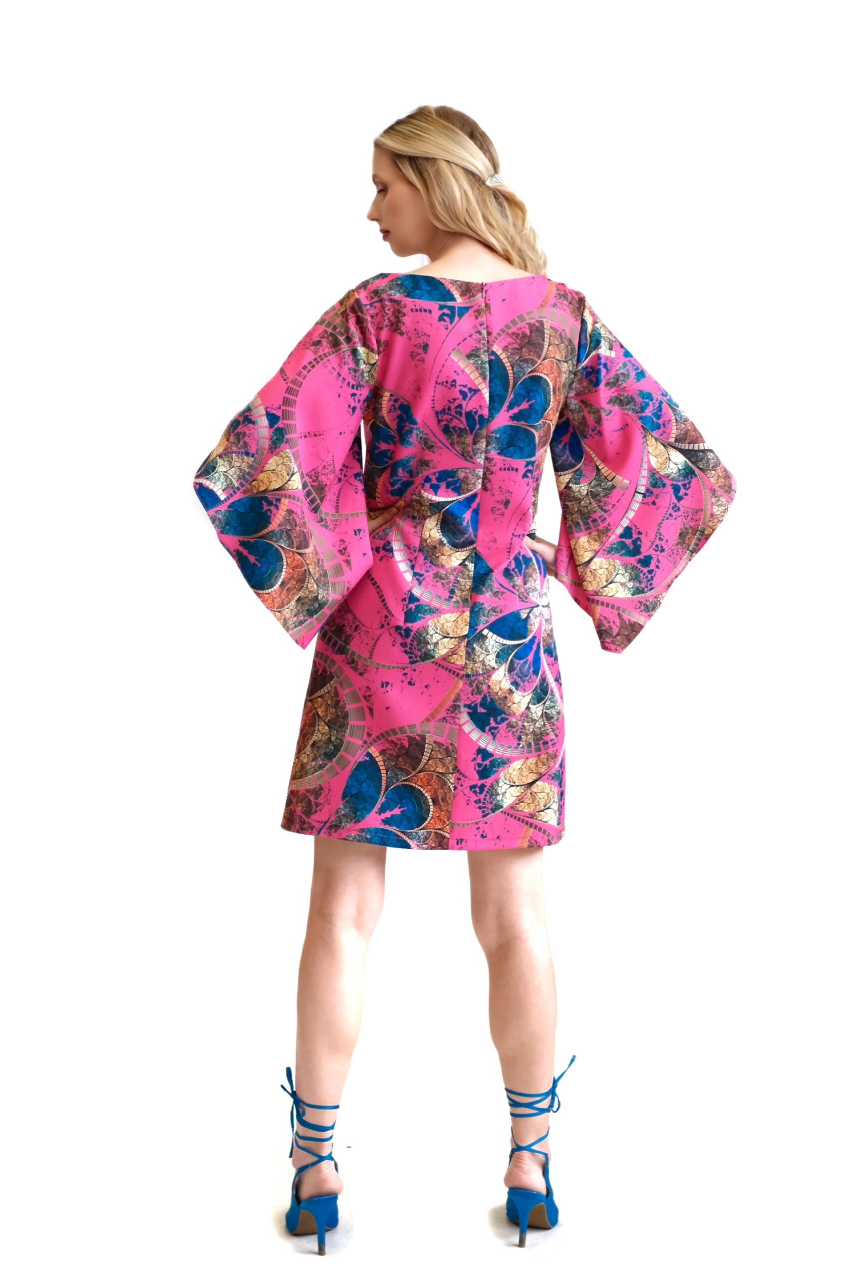 Šaty sú navrhnuté v jednoduchom áčkovom strihu, ktorý výborne sadne na každý typ postavy. Šaty majú asymetrické predlžené rukávy, ktoré im dodávaju na vzdušnosti a voľnosti. Najzaujímavejším prvkom šiat je výrazný vzor s cyklamémovým podkladom, ktorý je prepletený zlatými a modrými farbami. Kombinujte so zlatými alebo modrými doplnkami pre wau efekt.