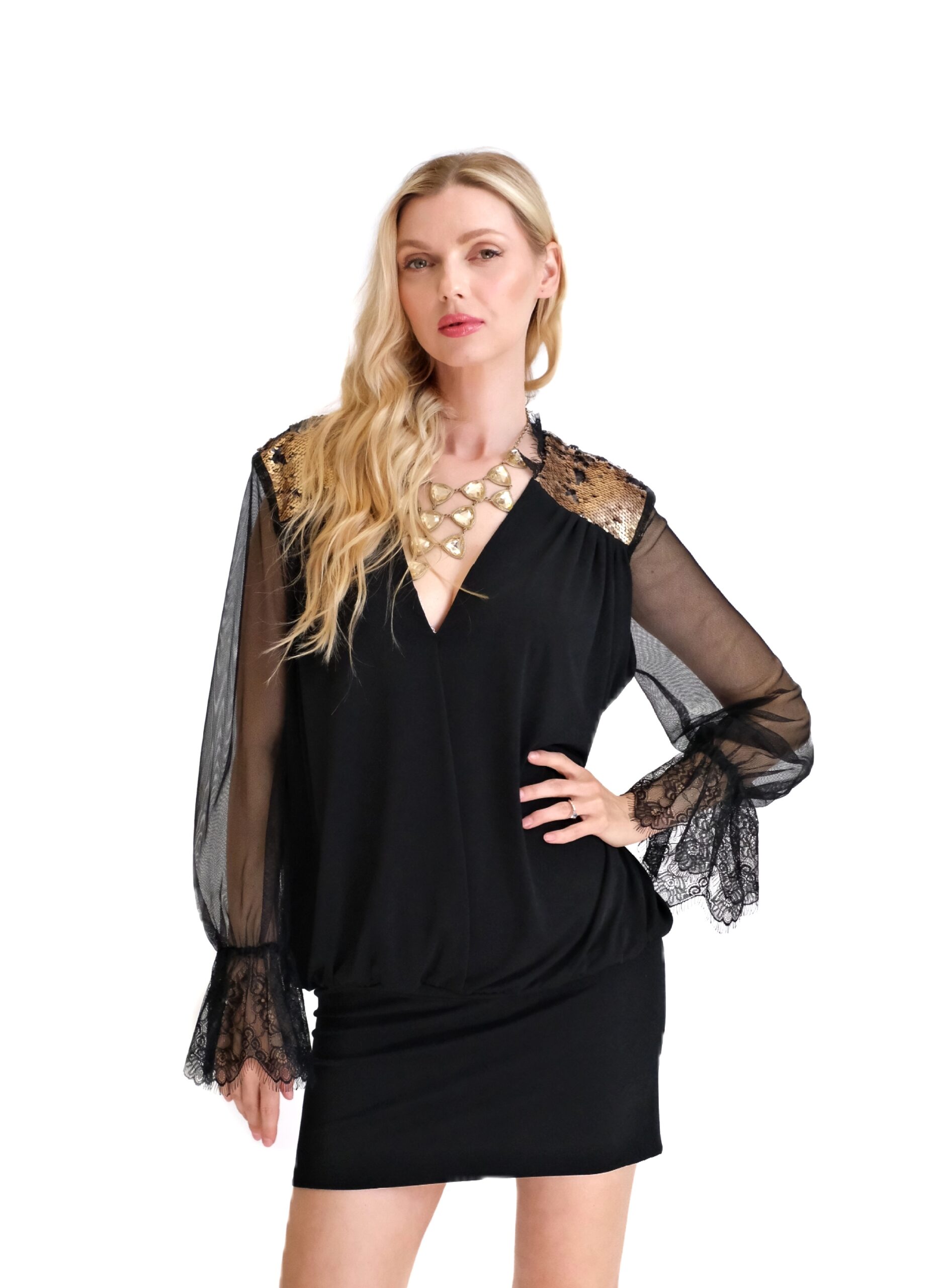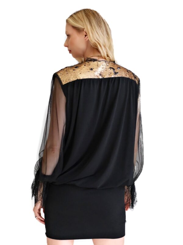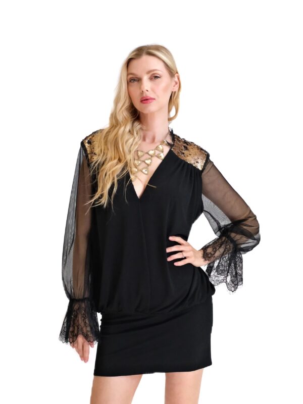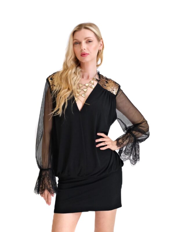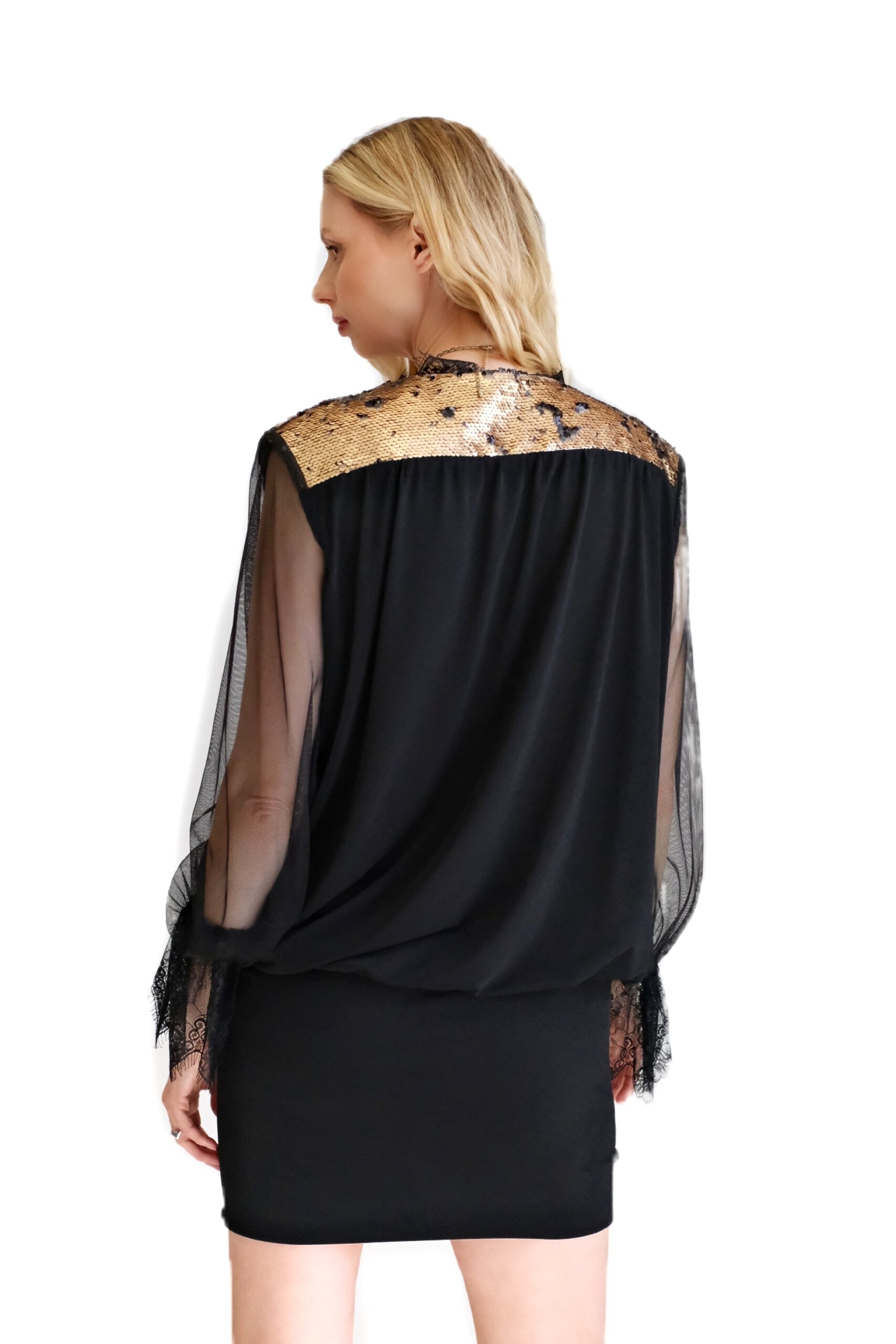 Šaty sú navrhnuté v pohodlnom tunikovom strihu a skvele sa hodia na všetky príležitosti. Suknicu tvorí elastický úplet, ktorý výborne sadne na postave. Šaty majú jemné šifónové rukávy , čo im dodáva na vzdušnosti. Zaujímavým detailom je zlatá aplikácia na ramenách. Šaty sa skvele hodia na všetky druhy spoločenských udalostí. Kombinujte so zlatými doplnkami.