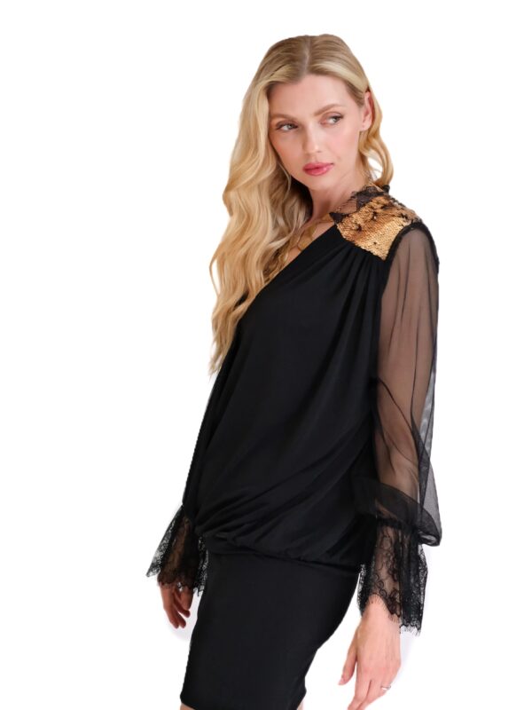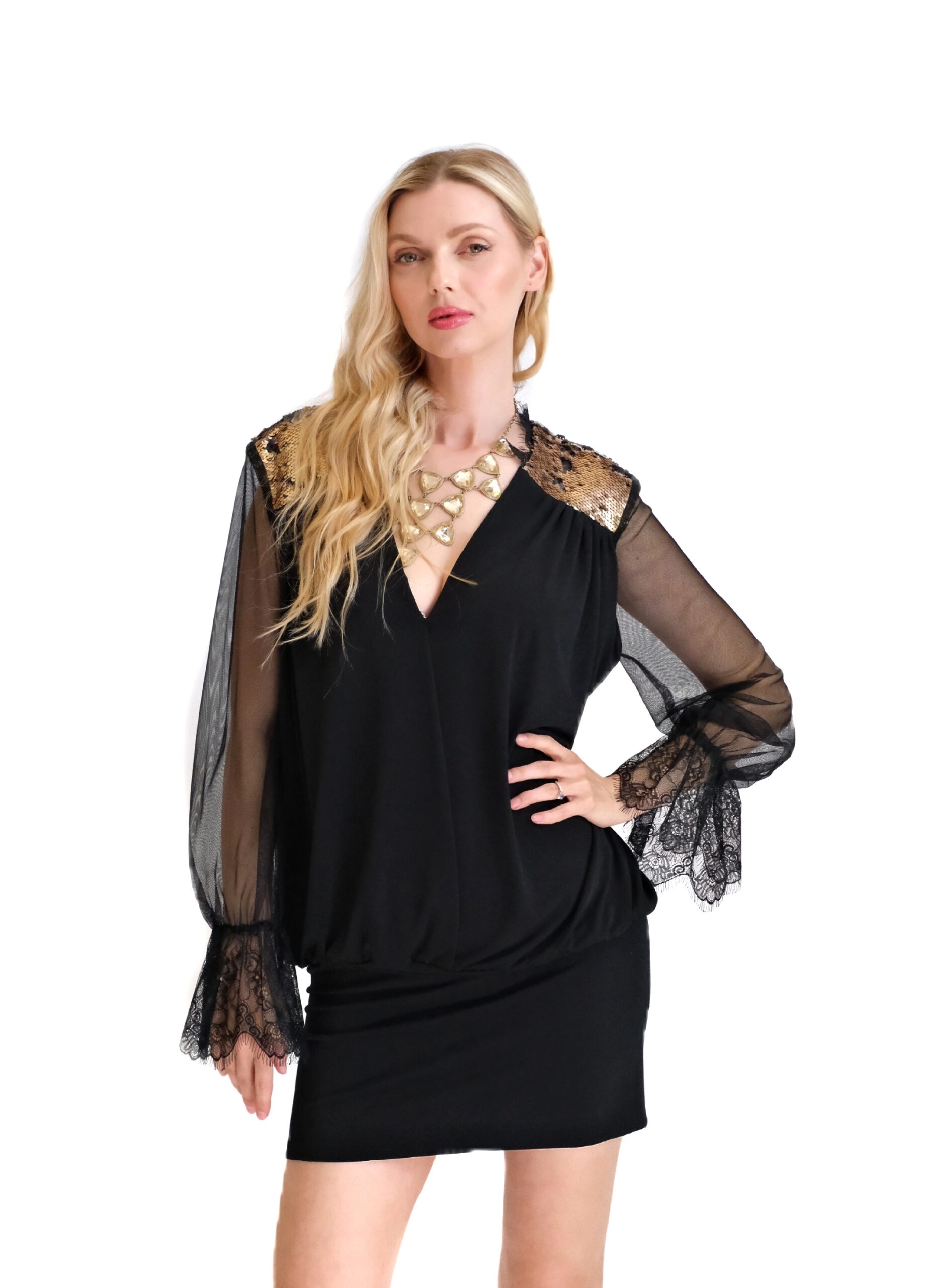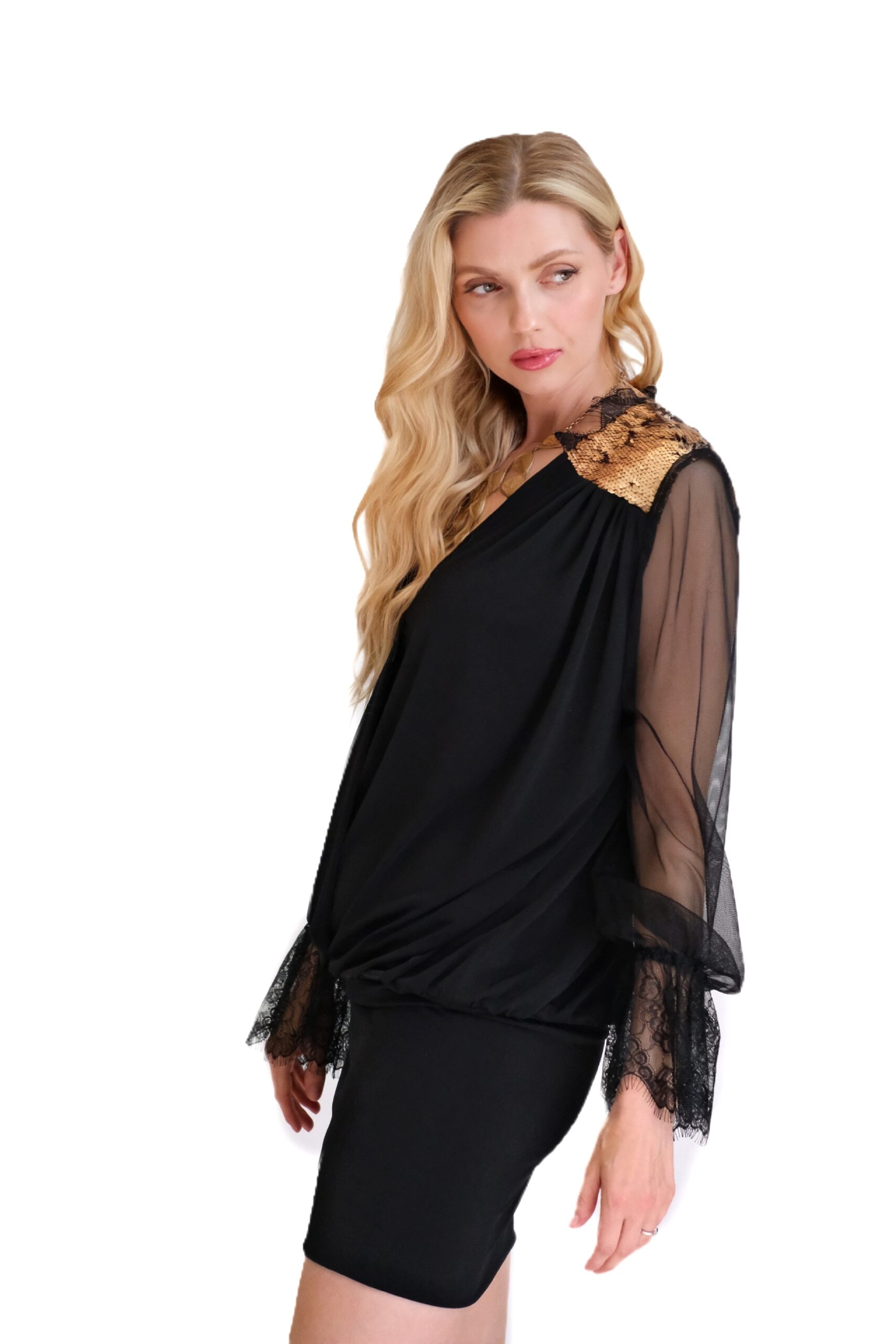 Šaty sú navrhnuté v pohodlnom tunikovom strihu a skvele sa hodia na všetky príležitosti. Suknicu tvorí elastický úplet, ktorý výborne sadne na postave. Šaty majú jemné šifónové rukávy , čo im dodáva na vzdušnosti. Zaujímavým detailom je zlatá aplikácia na ramenách. Šaty sa skvele hodia na všetky druhy spoločenských udalostí. Kombinujte so zlatými doplnkami.