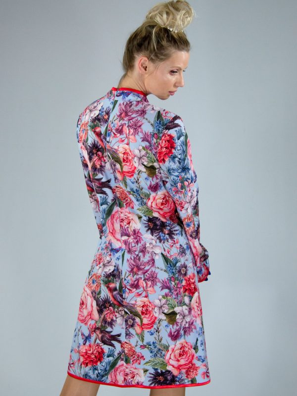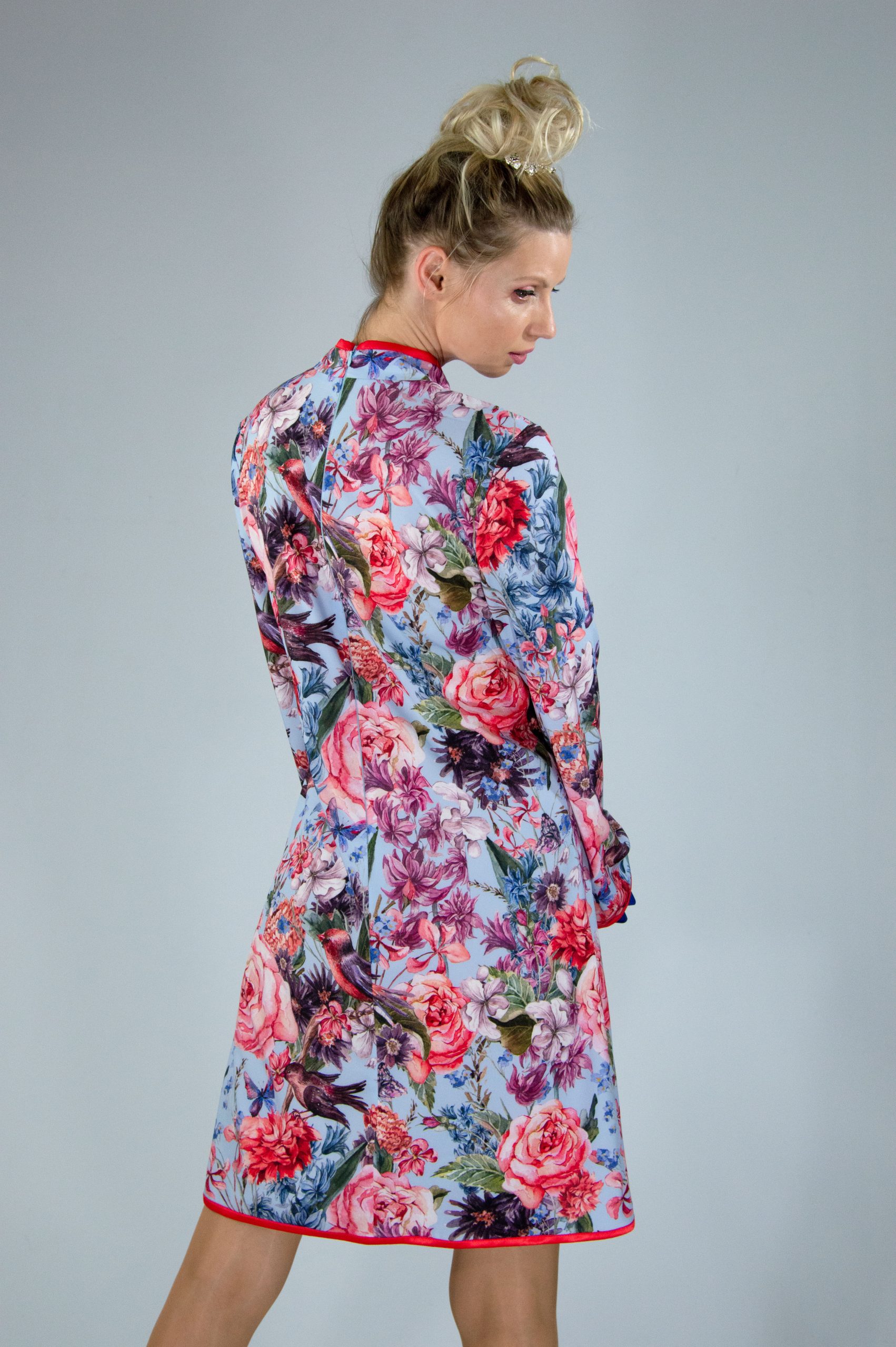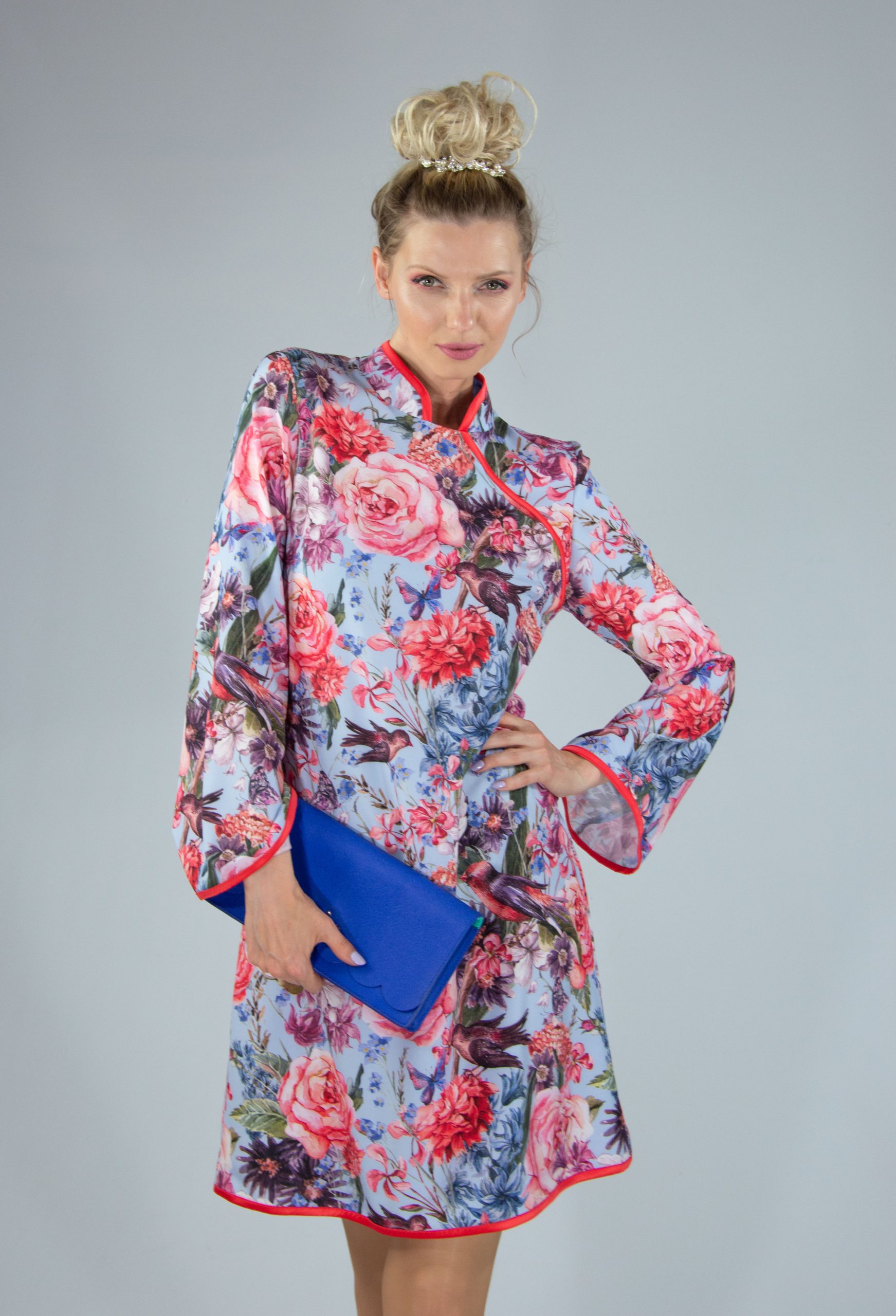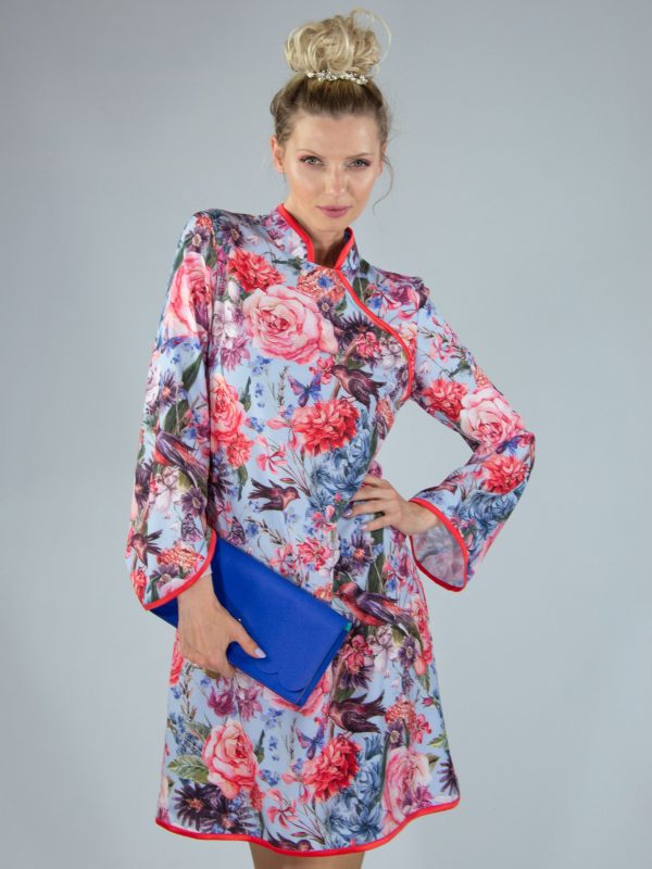 Šaty sú ušité v áčkovom strihu, ktorého pôvod sa dá odvodiť až do ďalekého Orientu. Strih je pekne vyzdvihnutý kontrastnou oranžovou, ktorá pastelový podklad šiat oživuje. V týchto šatách sa snúbi výnimočný strih s výnimočným letným motívom. Vzor na šatách má nebeský modrý podklad a nádych orientálneho motívu. Šaty ľahko skombinujete so všetkými odtieňmi ružovej , červenej, modrej farby a oranžovej farby.