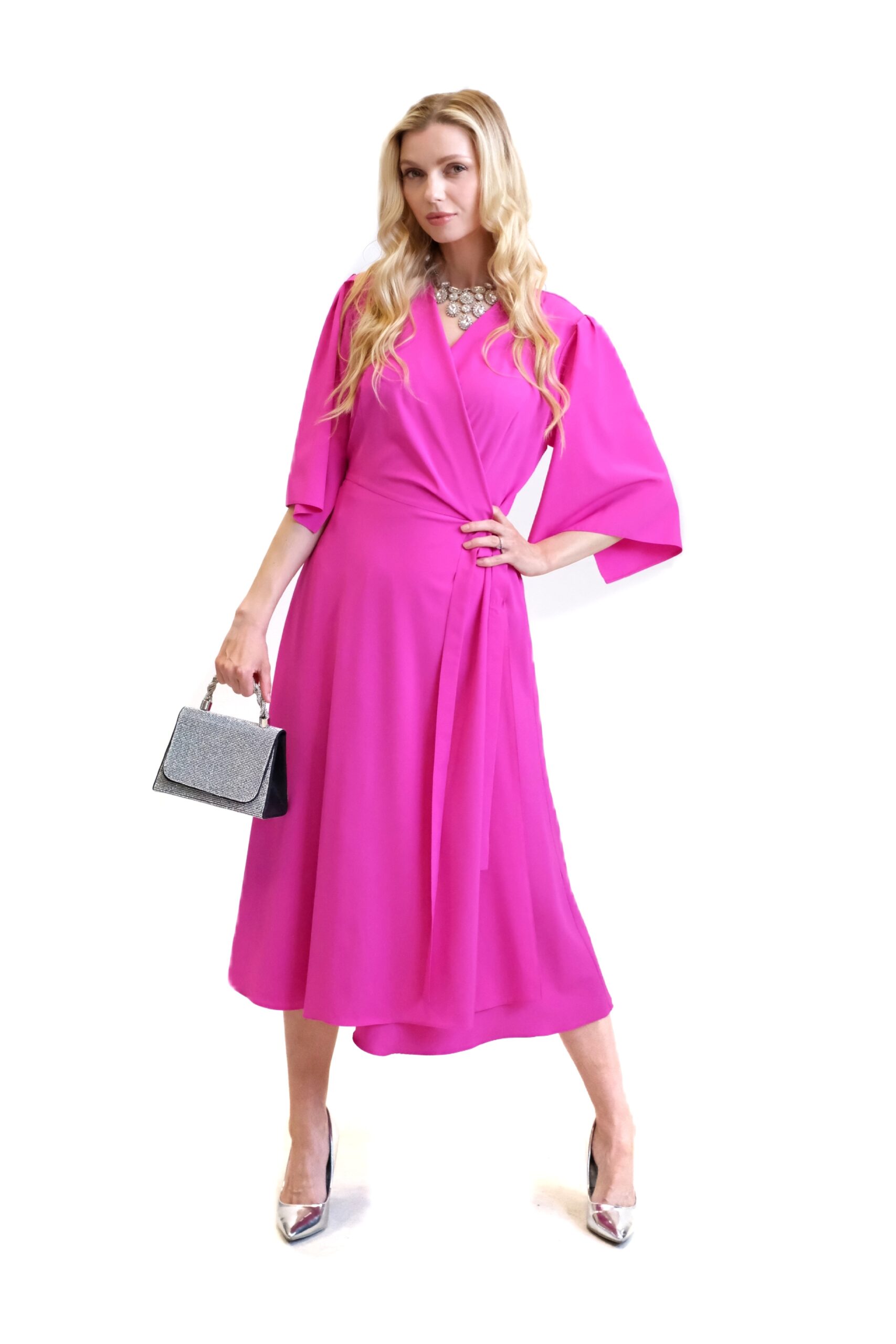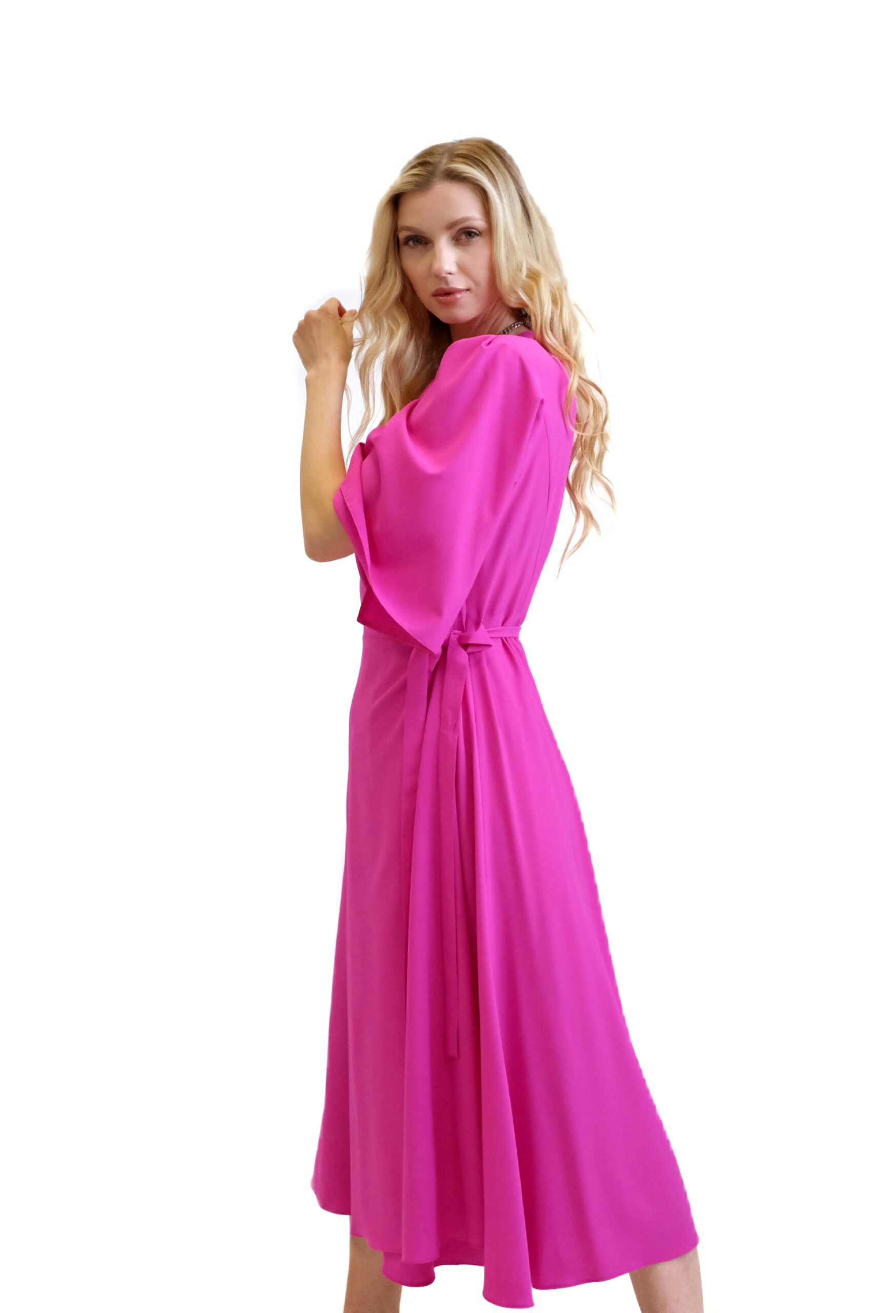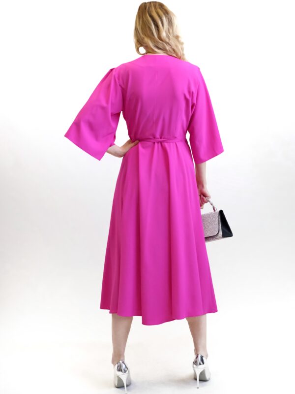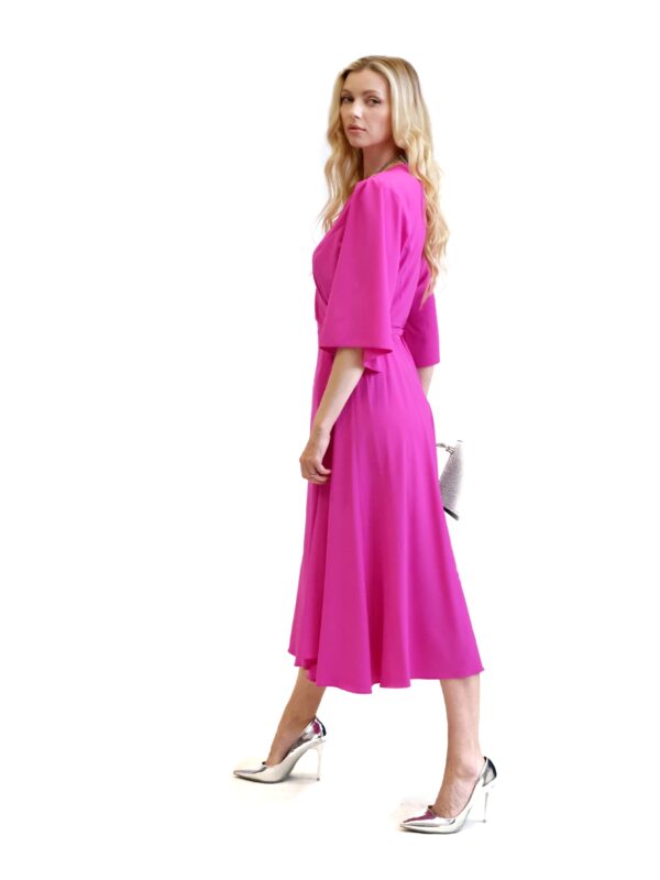 Šaty sú ušité v mimoriadne pohodlnom zavinovaciom strihu, ktorý skvele sadne na každý typ postavy. Jednoduchý strih šiat necháva naplno vyniknúť výraznej rúžovej farbe , v ktorej budete nepriehliadnuteľná. Šaty sú ušité v dĺžke midi a majú voľné rukávy, ktoré im dodávajú na vzdušnosti. Šaty kombinujte so striebornými, modrými alebo žltými doplnkami.