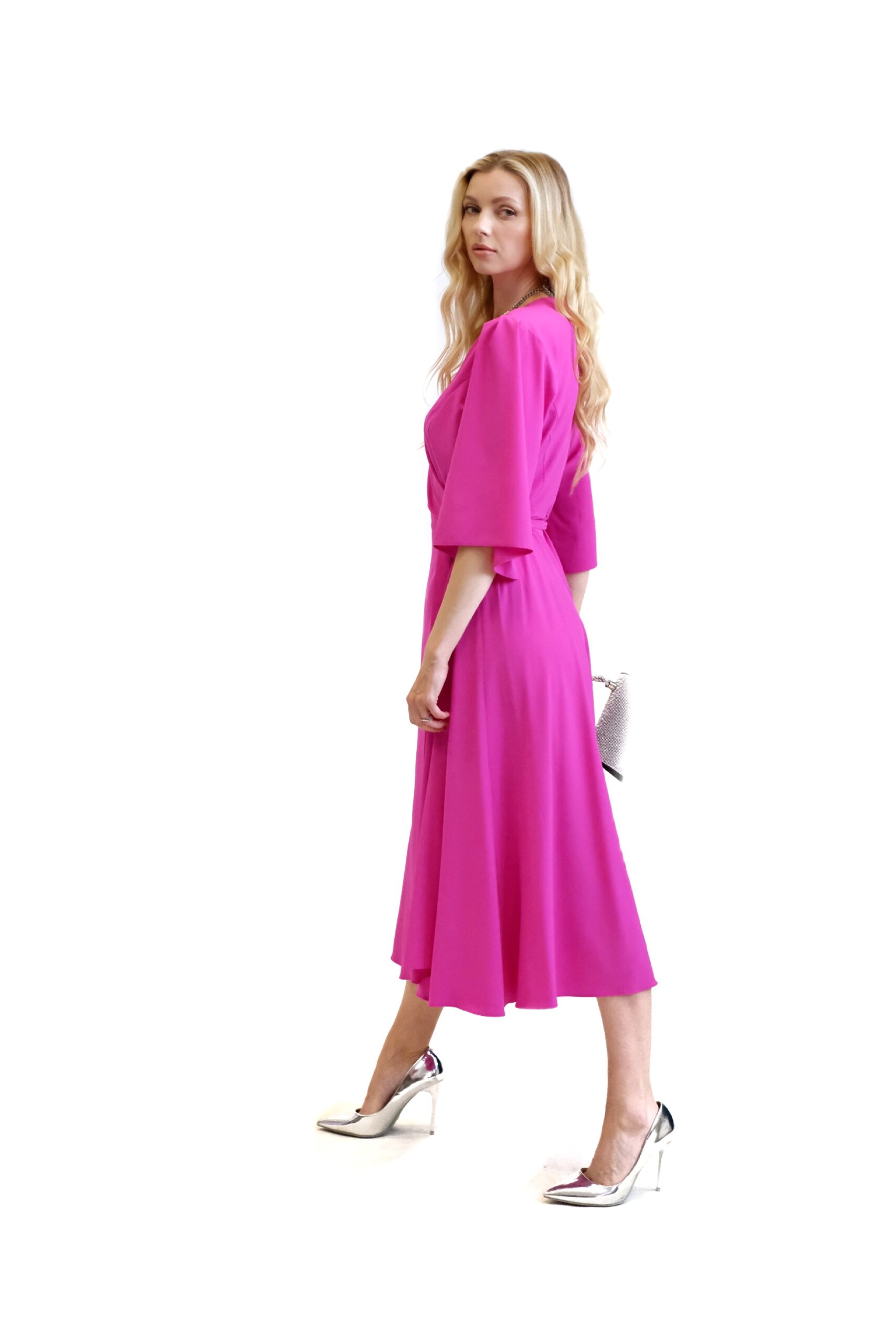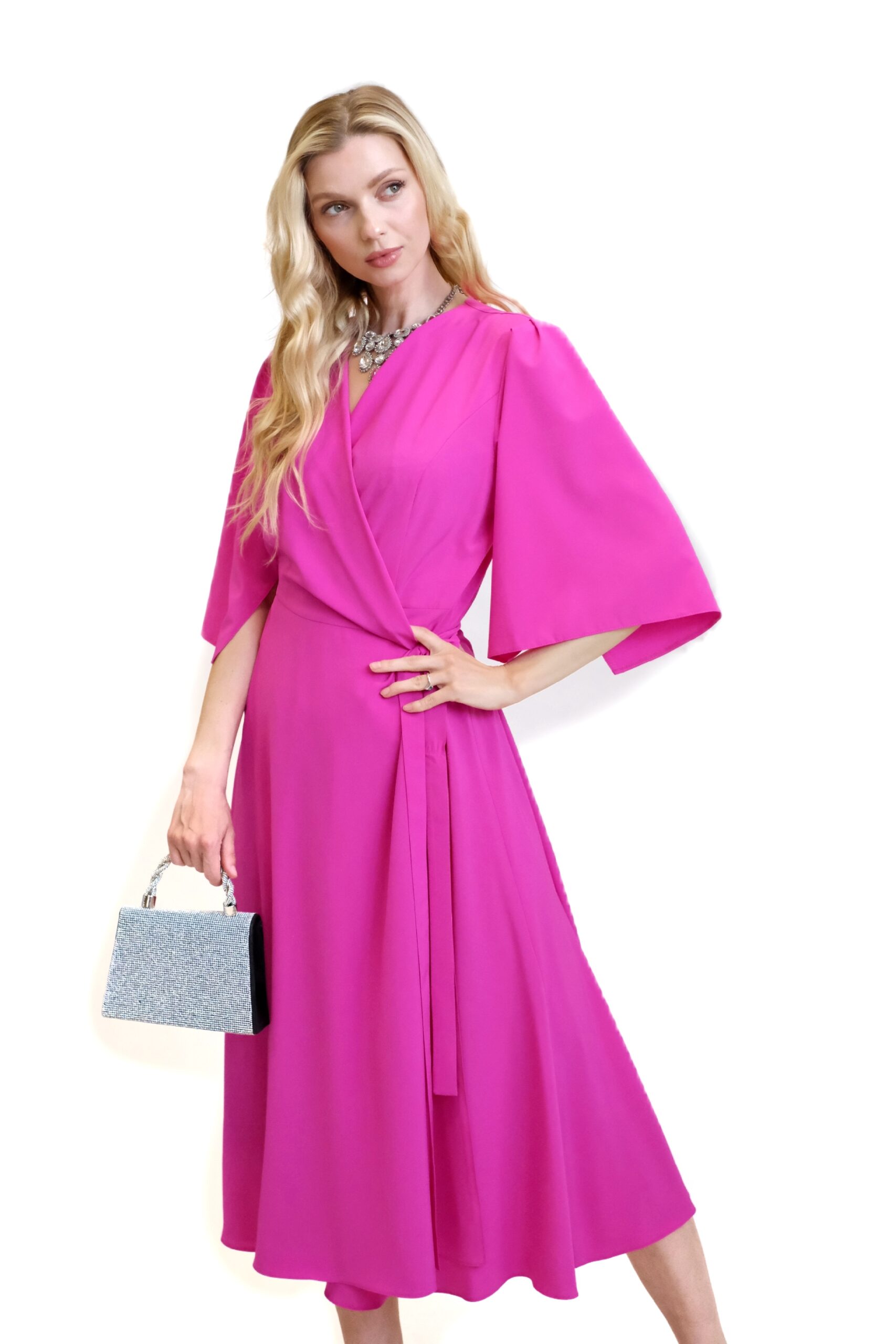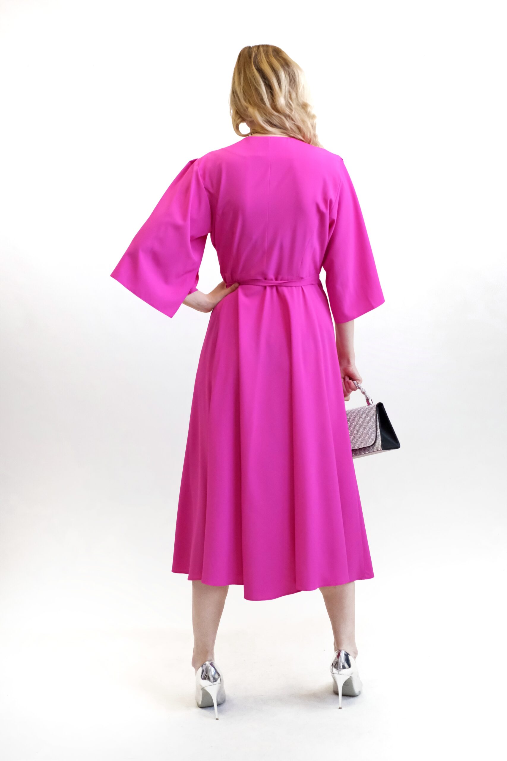 Šaty sú ušité v mimoriadne pohodlnom zavinovaciom strihu, ktorý skvele sadne na každý typ postavy. Jednoduchý strih šiat necháva naplno vyniknúť výraznej rúžovej farbe , v ktorej budete nepriehliadnuteľná. Šaty sú ušité v dĺžke midi a majú voľné rukávy, ktoré im dodávajú na vzdušnosti. Šaty kombinujte so striebornými, modrými alebo žltými doplnkami.