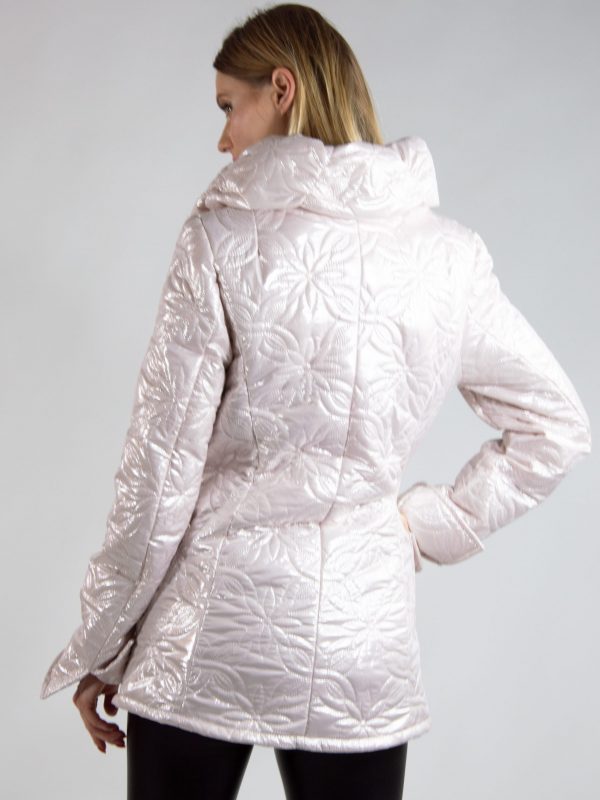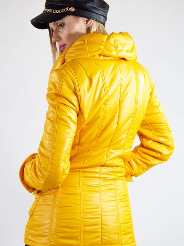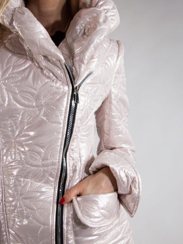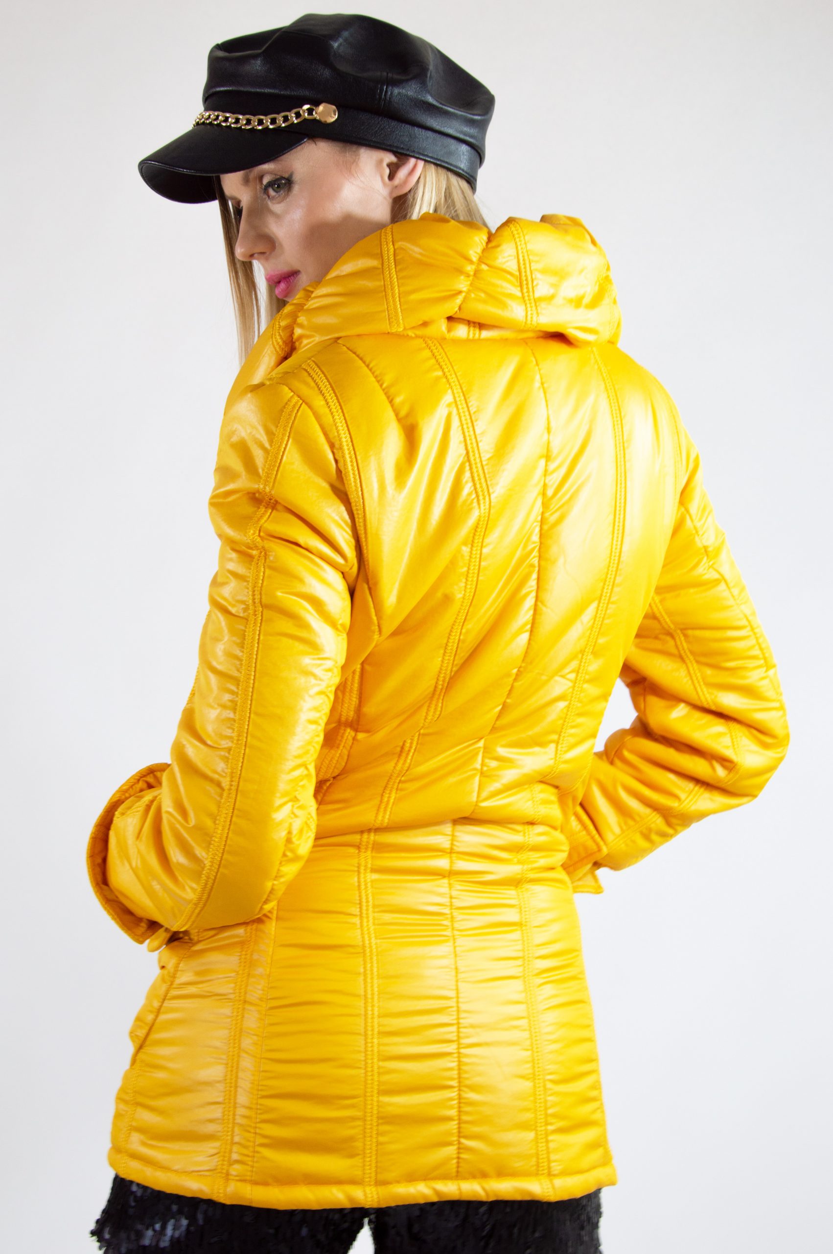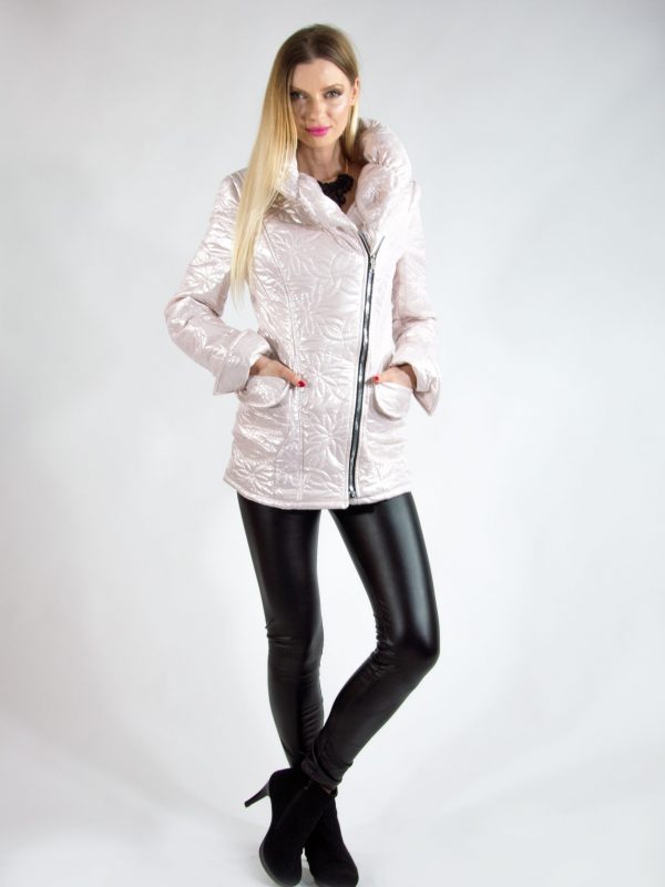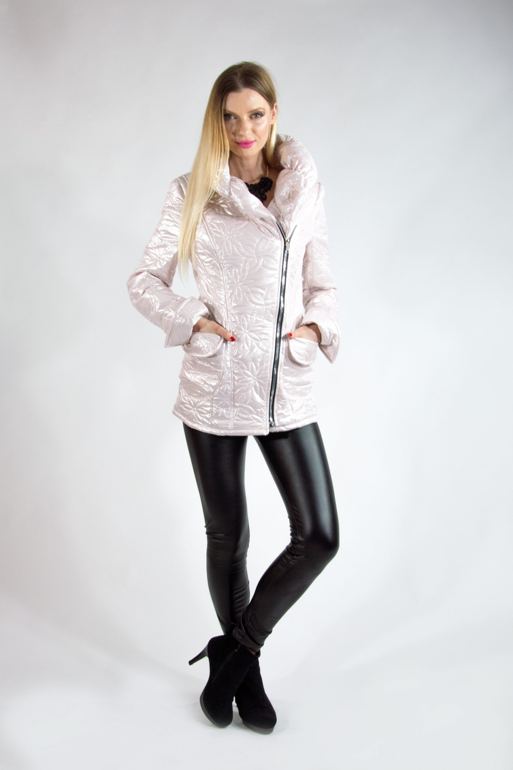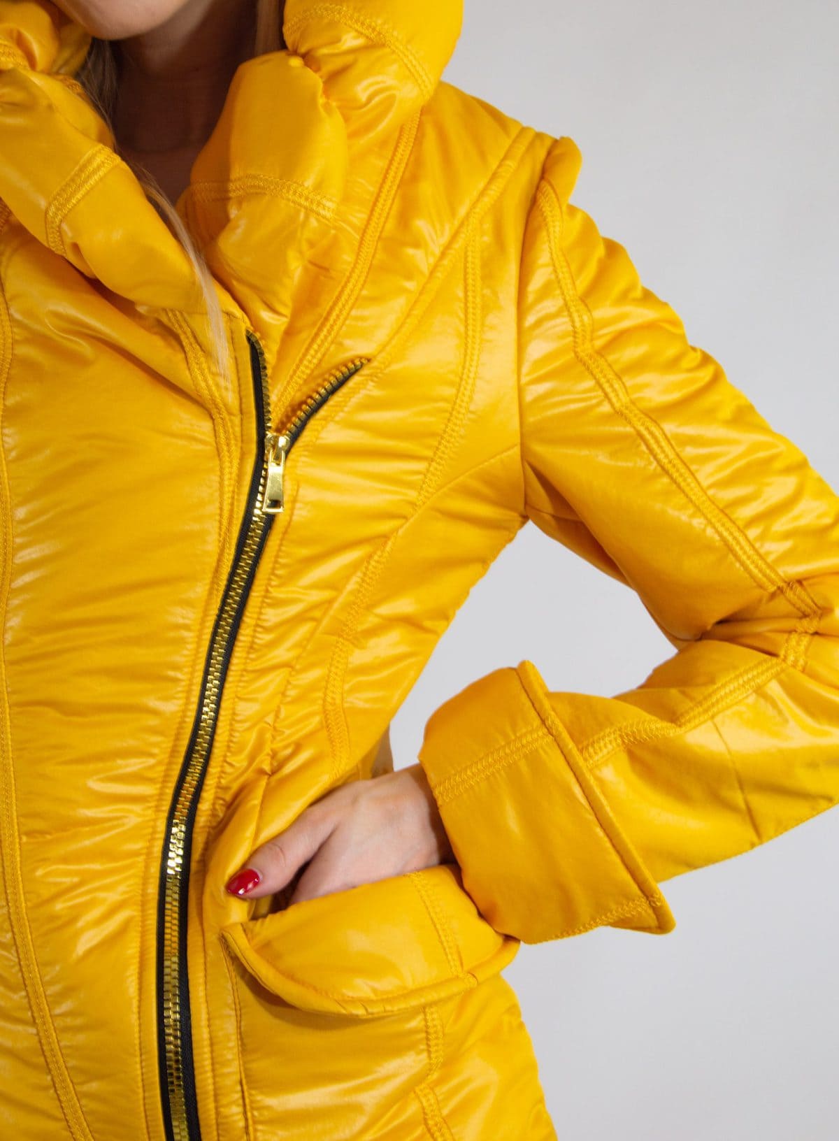 Zaujímavý materiál v ešte zaujímavejšom strihovom prevedení . Na bunde Vás zaujme bohato navrhnutý golier, ktorý dodáva bunde šmrnc a honosnosť. Šikmo našitý zips len umocňuje rafinovaný strih, ktorý opticky zúži postavu. Bunda je dostupná vo výraznej žltej farbe a v perleťovo ružovej.