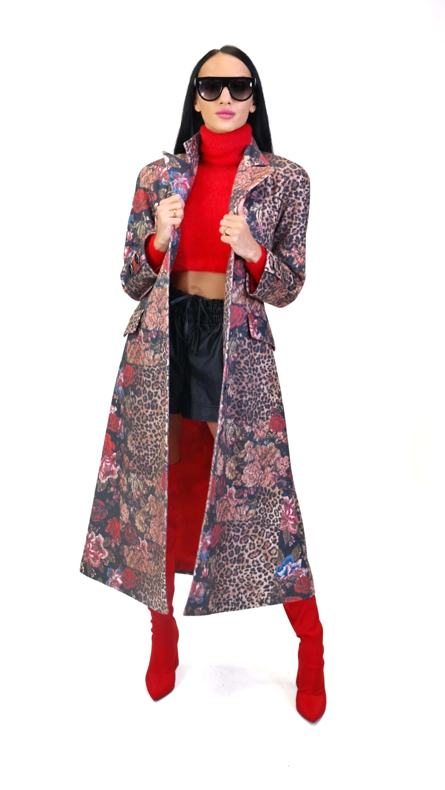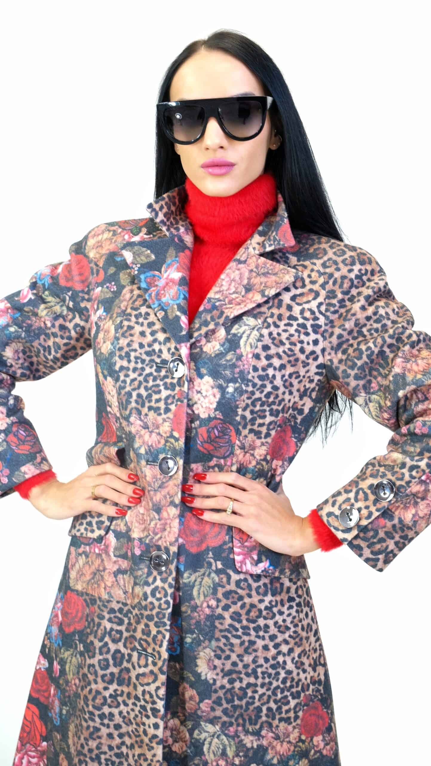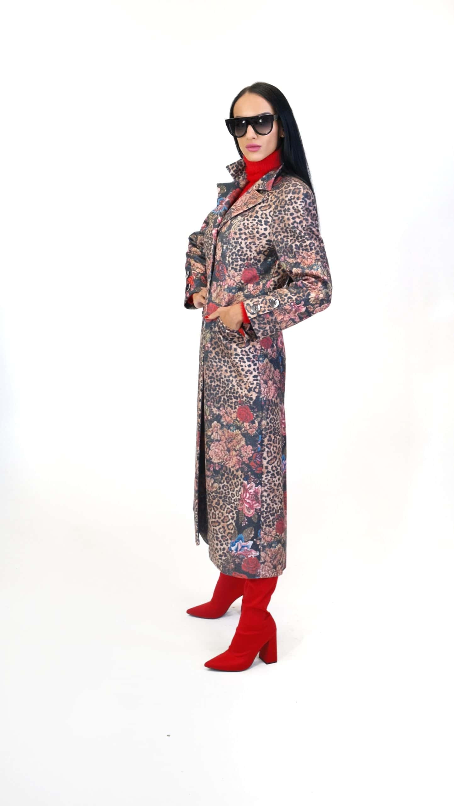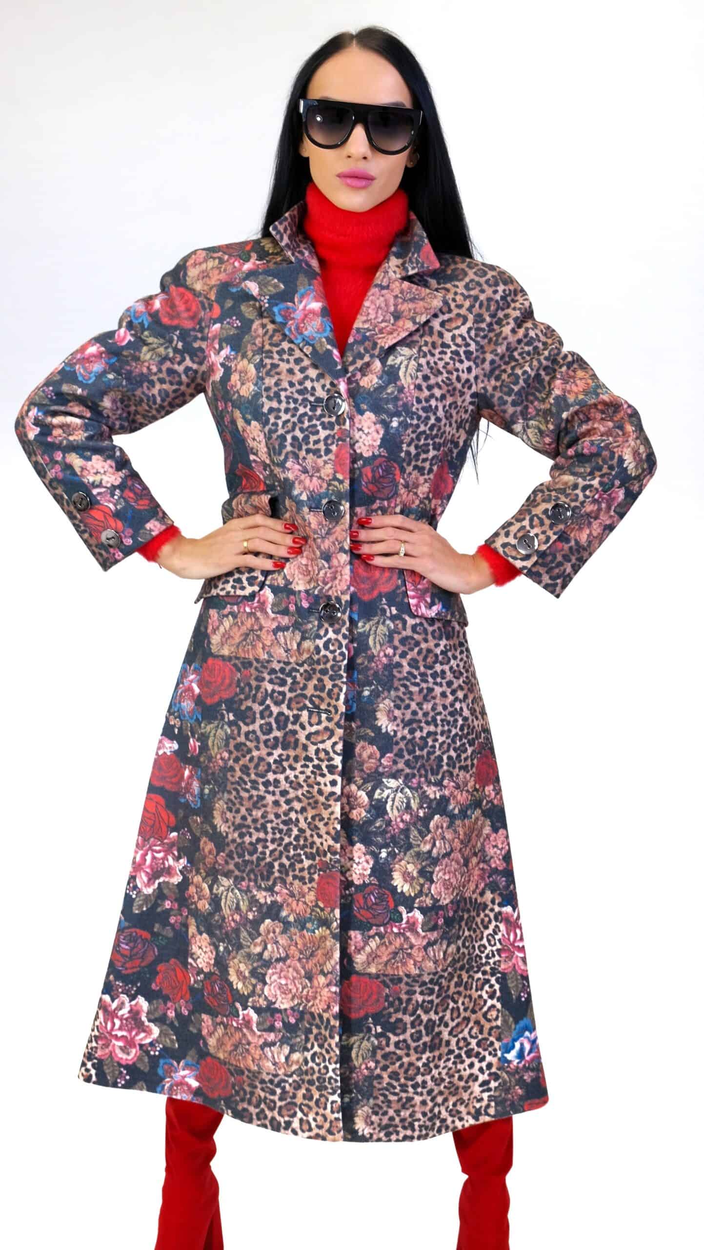 Kabát je navrhnutý v strihu, ktorý je prepracovaný do posledného detailu a skvele sadne na Vašu postavu, zároveň je kabát dlhý a zakryje každé šaty. Už 25 rokov naša rodinná značka vyrába kabáty najvyššej kvality s precíznym vypracovaním. Kabát je využený v páse a pekne sadne na Vašu postavu. Kabát má malú fazónu a opticky Vás predĺži vďaka vhodne zvolenej dĺžke. Kabát je ušitý z výrazného motívu , v ktorom sa snúbi leopard s ružami. Kabát bude Váš najvýraznejší doplnok a vyniknete, v ňom kdekoľvek.
