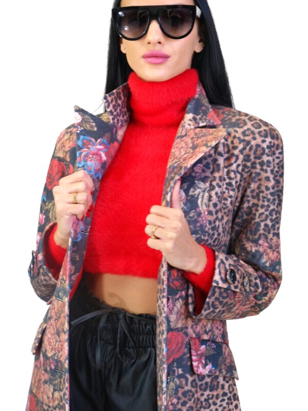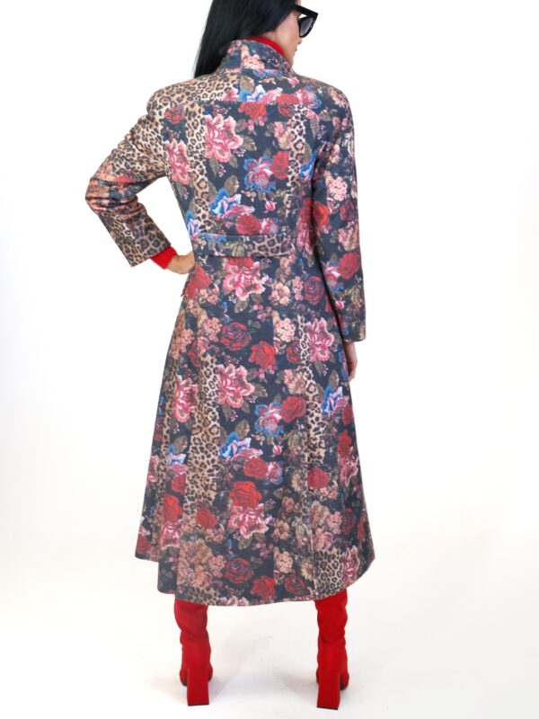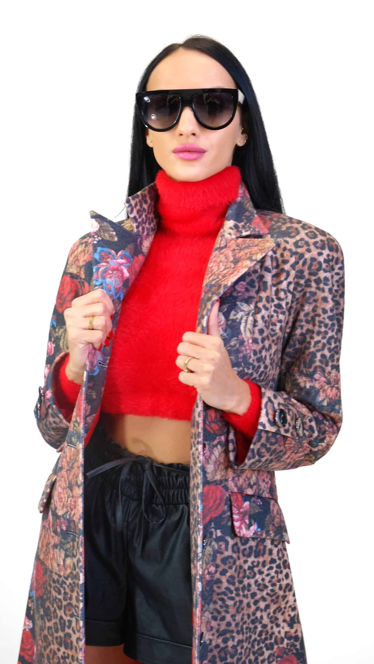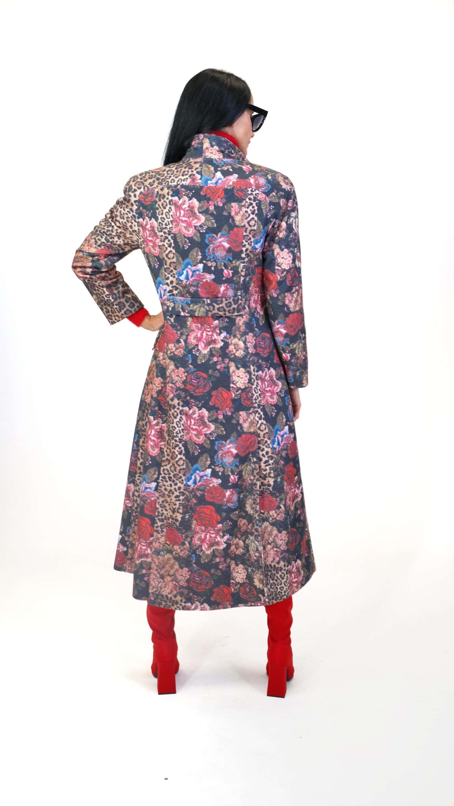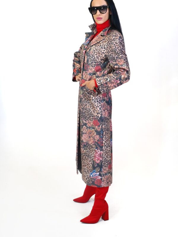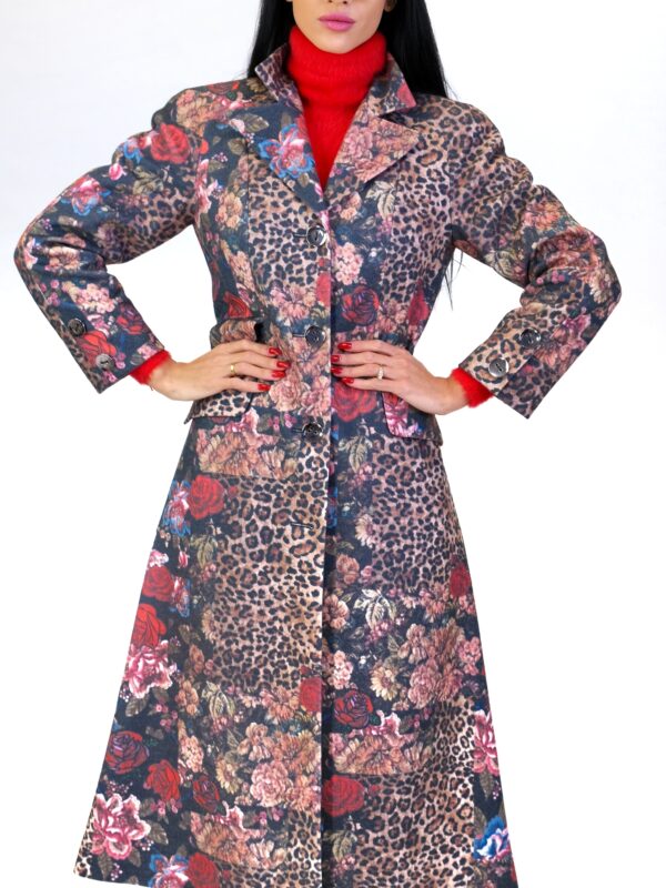 Kabát je navrhnutý v strihu, ktorý je prepracovaný do posledného detailu a skvele sadne na Vašu postavu, zároveň je kabát dlhý a zakryje každé šaty. Už 25 rokov naša rodinná značka vyrába kabáty najvyššej kvality s precíznym vypracovaním. Kabát je využený v páse a pekne sadne na Vašu postavu. Kabát má malú fazónu a opticky Vás predĺži vďaka vhodne zvolenej dĺžke. Kabát je ušitý z výrazného motívu , v ktorom sa snúbi leopard s ružami. Kabát bude Váš najvýraznejší doplnok a vyniknete, v ňom kdekoľvek.