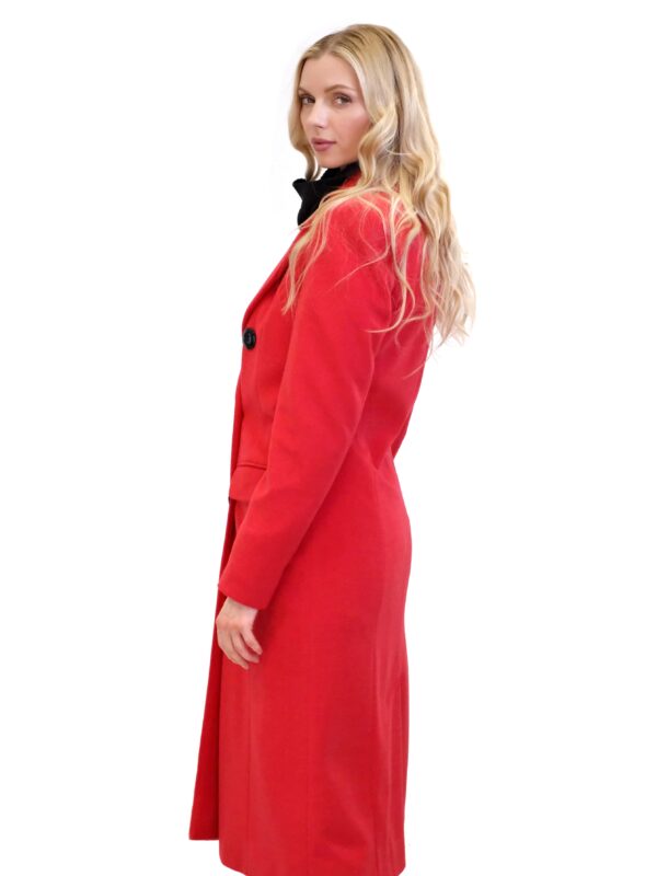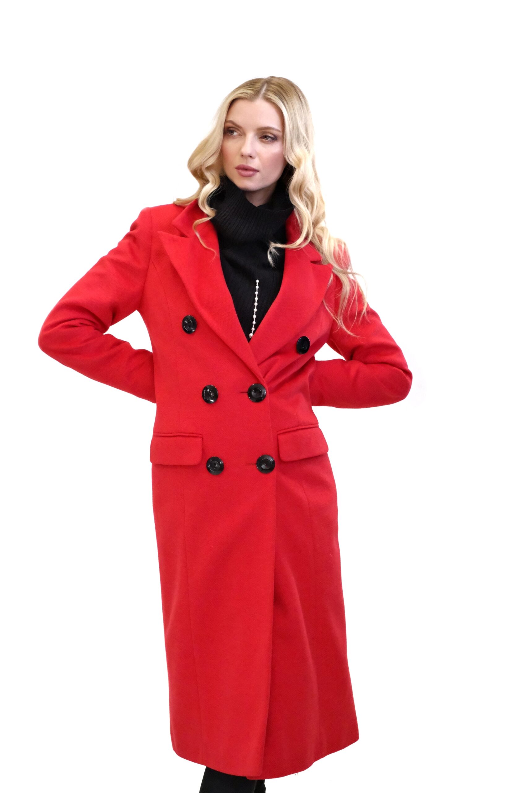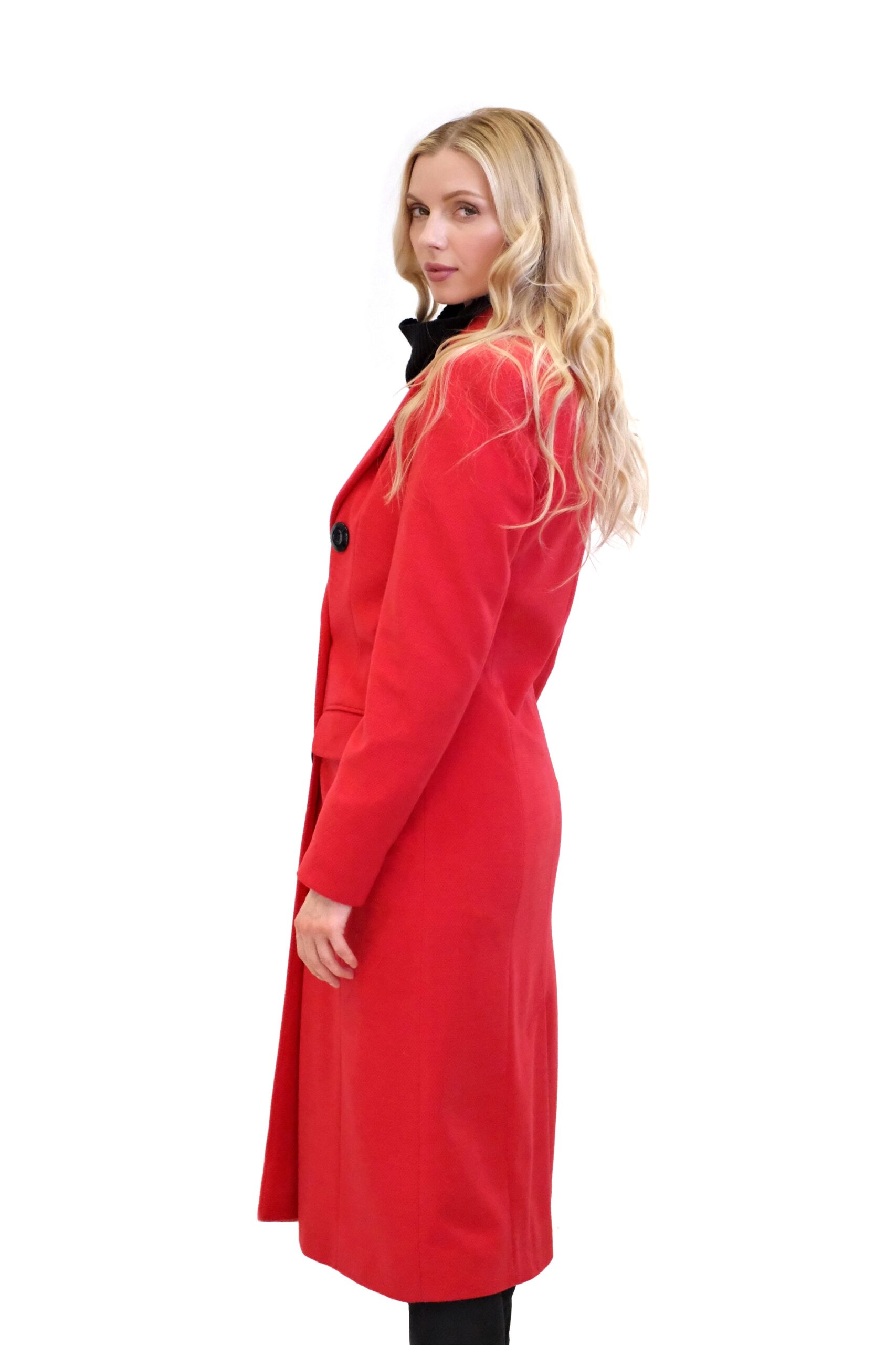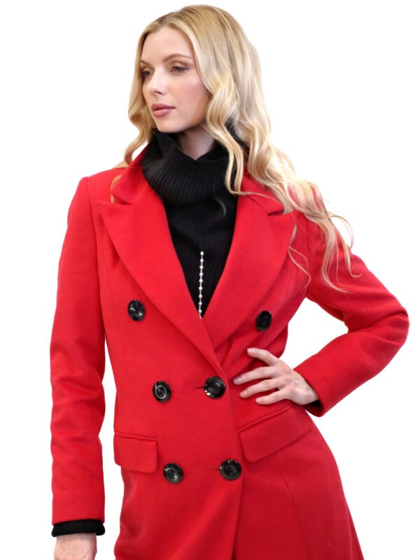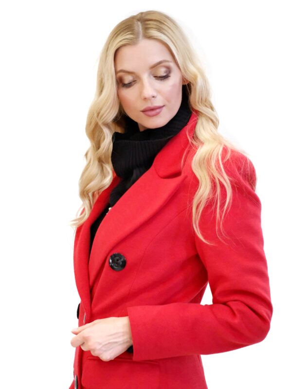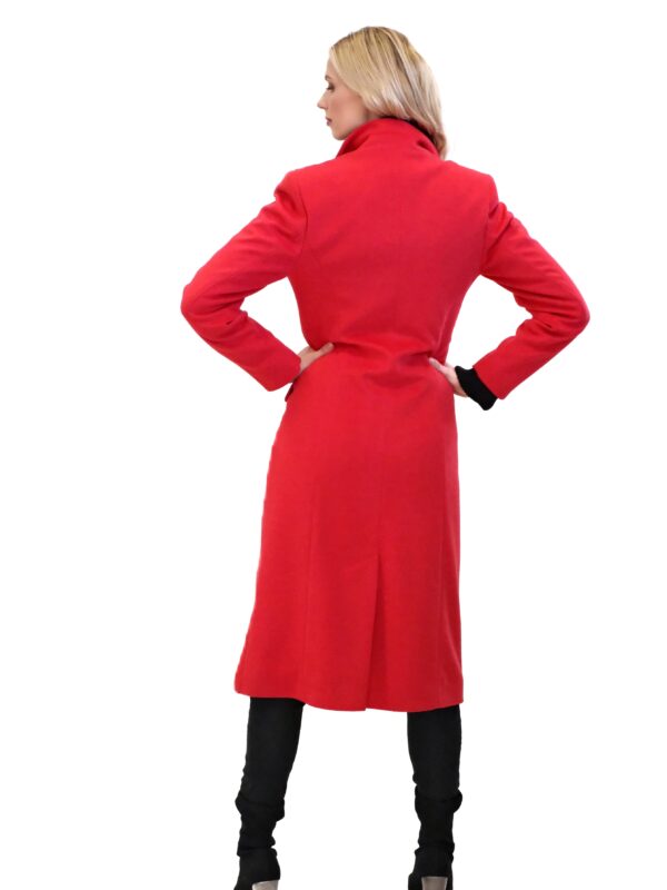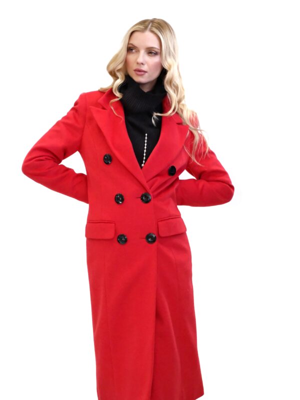 Kabát je navrhnutý v jednoduchom dvojarodovom strihu s klasickou fazónou. Kabát je ušitý vo výraznej červenej farbe, ktorej skvele kontrastujú čierne gombíky. Kabát je ušitý v dĺžke midi a siaha hlbšie pod kolená. Kabát je ušitý z kvalitného materiálu v dielni s 30 ročnou tradíciou v šití kabátov. Každému kúsku sa venovala krajčírka s dlhoročnými skúsenosťami. Výsledok je kabát ako žiadny iný, prepracovaný do najmenších detailov a v kvalite, ktorá Vám vydrží roky.
