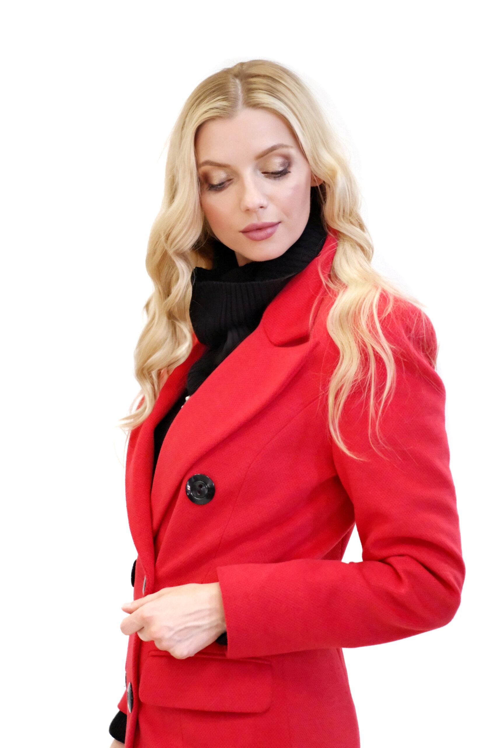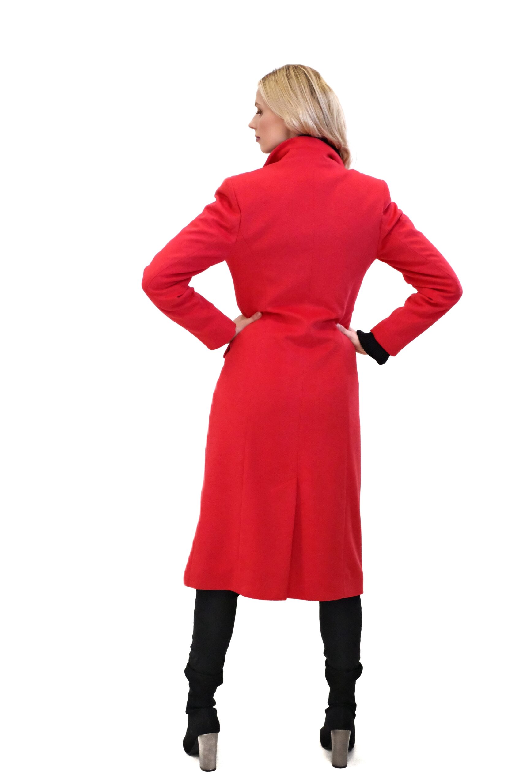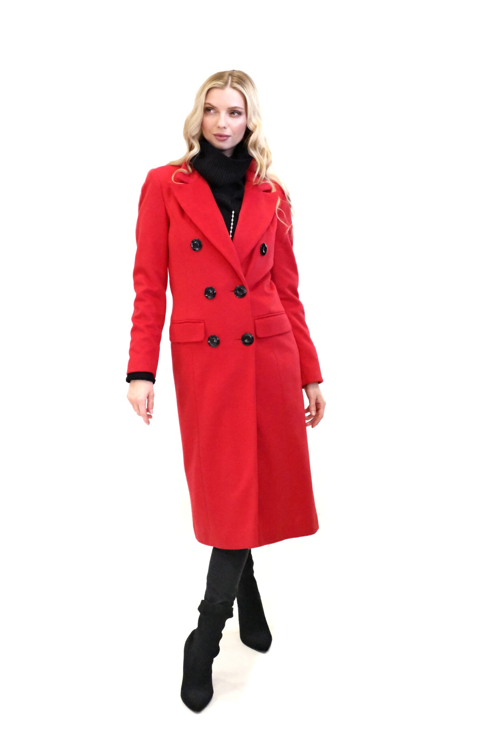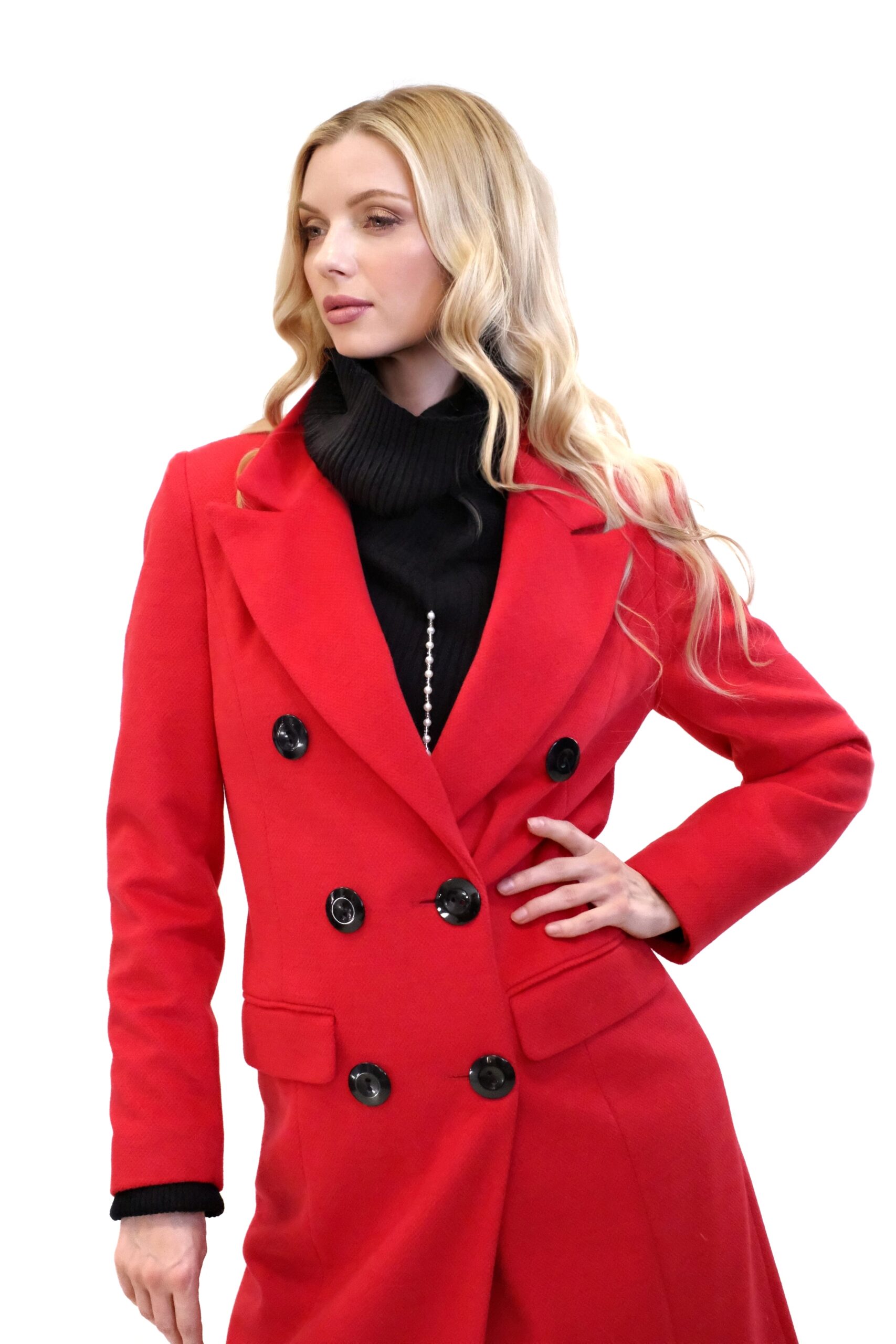 Kabát je navrhnutý v jednoduchom dvojarodovom strihu s klasickou fazónou. Kabát je ušitý vo výraznej červenej farbe, ktorej skvele kontrastujú čierne gombíky. Kabát je ušitý v dĺžke midi a siaha hlbšie pod kolená. Kabát je ušitý z kvalitného materiálu v dielni s 30 ročnou tradíciou v šití kabátov. Každému kúsku sa venovala krajčírka s dlhoročnými skúsenosťami. Výsledok je kabát ako žiadny iný, prepracovaný do najmenších detailov a v kvalite, ktorá Vám vydrží roky.