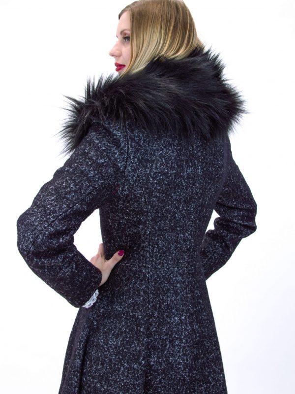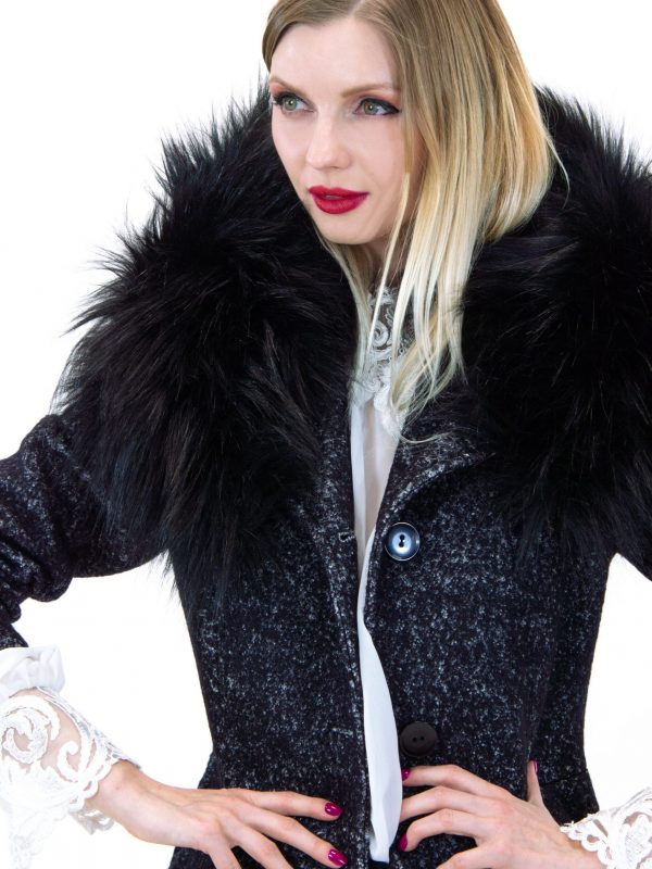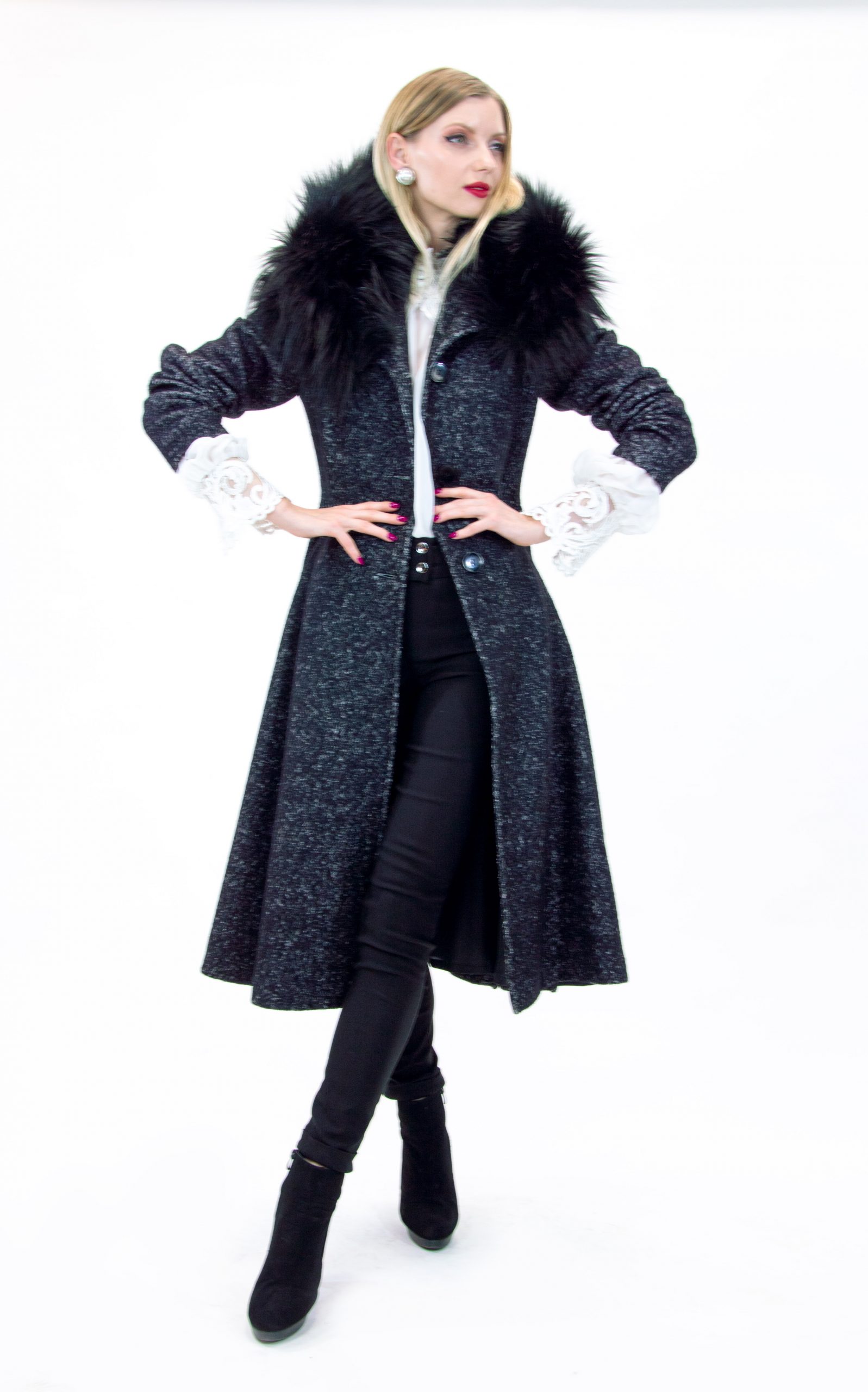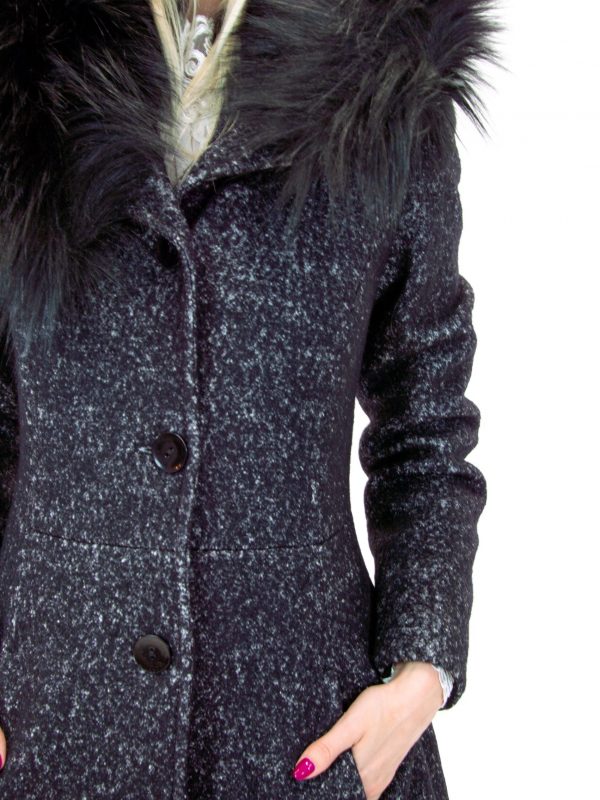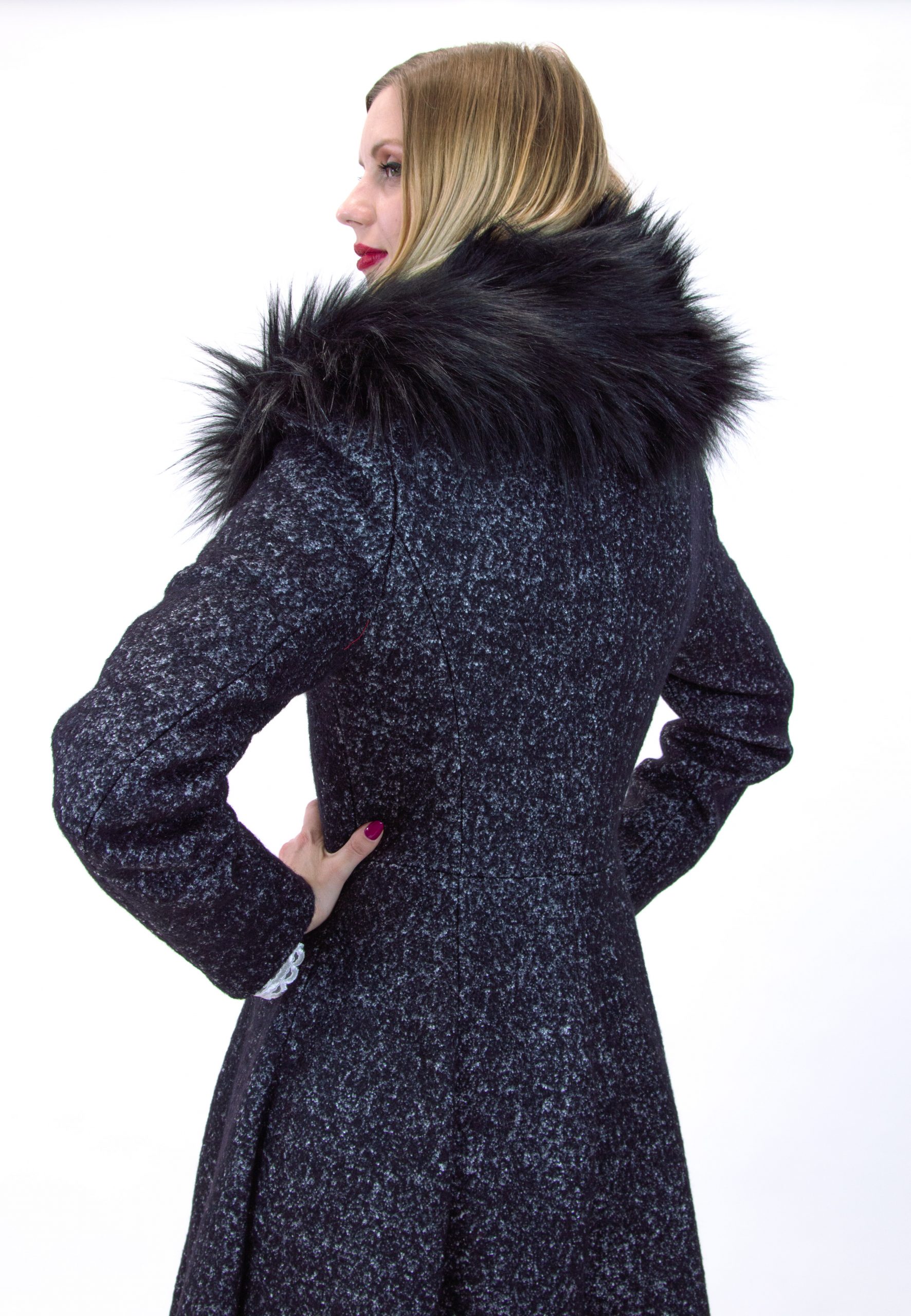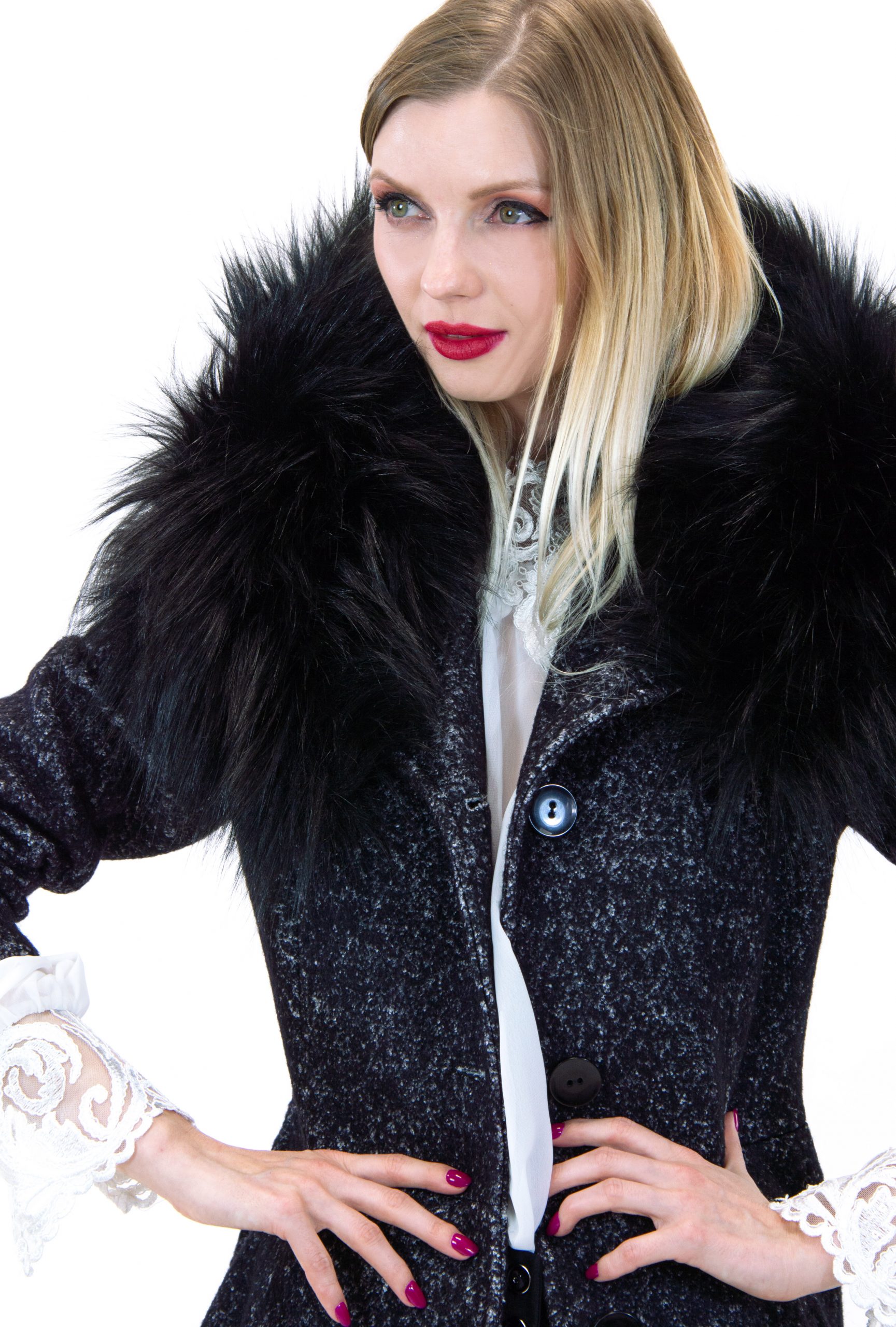 Kabát so snímateľnou umelou kožušinou. Kabát ma krásne vypracovaný princesový strih , ktorý je zúžený v oblasti pásu a postupne sa rozširujúci do áčkovej suknice. Kabátik skvele sedí na postave a opticky Vám zúži pás. Vďaka vysokému obsahu prírodných materiálov Vás zahreje aj počas tuhej zimy. Kožušinka dodáva kabátu honosnosť a bez nej si ho môžete pokojne zobrať aj na prechádzku po meste. Kabát je vyhotovený z čierneho buklé s prskom, ktorý mu dodáva zaujímavý charakter.