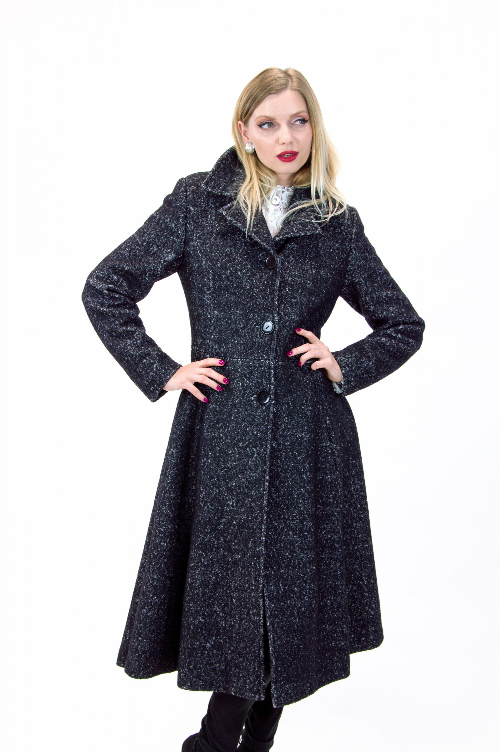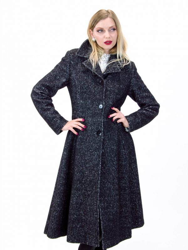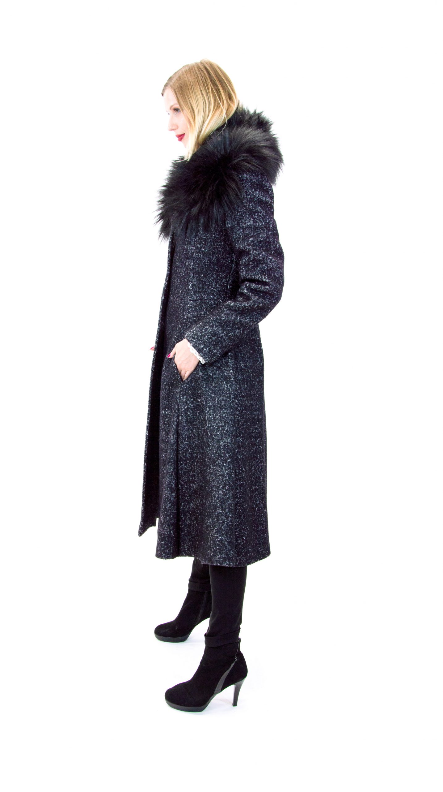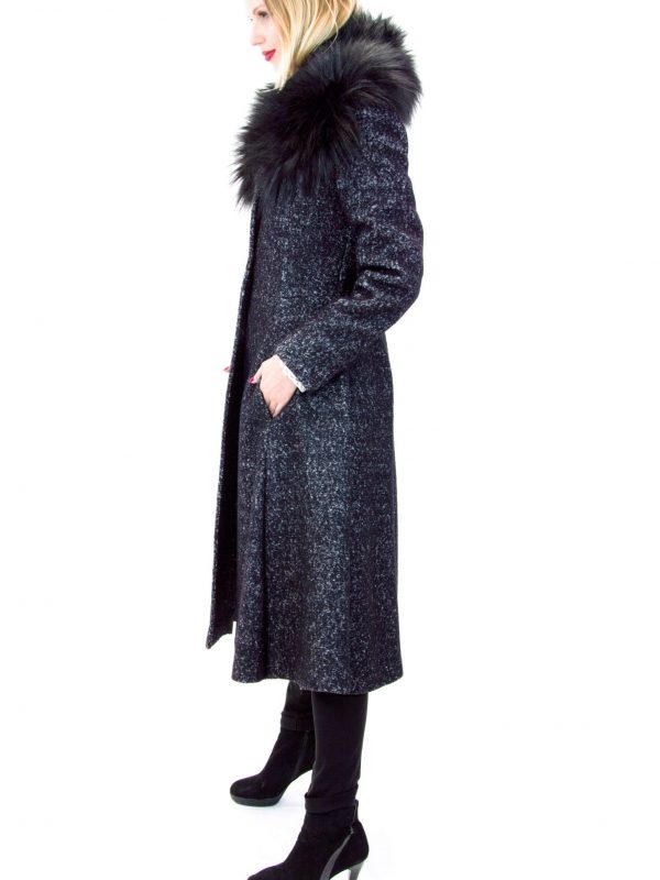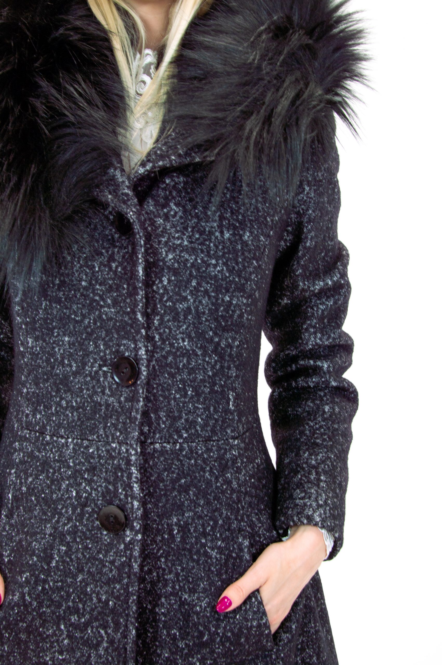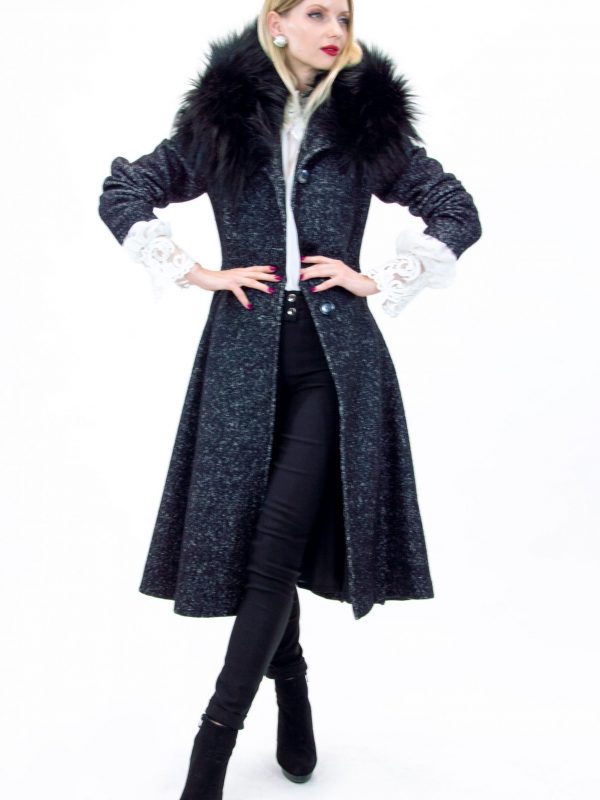 Kabát so snímateľnou umelou kožušinou. Kabát ma krásne vypracovaný princesový strih , ktorý je zúžený v oblasti pásu a postupne sa rozširujúci do áčkovej suknice. Kabátik skvele sedí na postave a opticky Vám zúži pás. Vďaka vysokému obsahu prírodných materiálov Vás zahreje aj počas tuhej zimy. Kožušinka dodáva kabátu honosnosť a bez nej si ho môžete pokojne zobrať aj na prechádzku po meste. Kabát je vyhotovený z čierneho buklé s prskom, ktorý mu dodáva zaujímavý charakter.