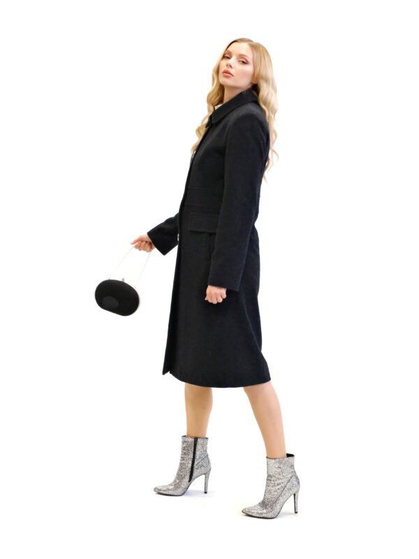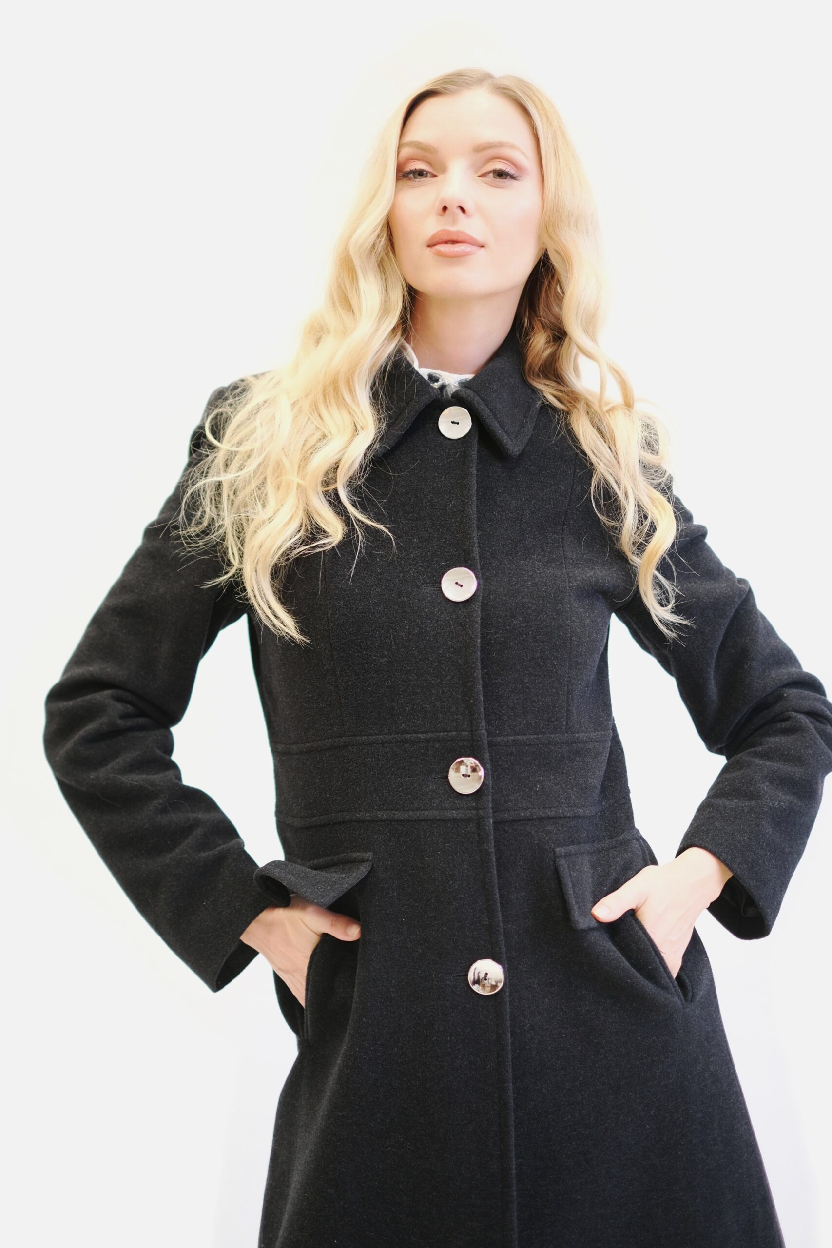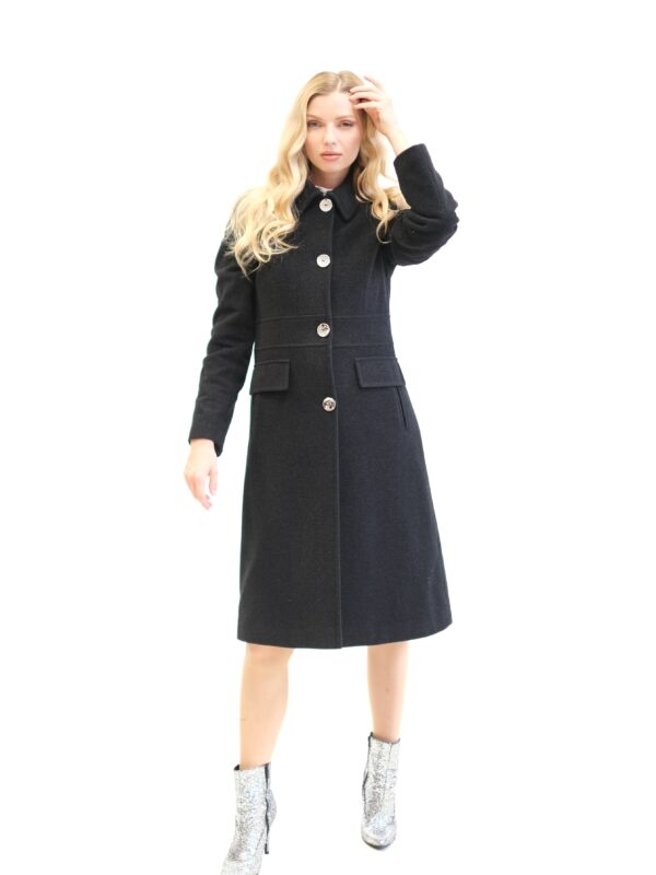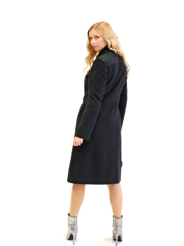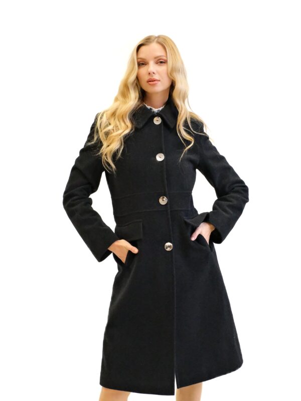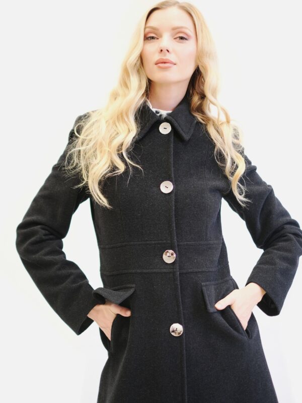 Kabát je navrhnutý s dôrazom na každý detail v prepracovanom strihu, ktorý sadne na postavu ako uliaty. Kabát má zaujímavo strihaný vrchný diel, vďaka čomu sa Vám lepšie prispôsobí a pekne vytvaruje chrbtovú líniu. Kabát ma zdôraznený pás vďaka čomu Vás opticky zoštíhli. Zaujímavými detailami na kabáte sú vrecká bočné vrecká, ktoré sa ukrývajú pod príklopkou a výrazný golier v štýle ako by ho navrhla Coco Chanel. Kabát je ušitý vo farbe antracit, ktorá skvele zapadne do šatníka každej jednej z Vás. Dĺžka kabáta je pod kolená.
