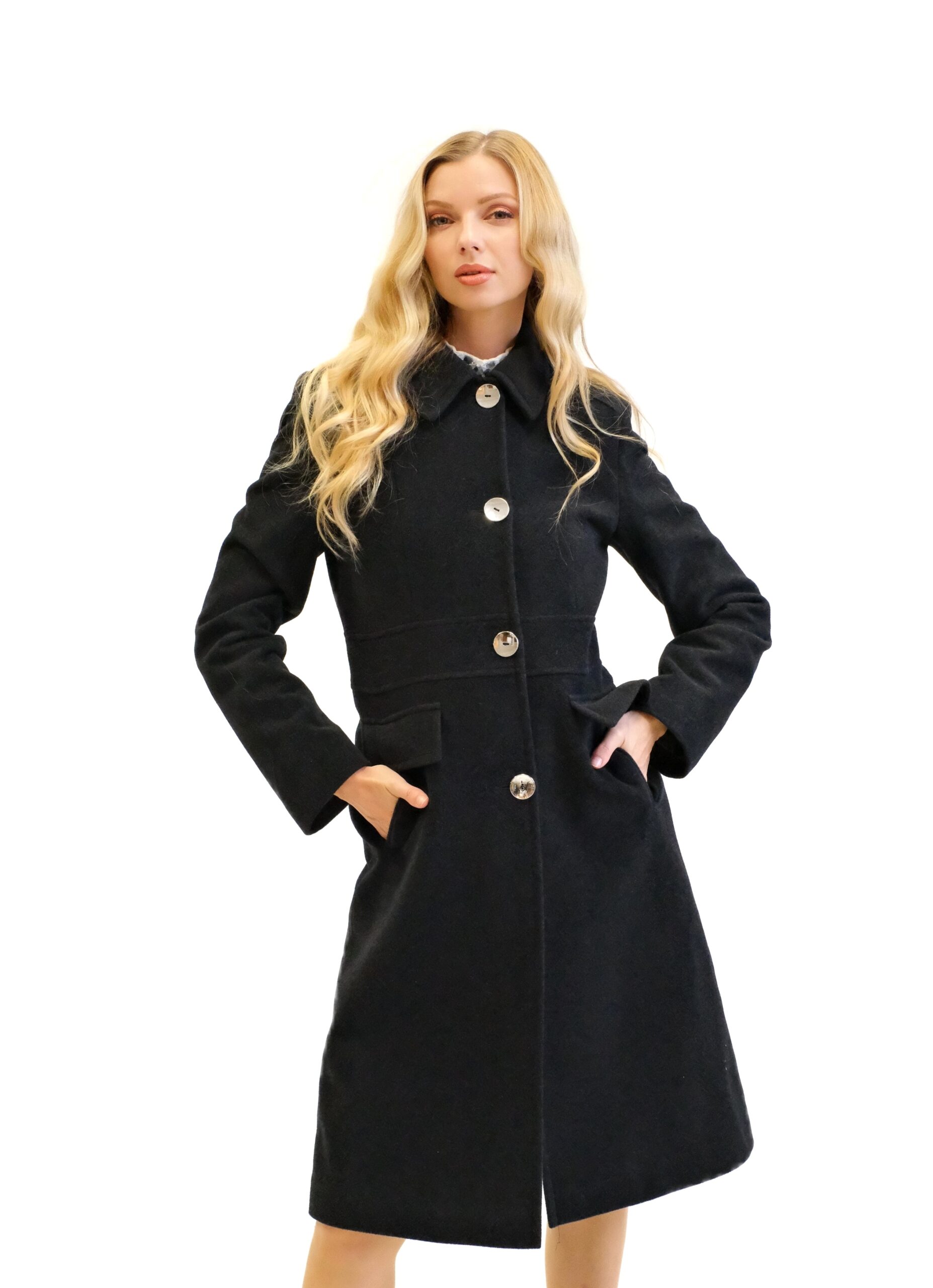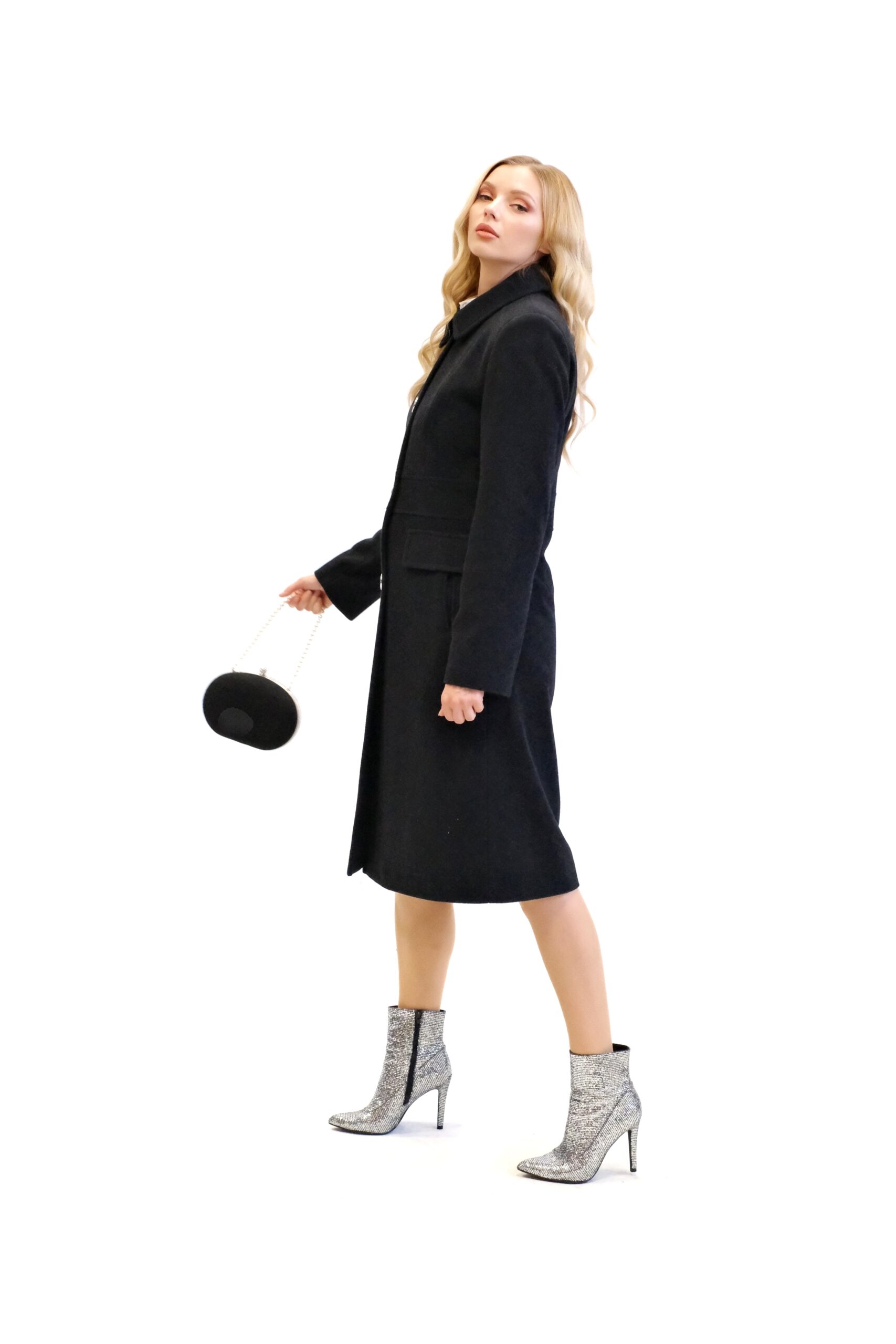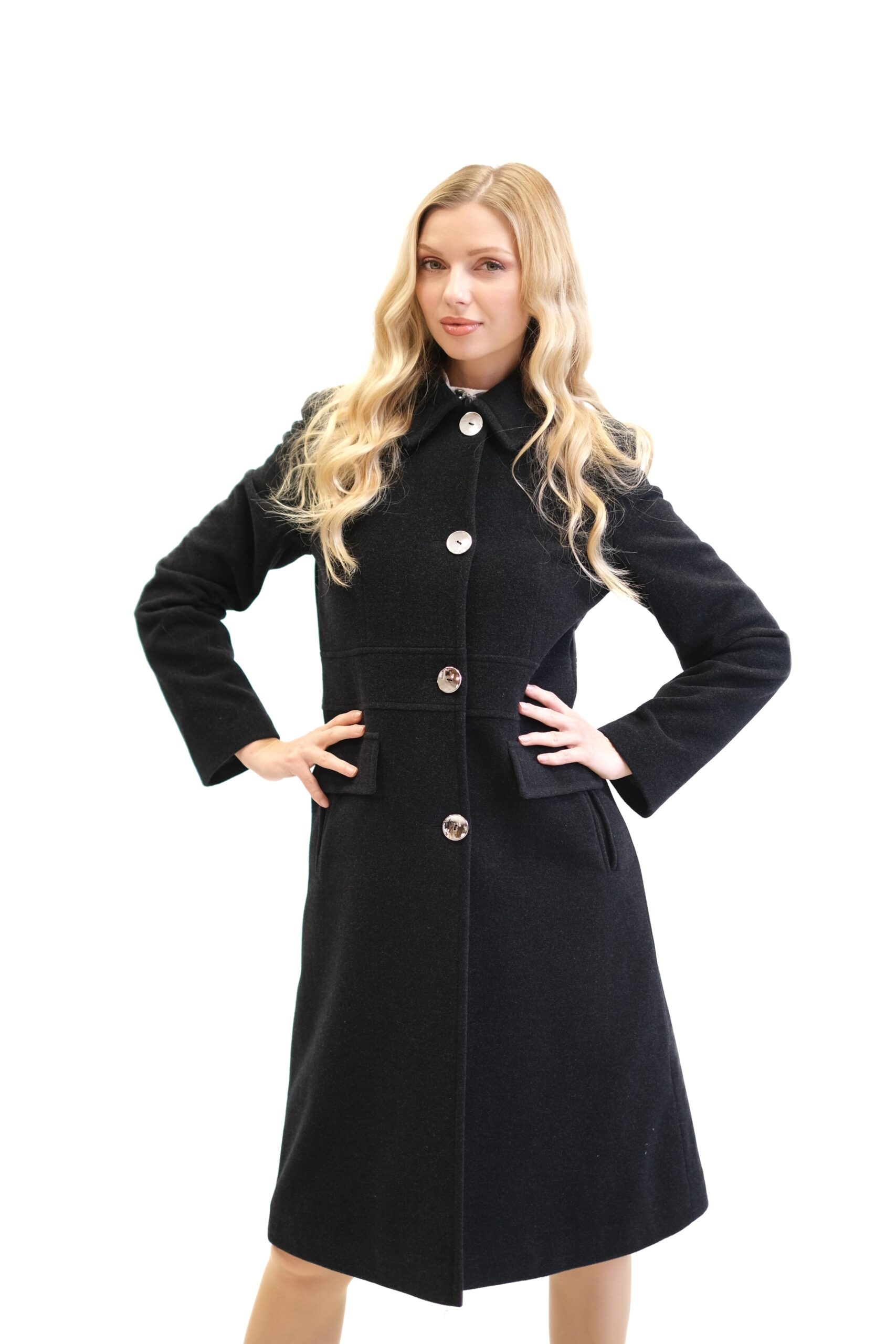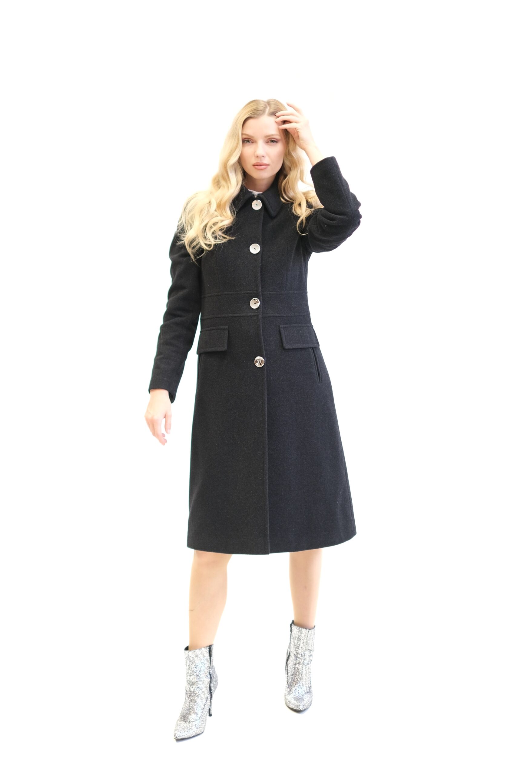 Kabát je navrhnutý s dôrazom na každý detail v prepracovanom strihu, ktorý sadne na postavu ako uliaty. Kabát má zaujímavo strihaný vrchný diel, vďaka čomu sa Vám lepšie prispôsobí a pekne vytvaruje chrbtovú líniu. Kabát ma zdôraznený pás vďaka čomu Vás opticky zoštíhli. Zaujímavými detailami na kabáte sú vrecká bočné vrecká, ktoré sa ukrývajú pod príklopkou a výrazný golier v štýle ako by ho navrhla Coco Chanel. Kabát je ušitý vo farbe antracit, ktorá skvele zapadne do šatníka každej jednej z Vás. Dĺžka kabáta je pod kolená.
