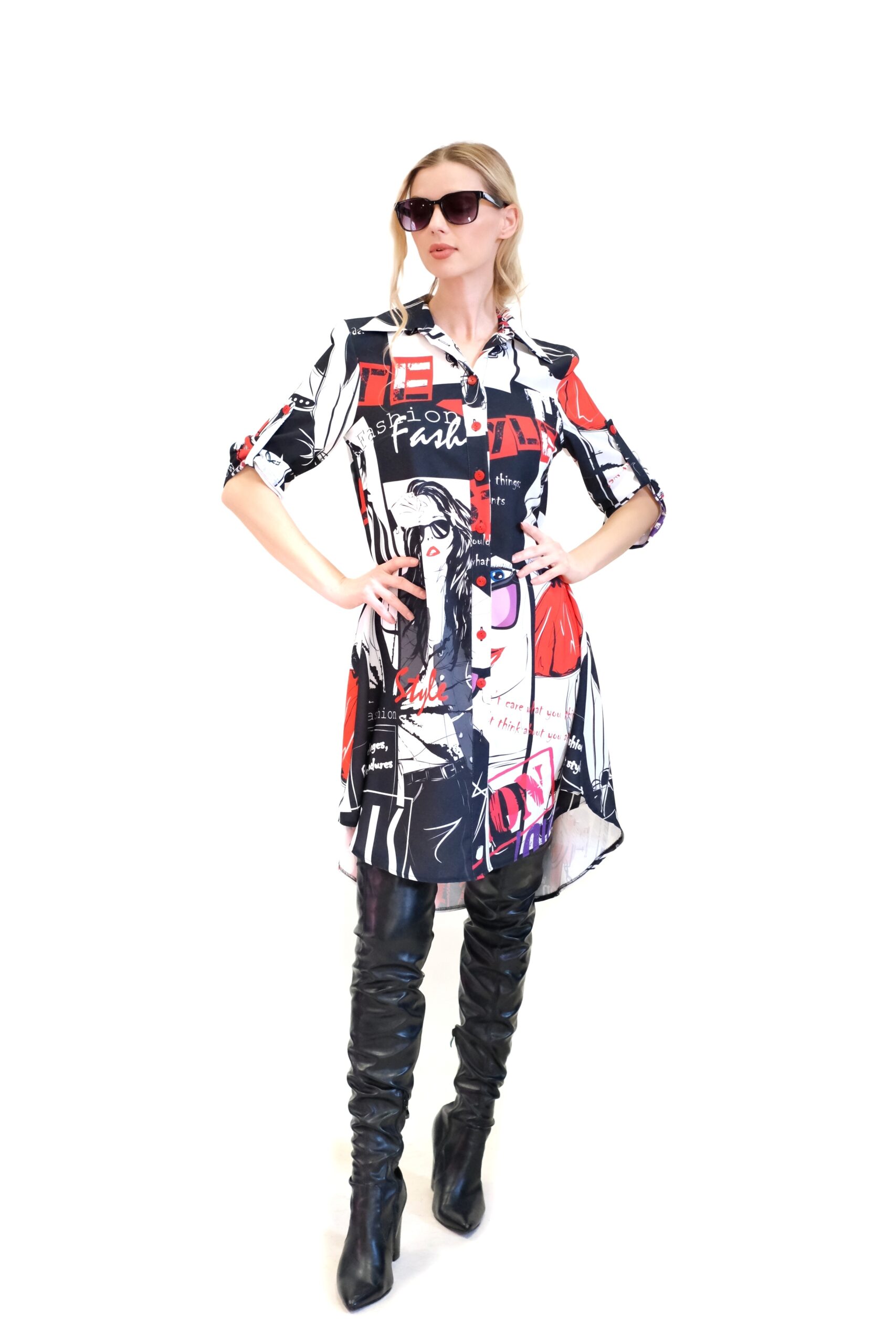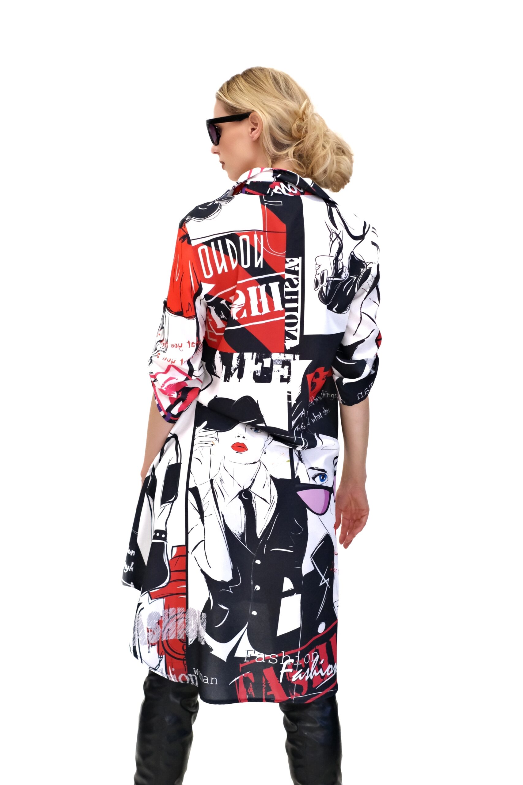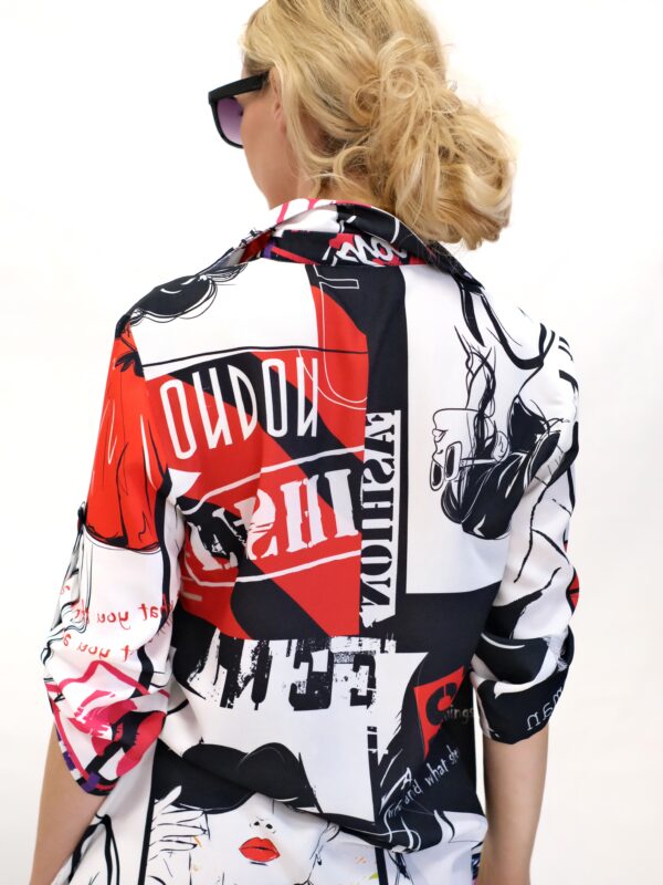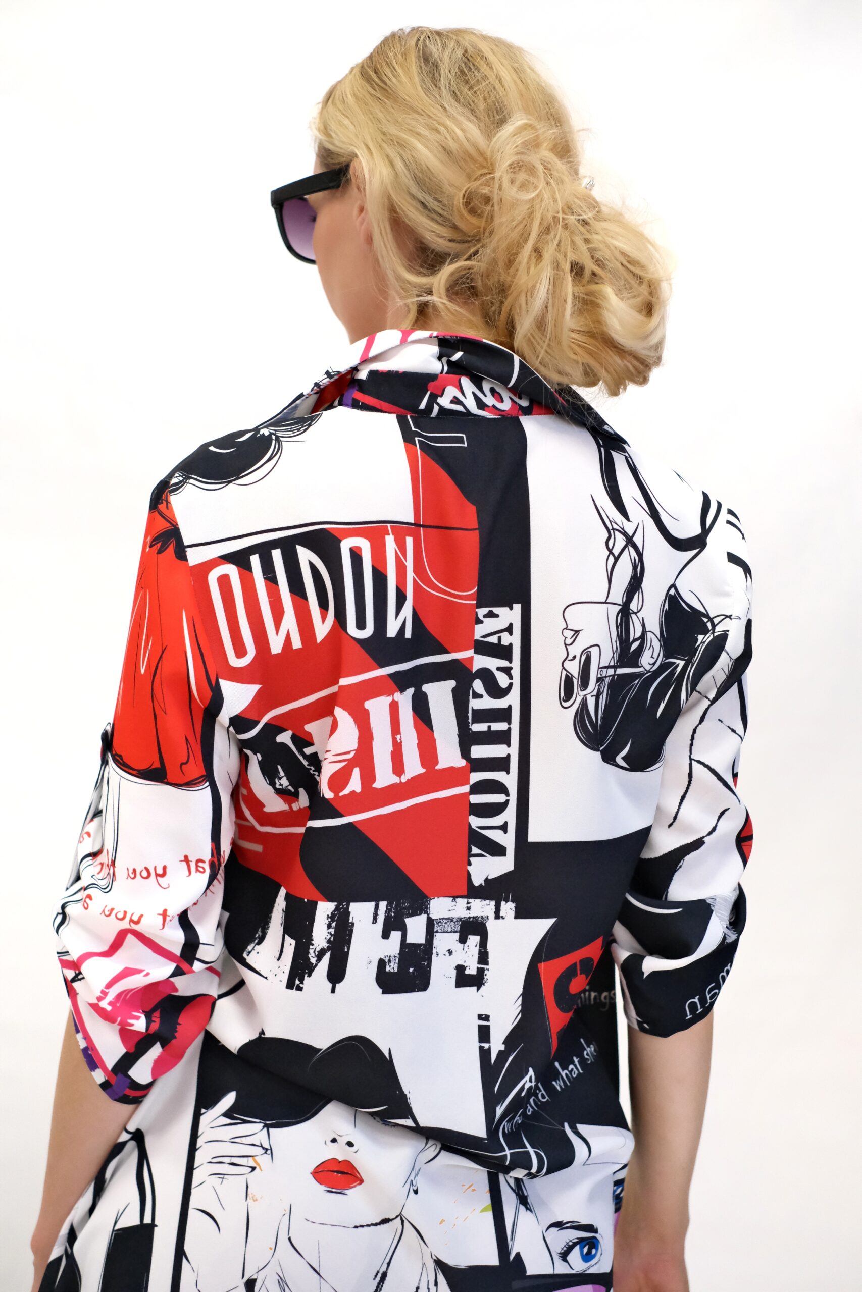 Košeľa je navrhnutá v pohodlnom áčkovom strihu, ktorý je zdôraznený nádhernou potlačou v štýle pop art. Na košeli sa dajú vyhrnúť rukávy, čo jej dodáva ležérny vzhľad. Vo vzore dominujé čierne, biela s náznakmi červenej farby. Košeľa má prestrihy na bokoch.