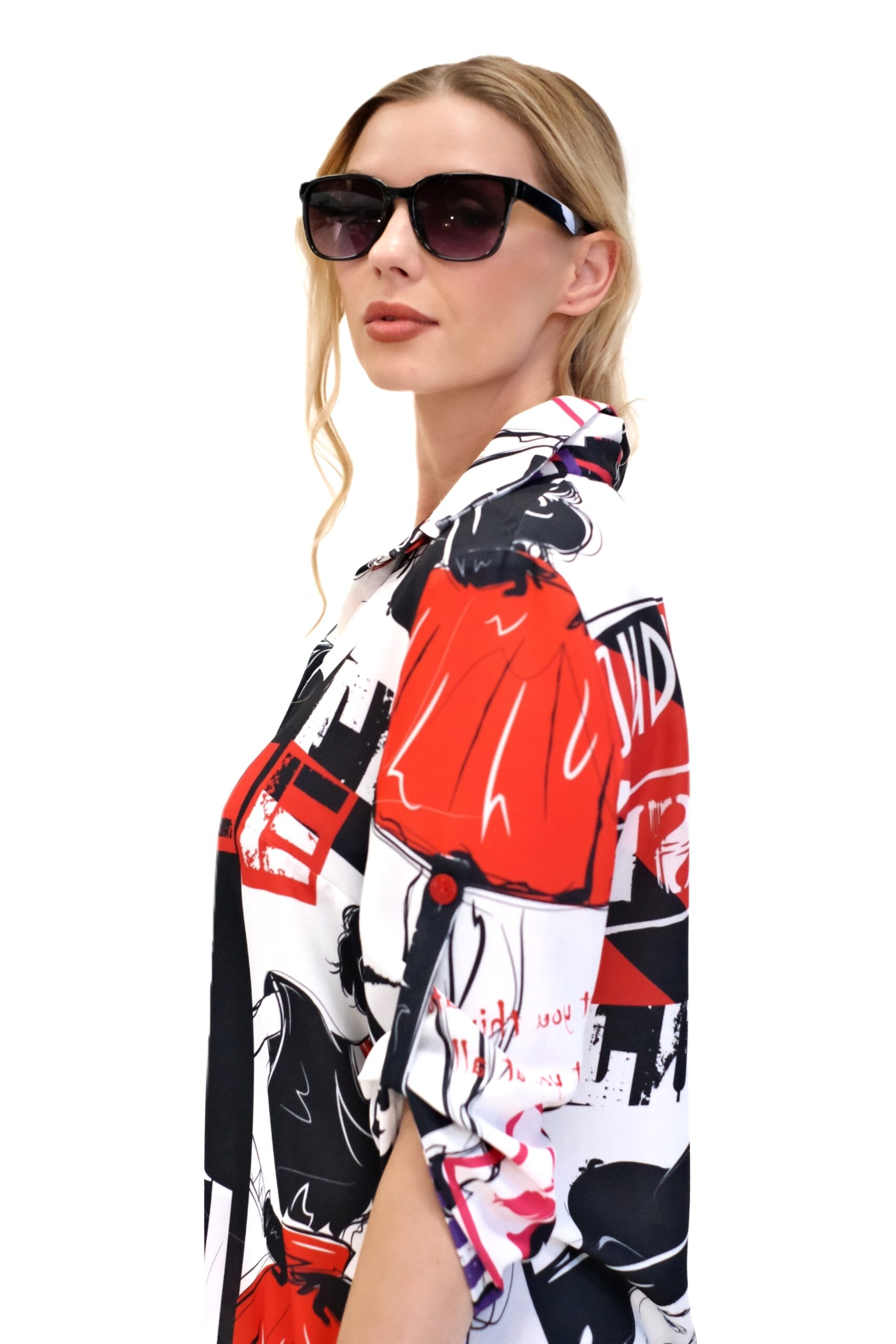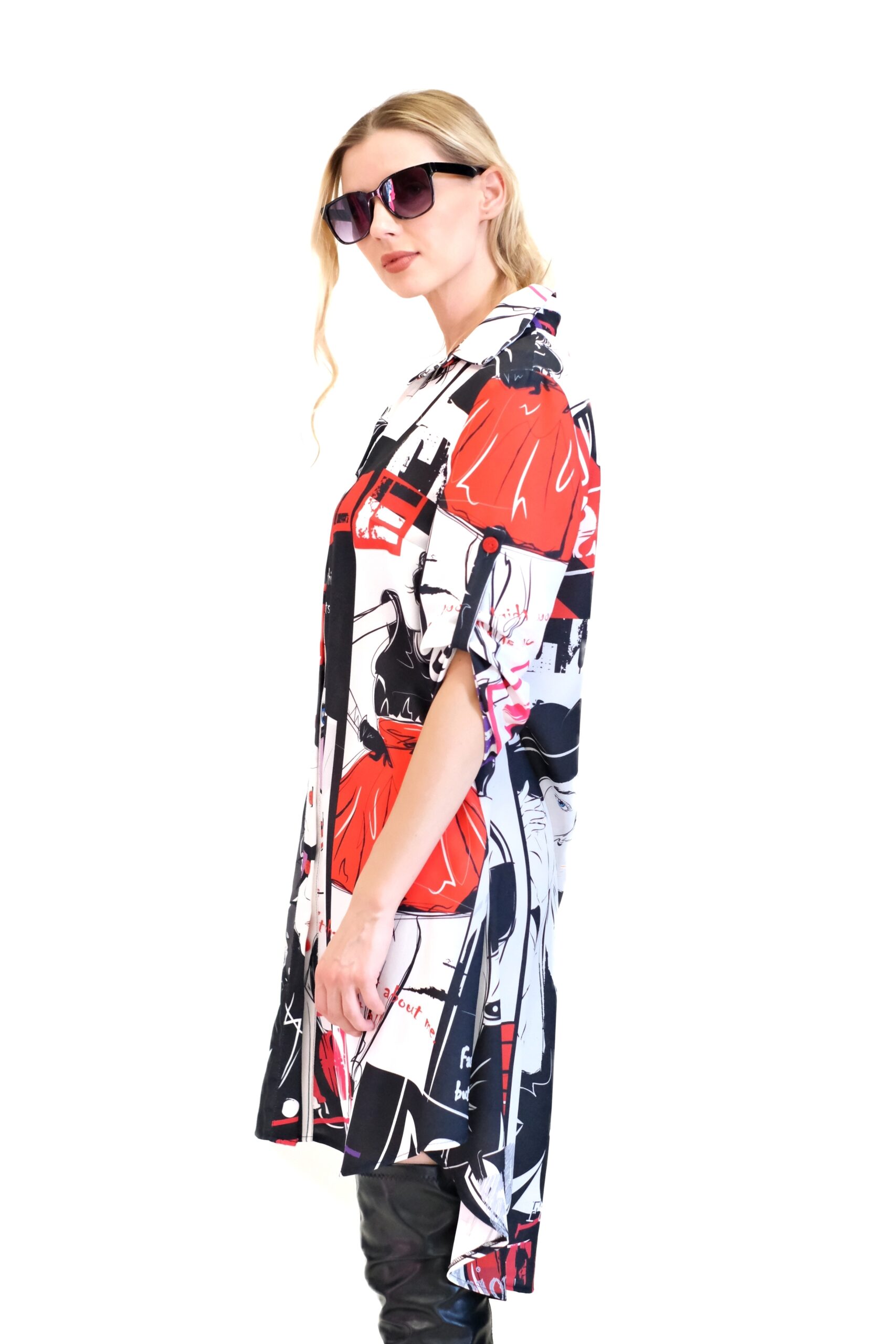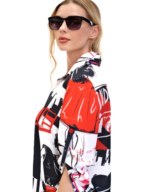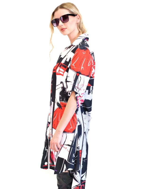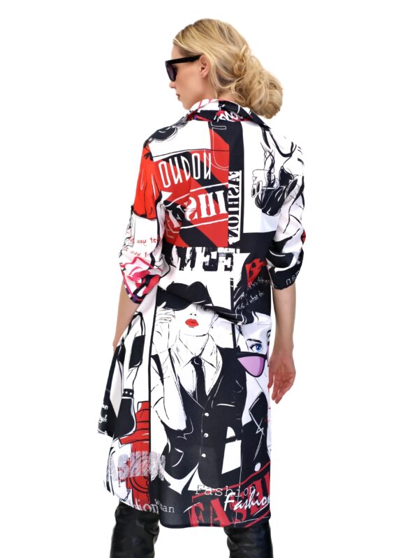 Košeľa je navrhnutá v pohodlnom áčkovom strihu, ktorý je zdôraznený nádhernou potlačou v štýle pop art. Na košeli sa dajú vyhrnúť rukávy, čo jej dodáva ležérny vzhľad. Vo vzore dominujé čierne, biela s náznakmi červenej farby. Košeľa má prestrihy na bokoch.