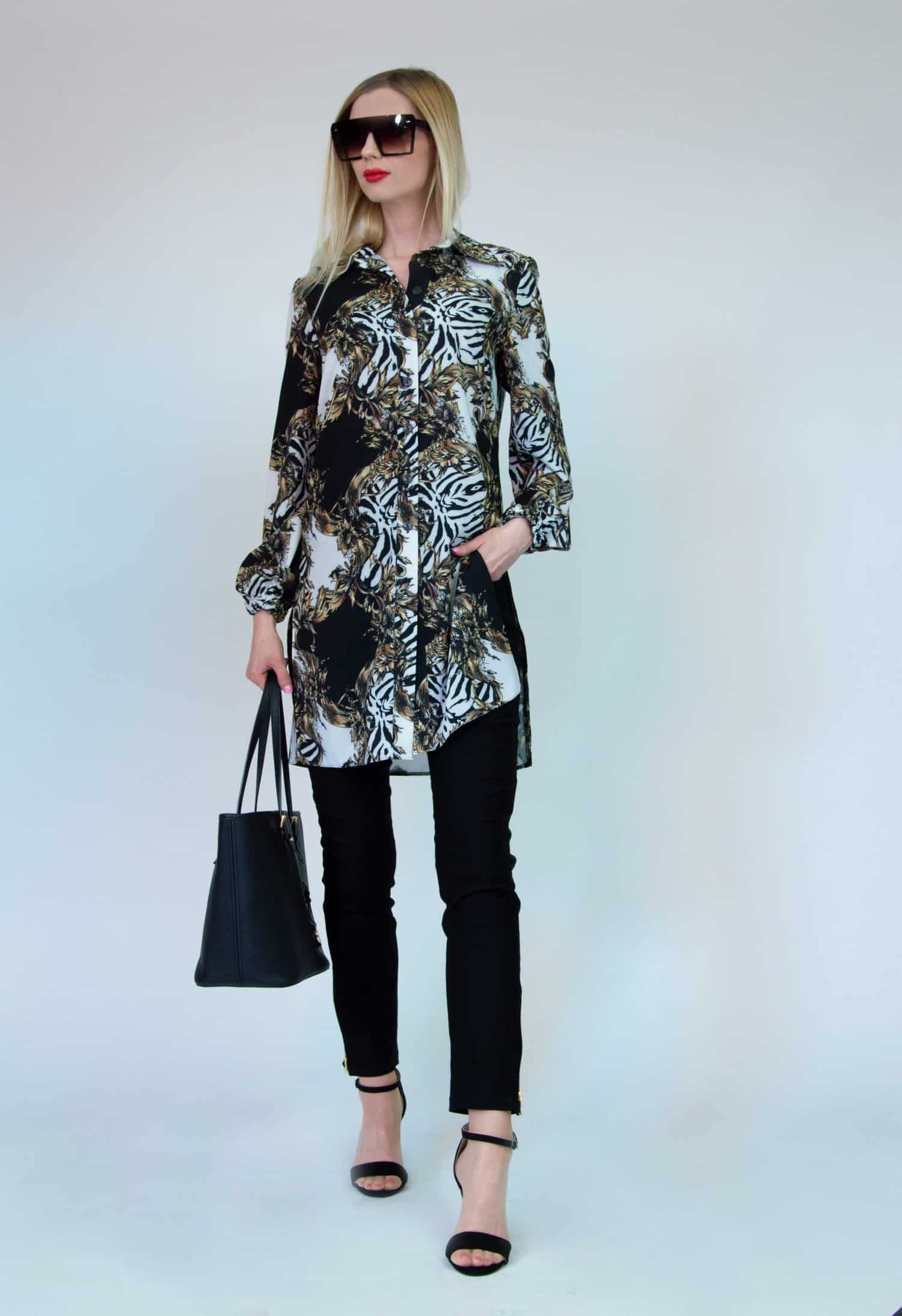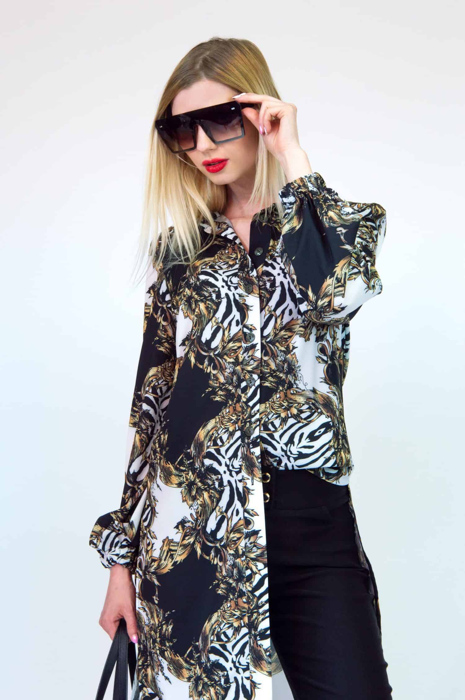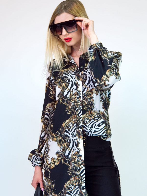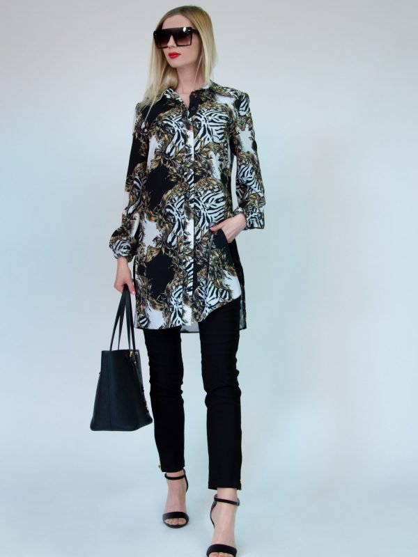 Predlžená košeľa so safari motívom a barokovými prvkami. Ako stvorená, keď neviete čo si máte dať na seba, tak ju skombinujete k legínám a čiernym opätkom a look je na svete.
