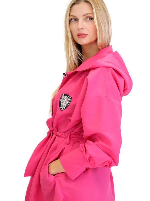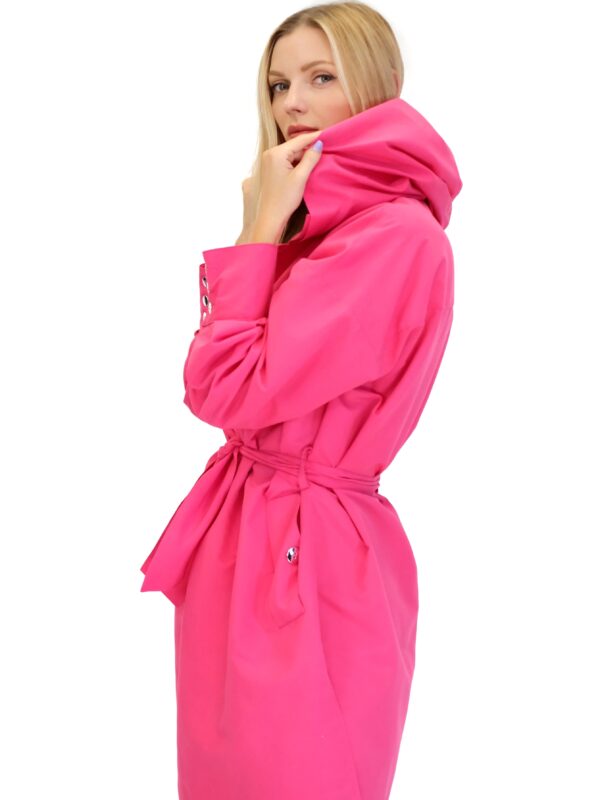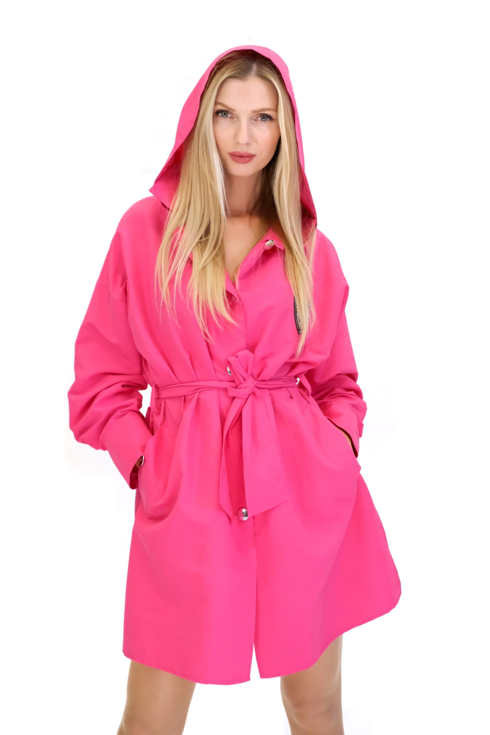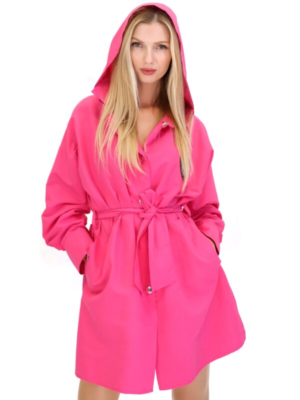 Košeľa je navrhnutá v pohodlnom oversize strihu, ktorý výborne sadne na každý typ postavy. Košeľa je ušitá v predĺženom strihu a dá sa nosiť aj ako plášť. Košeľa sa dá stiahnuť v páse opaskom. Košeľa má ozdobné gombíky na manžetách a na vreckách, čo jej dodáva šmrnc. Zaujímavým detailom na košeli je kapucňa, čo jej dodáva ležérny vzhlaď. Košeľa je navrhnutá vo výraznej rúžovej farbe, ktorá sa ľahko skombinuje s tmavšími farbami vo Vašom šatníku.