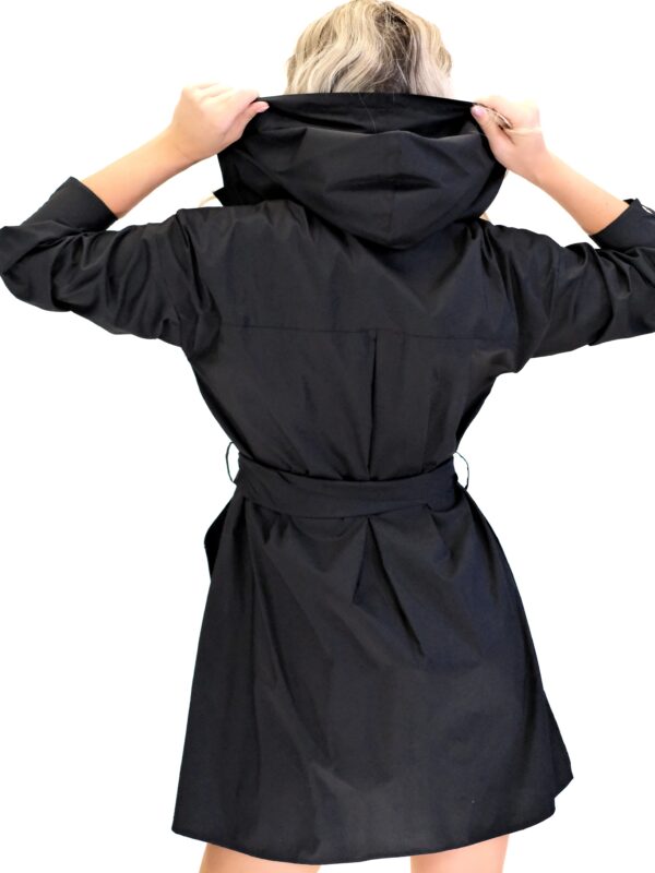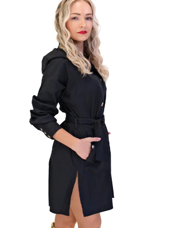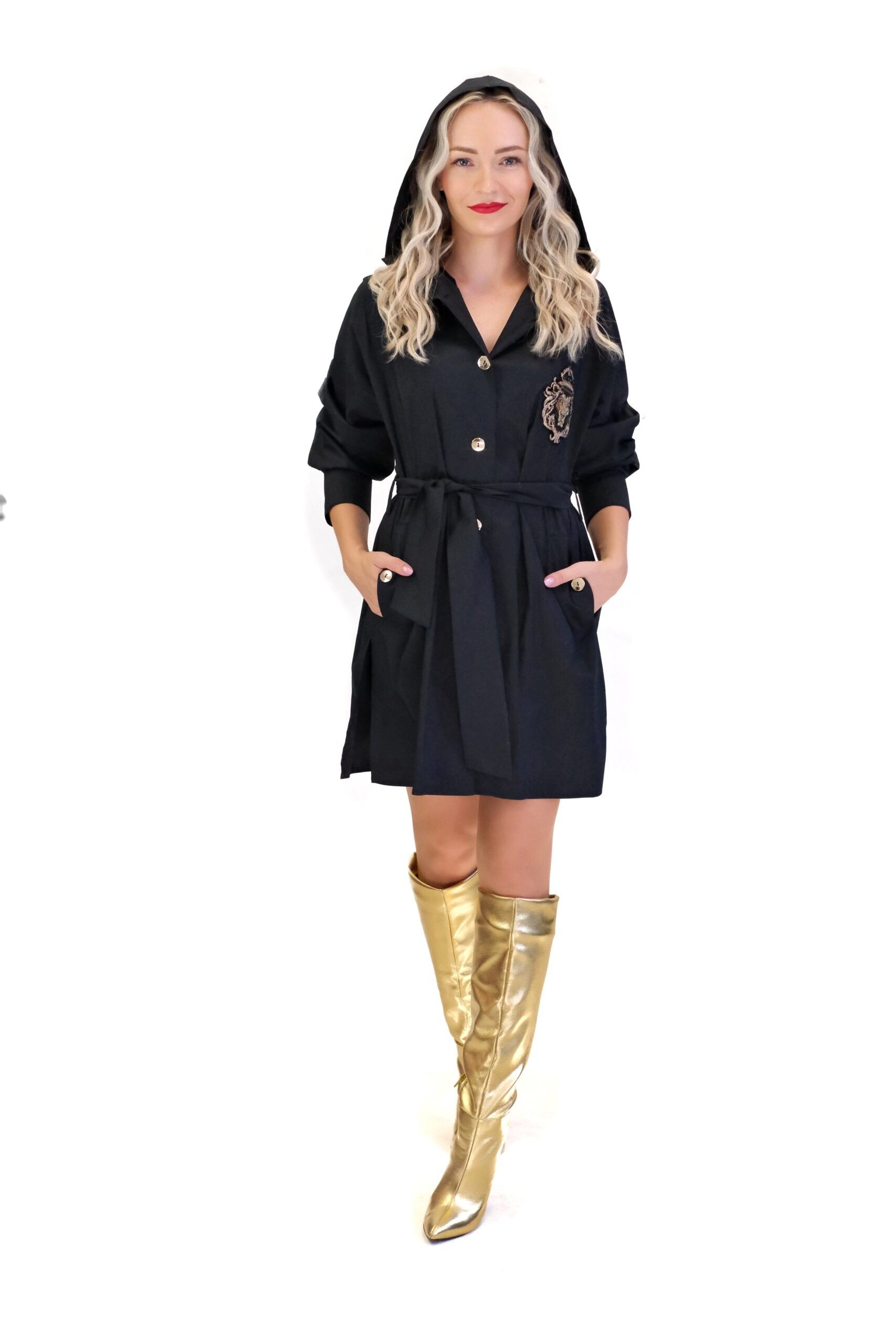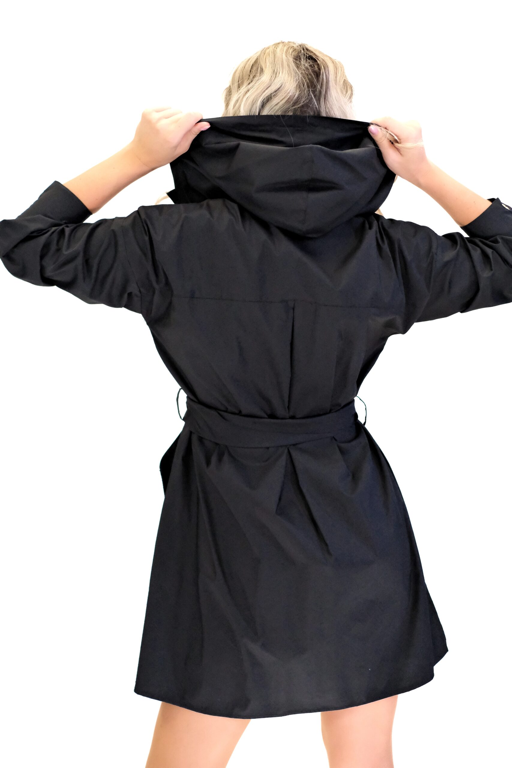 Košeľa je navrhnutá v pohodlnom oversize strihu, ktorý výborne sadne na každý typ postavy. Košeľa je ušitá v predĺženom strihu a dá sa nosiť aj ako plášť. Košeľa sa dá stiahnuť v páse opaskom. Košeľa má ozdobné gombíky na manžetách a na vreckách, čo jej dodáva šmrnc. Zaujímavým detailom na košeli je kapucňa, čo jej dodáva ležérny vzhlaď. Košela je navrhnutá v ikonickej čiernej, ktorú ľahko kombinujete s celým Vaším šatníkom.