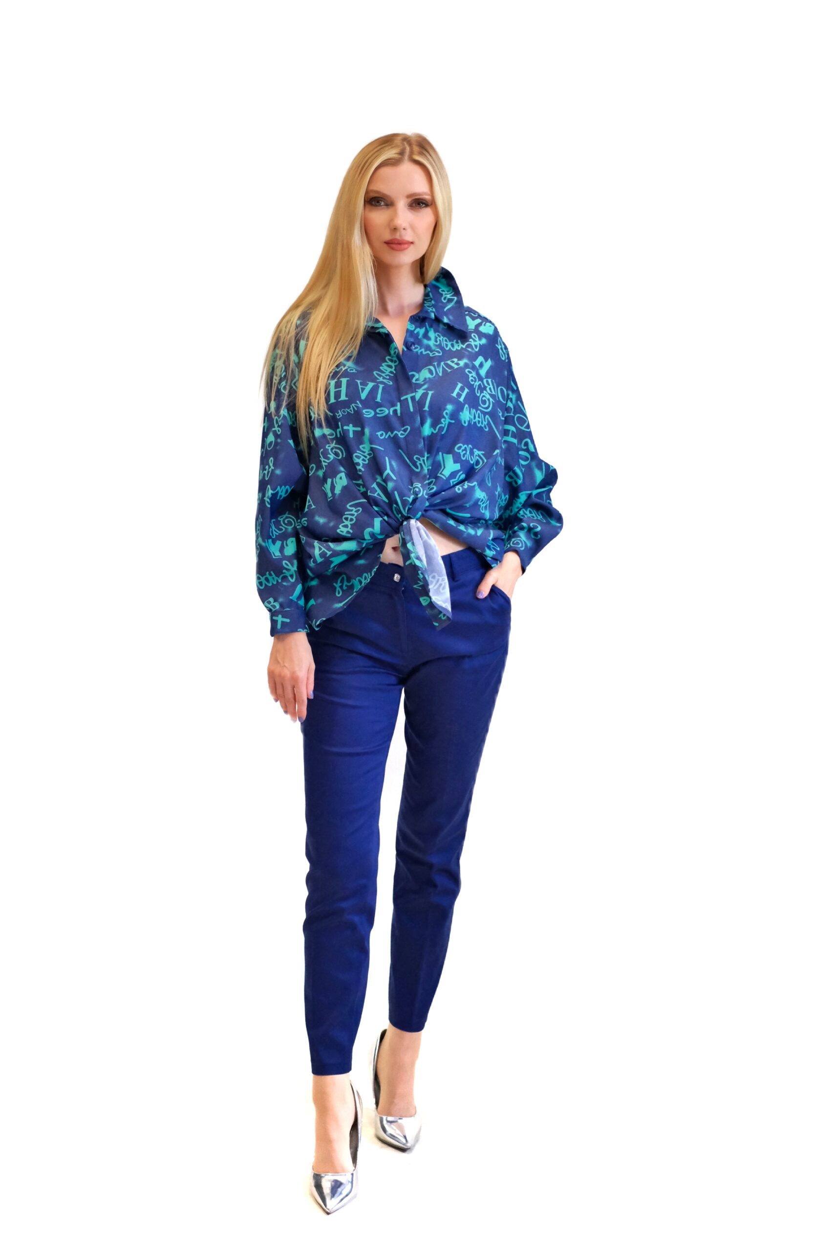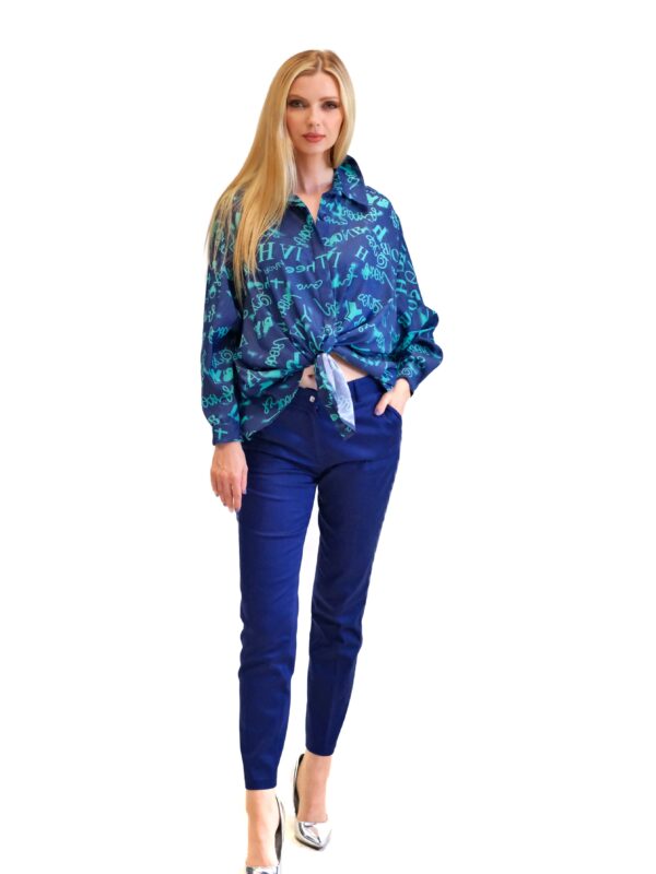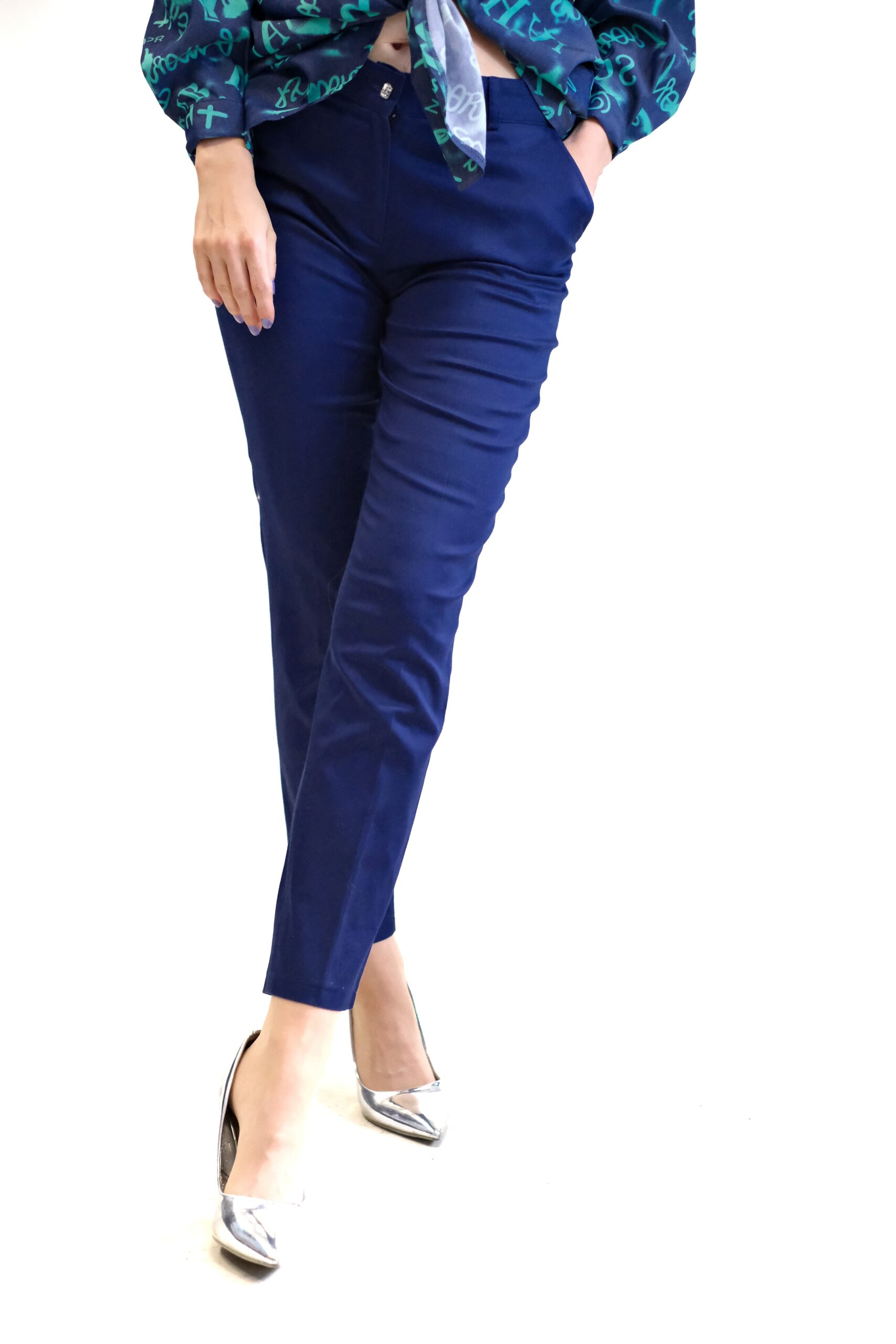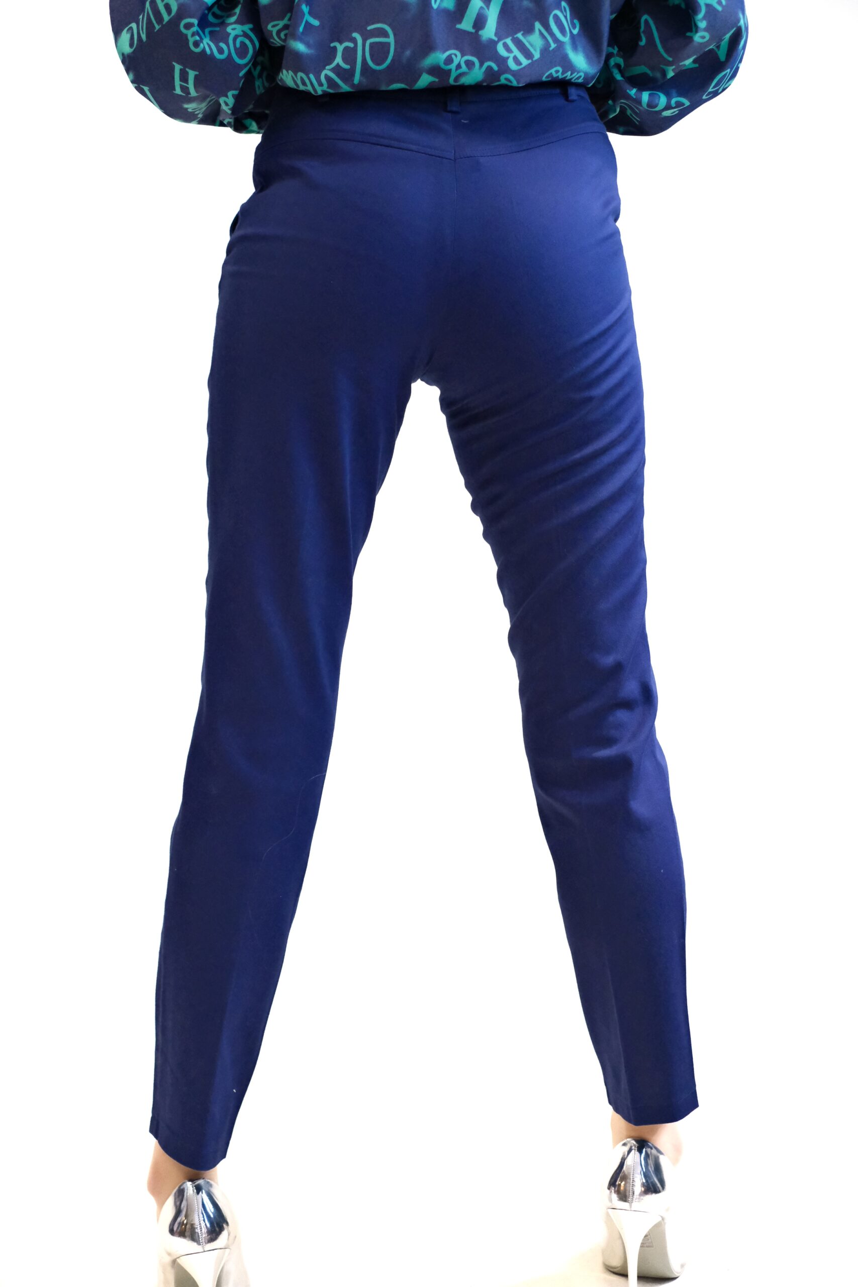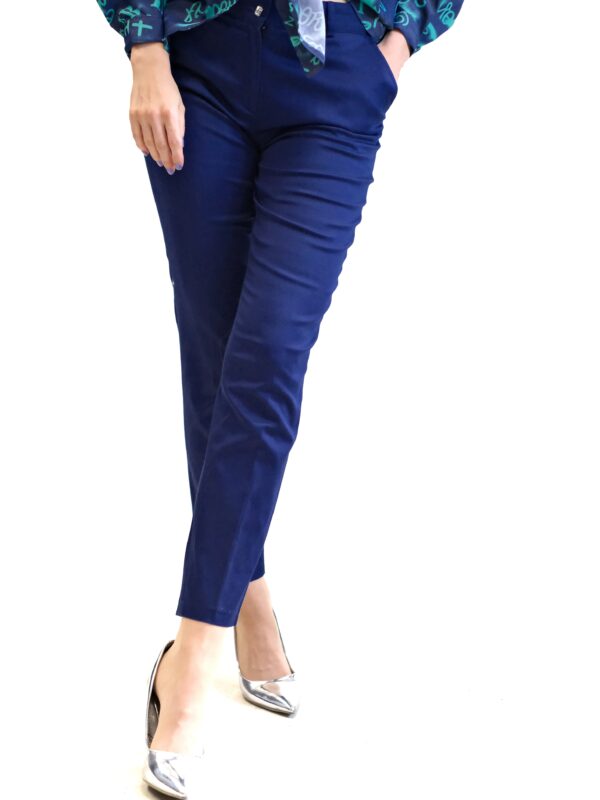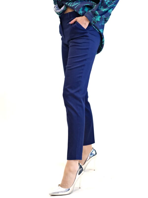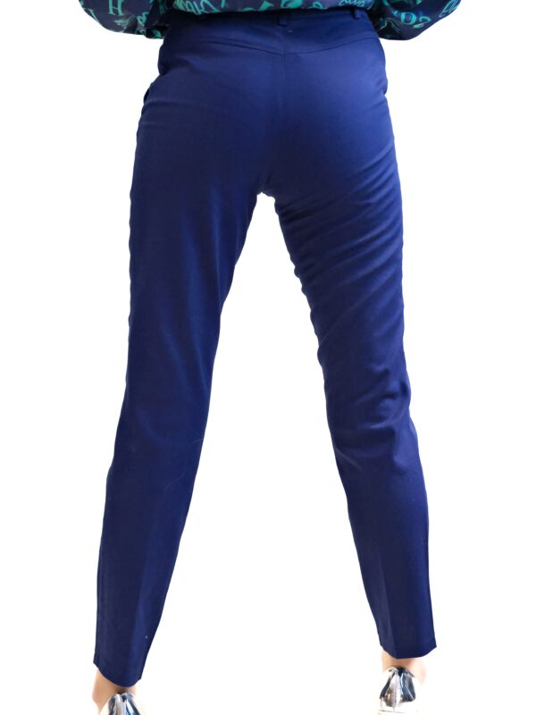 Nohavice sú ušité v rovnom striihu s mierne zvýšením pásom. Nohavice sú navrhnuté v nadčasovom rovnom strihu, ktorý bude in v každej módnej perióde. Nohavice sú ušité vo tmavo modrej farbe.