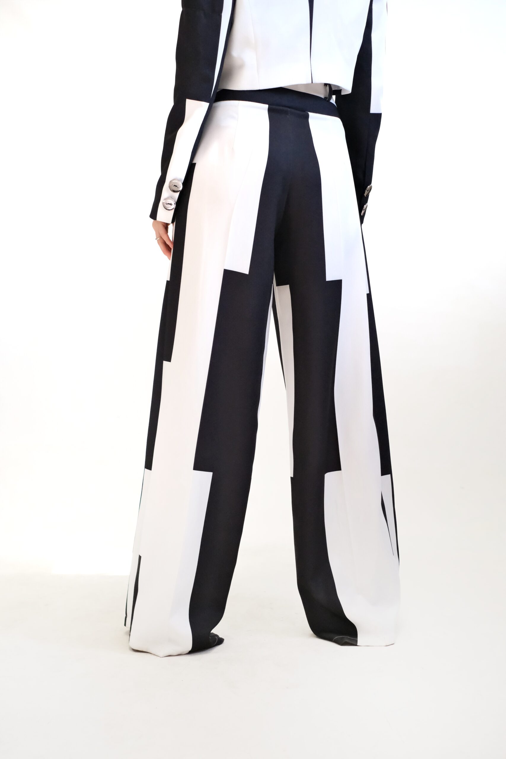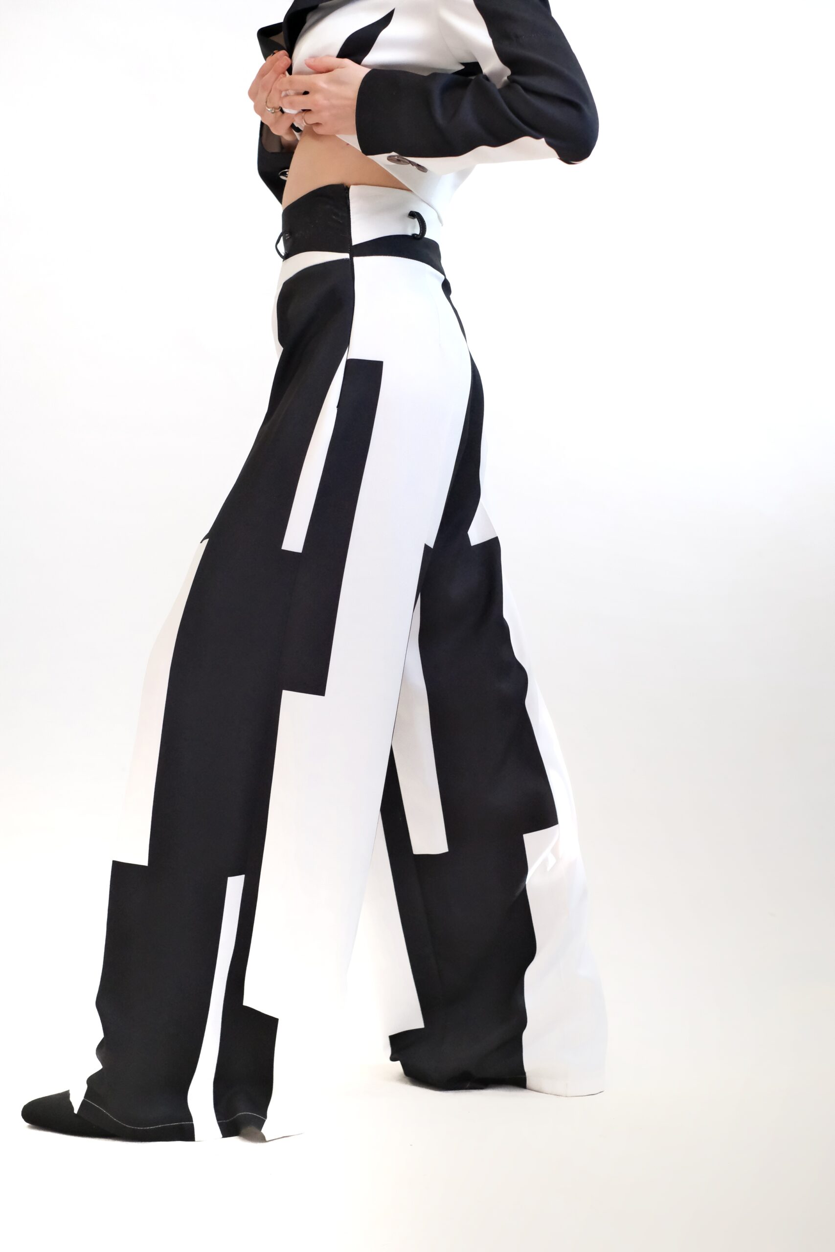 Tieto výrazné dámske nohavice typu palazzo sú stelesnením avantgardnej módy a ideálnou voľbou pre ženy, ktoré chcú vyčnievať z davu. Dominantným prvkom je asymetrický geometrický vzor v čierno-bielom prevedení, ktorý vďaka štýlu color-blocking a odlišnému rozloženiu farieb na každej nohavici dodáva modelu nečakanú dynamiku a unikátnosť.