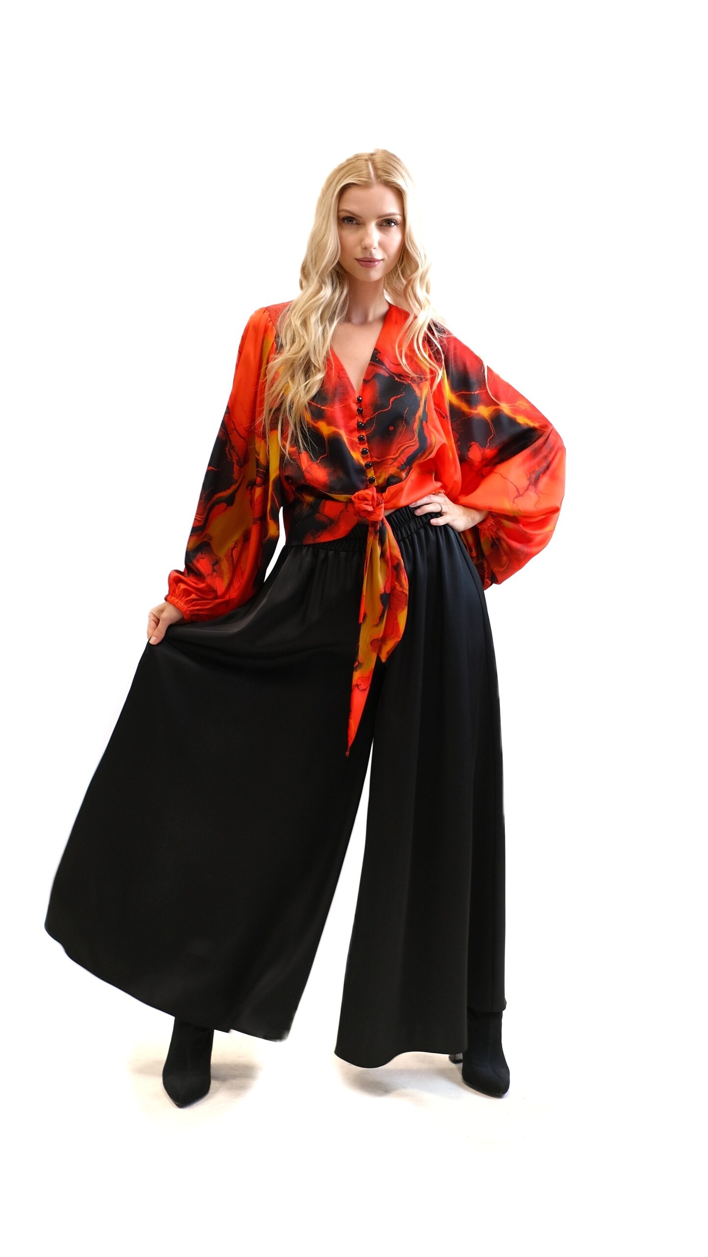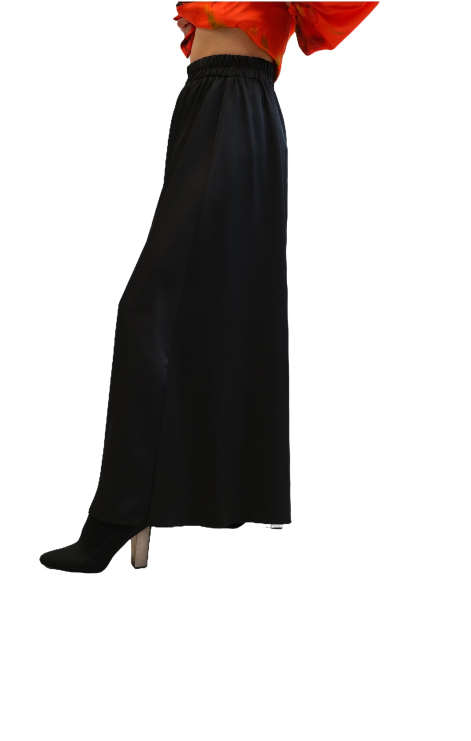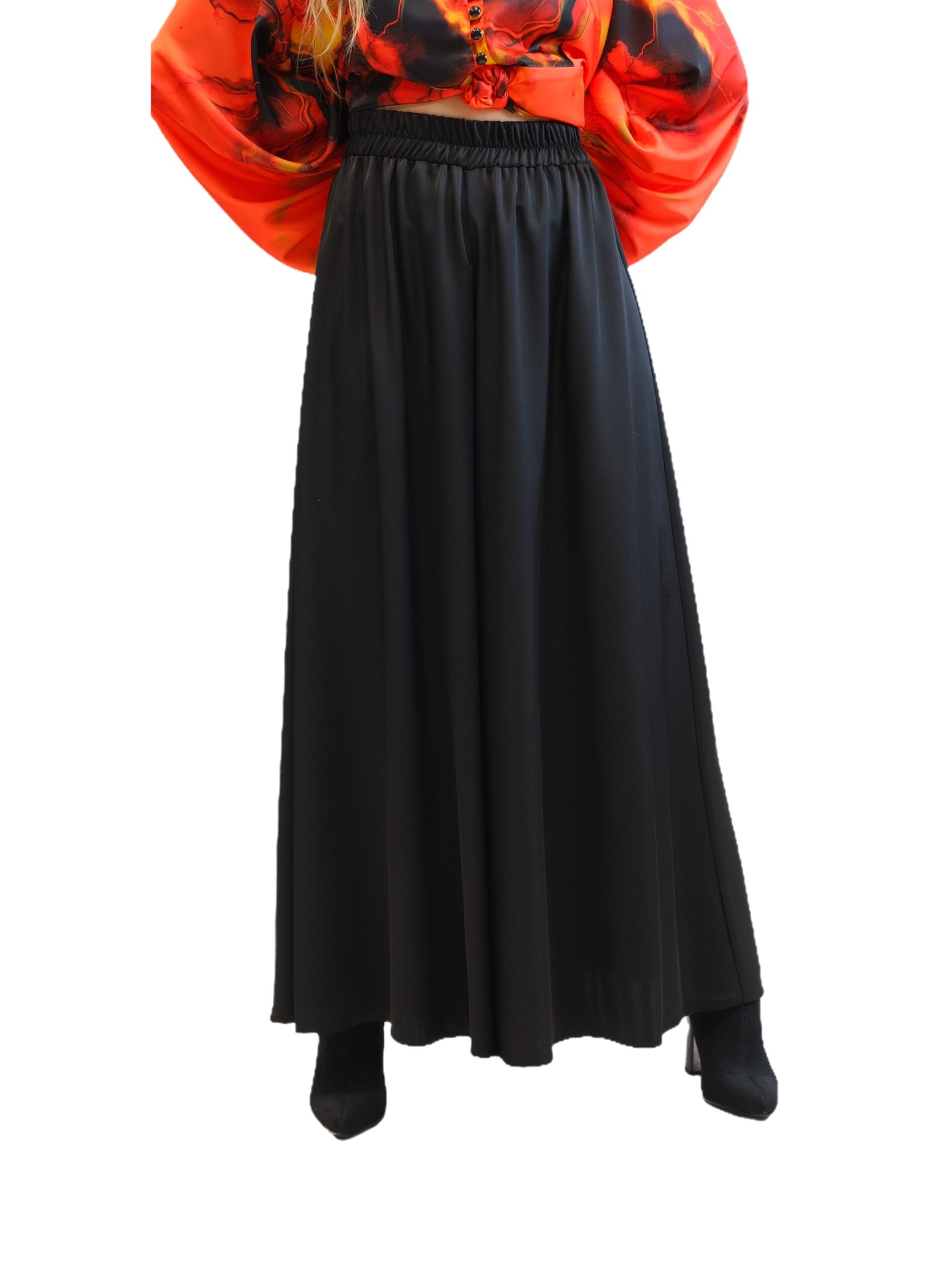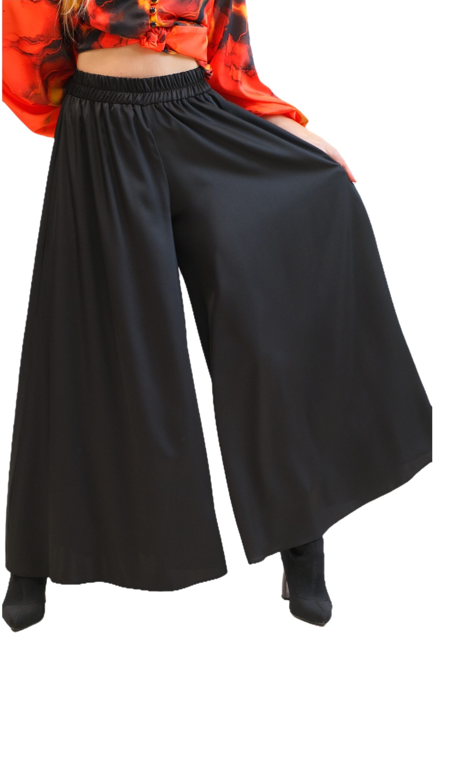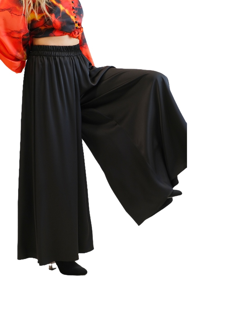 Nohavice sú navrhnuté v mimoriadne pohodlnom širokom strihu, v ktorom sa budete cítiť skvele. Nohavice sú ušité z ľahkej padavej látky, ktorá im dodáva elegantný nádych v priamom kontraste s ležérnym strihom, v ktorom sú ušité . Nohavice majú elastický pás pohodlne sa obliekajú. Nohavice pripomínajú pri stáni suknu a pri pohybe sa rozvlnia do všetkých strán. Nohavice sa dajú nosiť elegantne aj ležérne zaleží aký top k ním zvolíte. Nohavice sú ušité v nadčasovej čiernej farbe, ktorá skvele vynikne s kontrastnými farbami.
