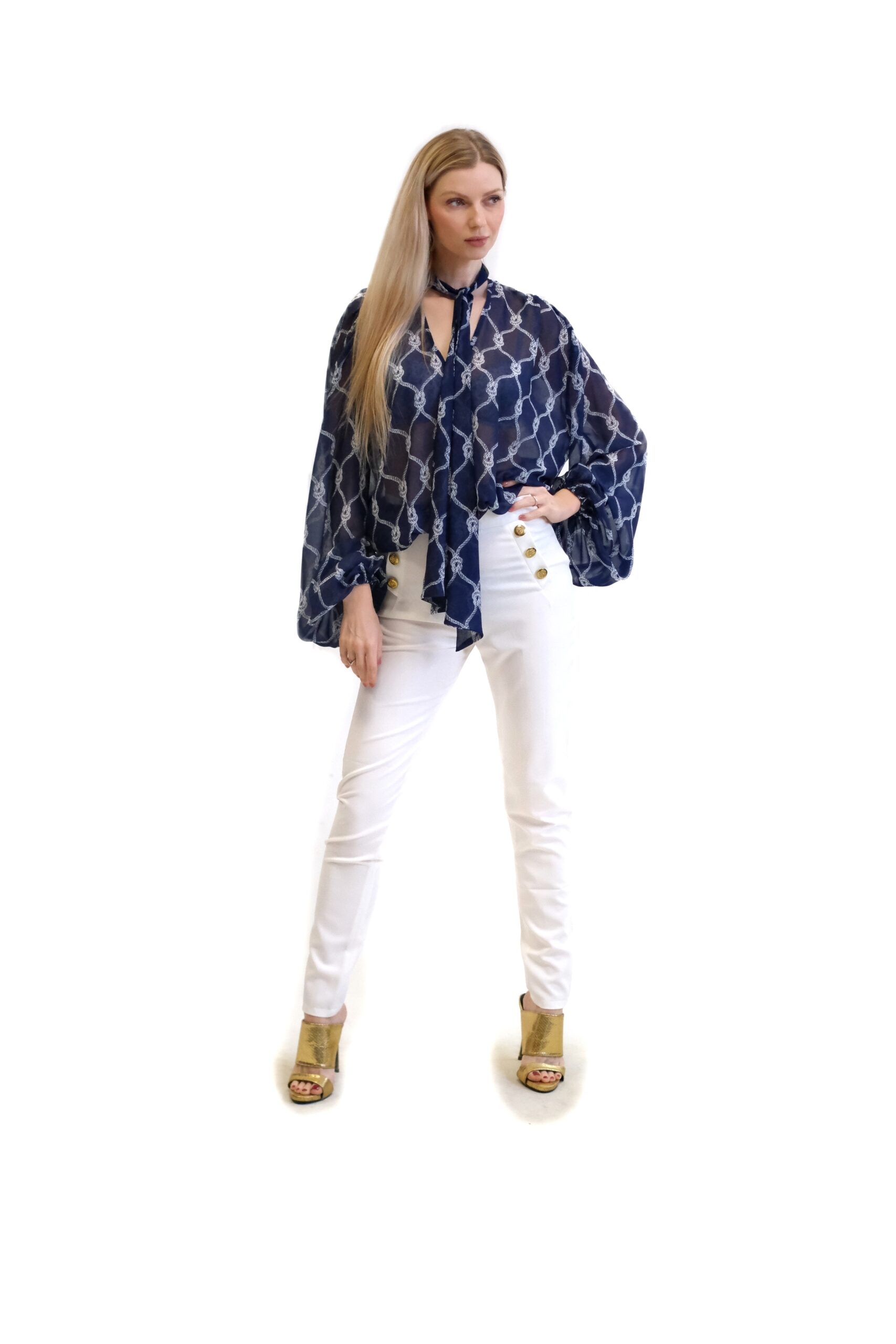 Na obrázku sú štylizované s modrou vzorovanou blúzkou a zlatými topánkami, čo vytvára elegantný a moderný outfit, ktorý je vhodný na rôzne príležitosti.