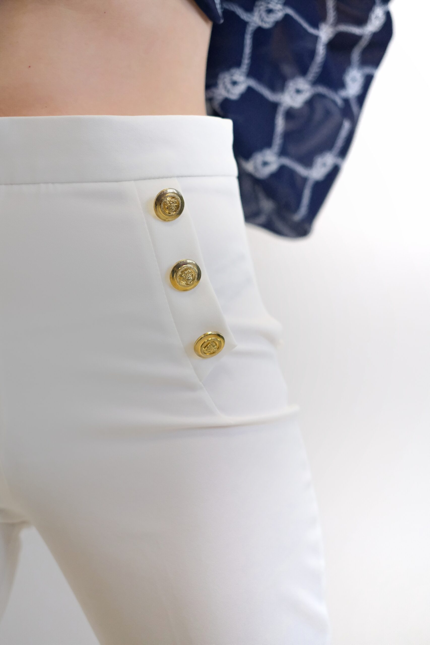Detaily: Okrem výrazných zlatých gombíkov, ktoré slúžia ako dekoratívny prvok, majú nohavice skryté zapínanie.