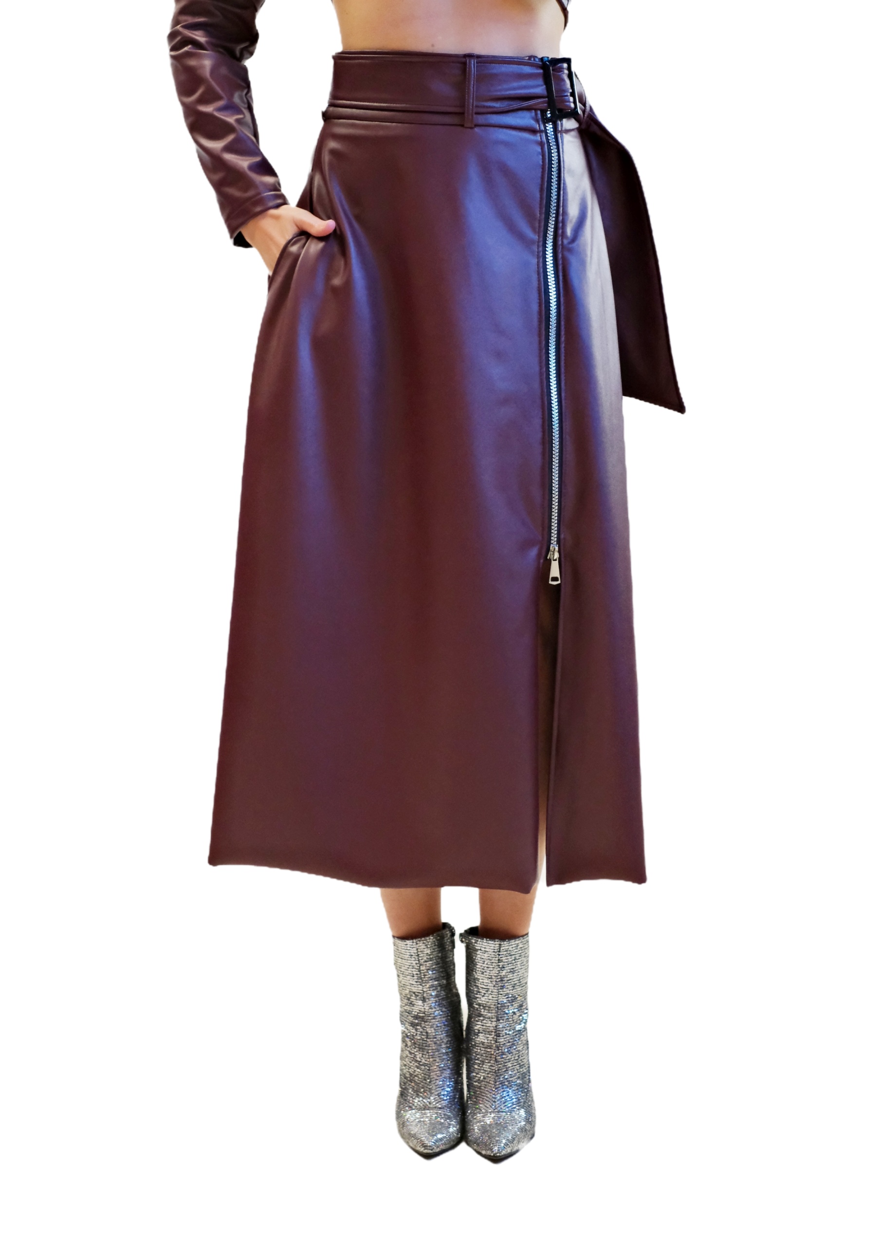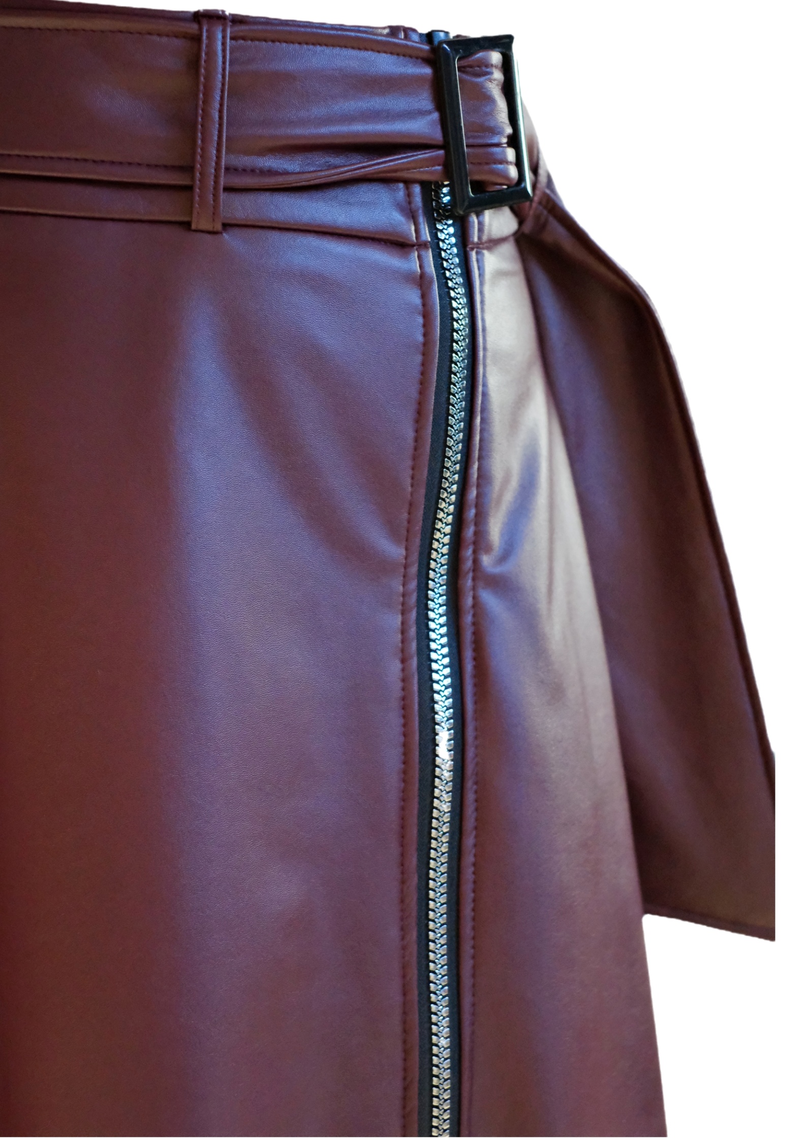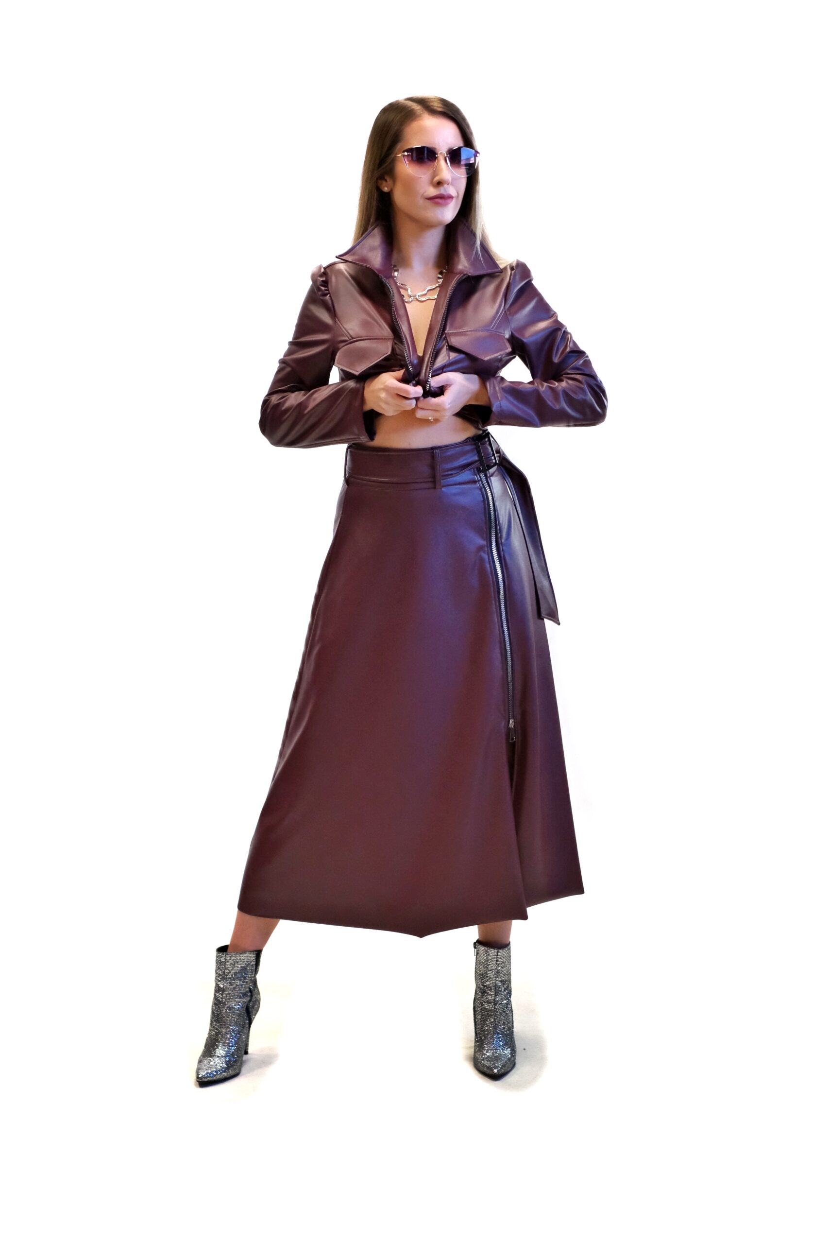 Sukňa je navrhnutá s výnimočného materiálu pripomínajúceho kožu, ktorý sa výborne prispôsobí vašej postave. Sukňa je ušitá v asymetrickom strihu v midi dĺžke, ktorá pôsobí veľmi elegantne a trendy. Sukňa má rozparok na prednom diely. Zaujímavým detailom na sukni je výrazný zips a opasok ktorý zdôrazní pás. Kombinujte to so sakom Burgundy, ktoré je taktiež v štýlovej bordovej farbe.