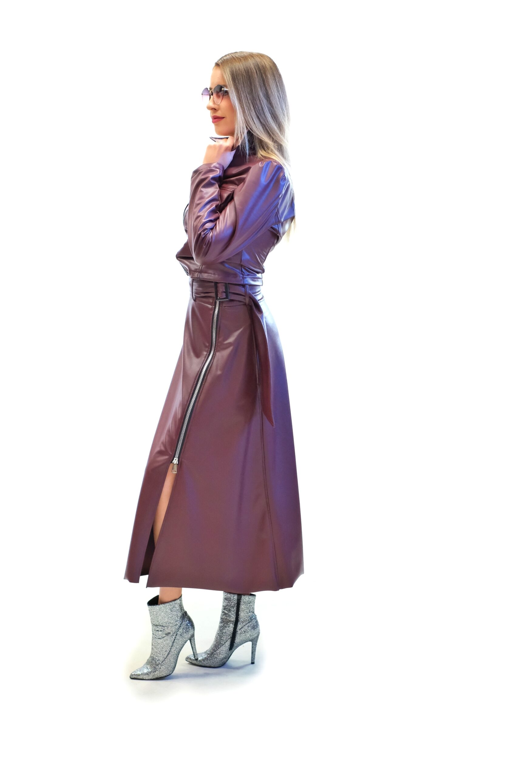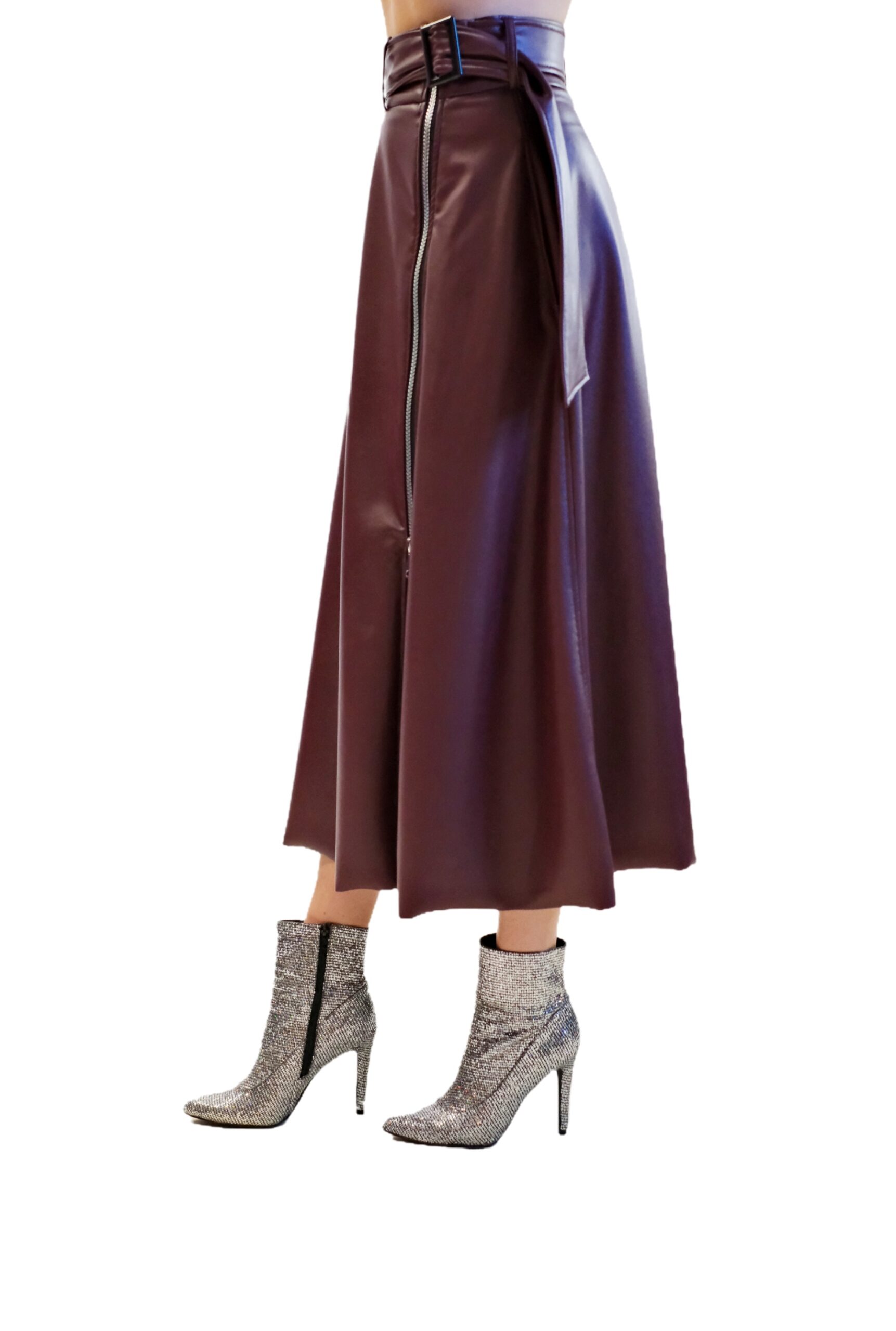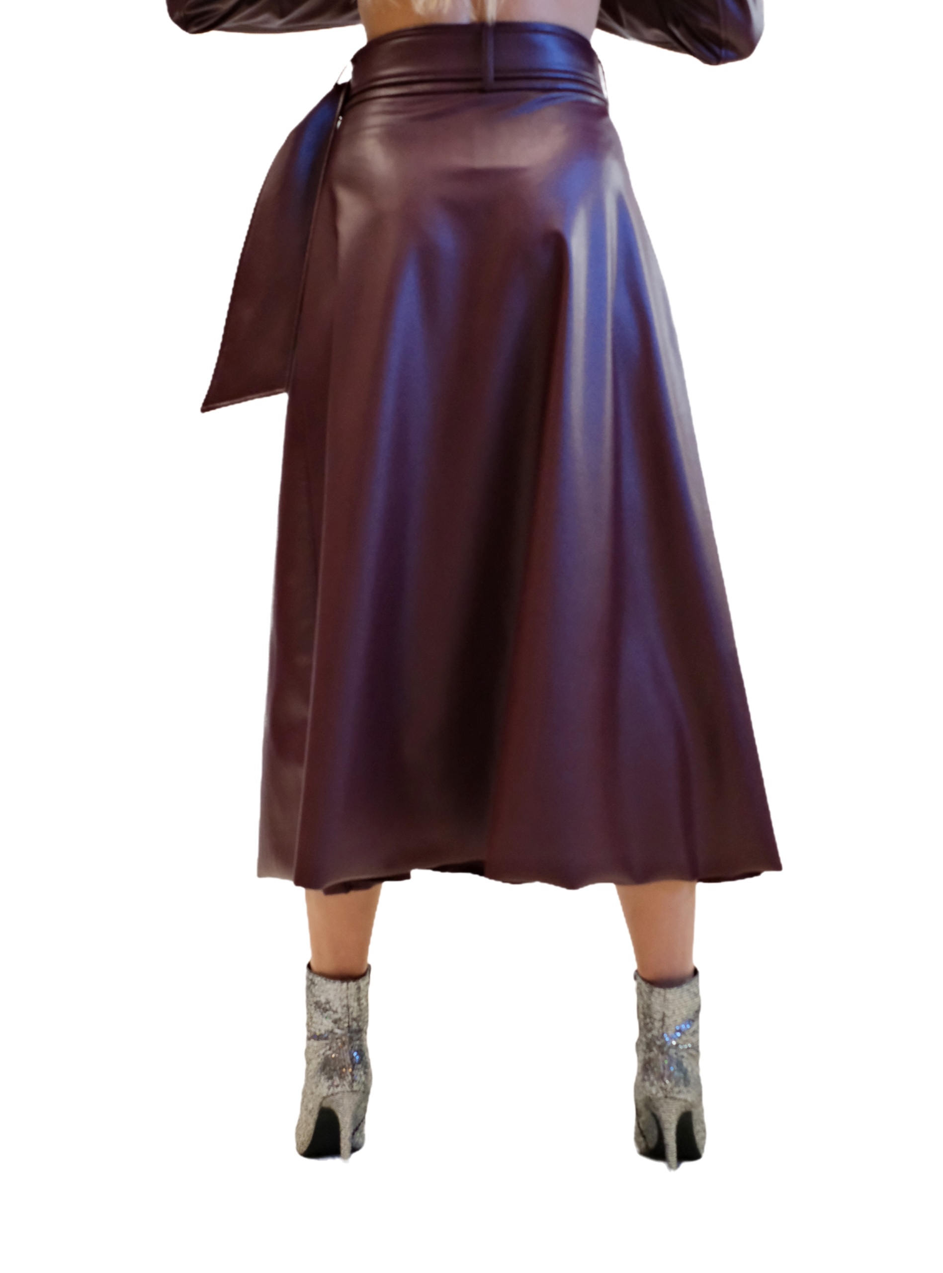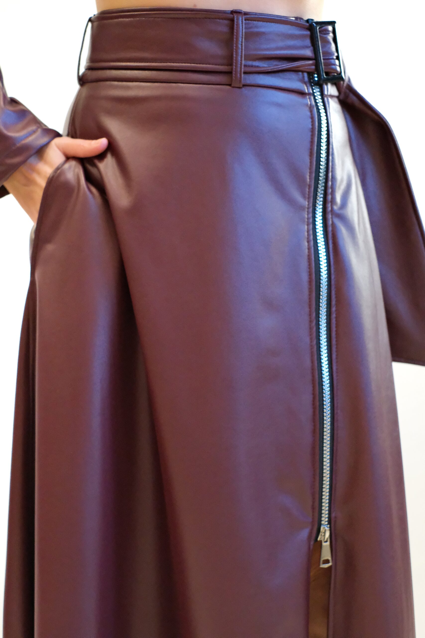 Sukňa je navrhnutá s výnimočného materiálu pripomínajúceho kožu, ktorý sa výborne prispôsobí vašej postave. Sukňa je ušitá v asymetrickom strihu v midi dĺžke, ktorá pôsobí veľmi elegantne a trendy. Sukňa má rozparok na prednom diely. Zaujímavým detailom na sukni je výrazný zips a opasok ktorý zdôrazní pás. Kombinujte to so sakom Burgundy, ktoré je taktiež v štýlovej bordovej farbe.