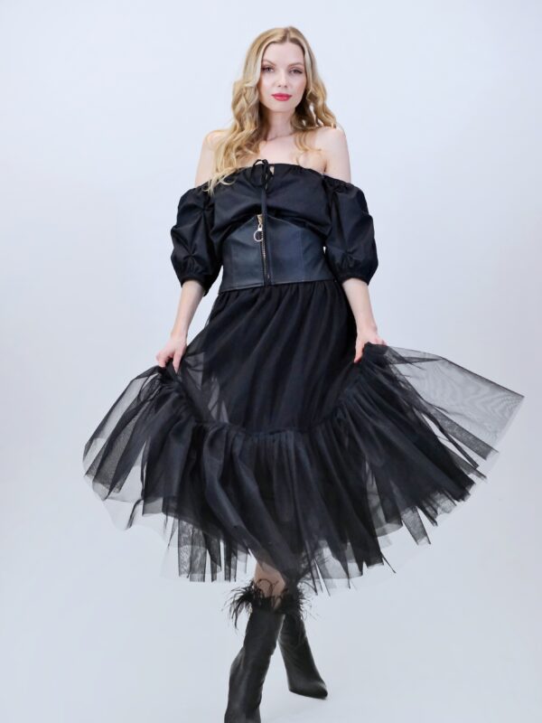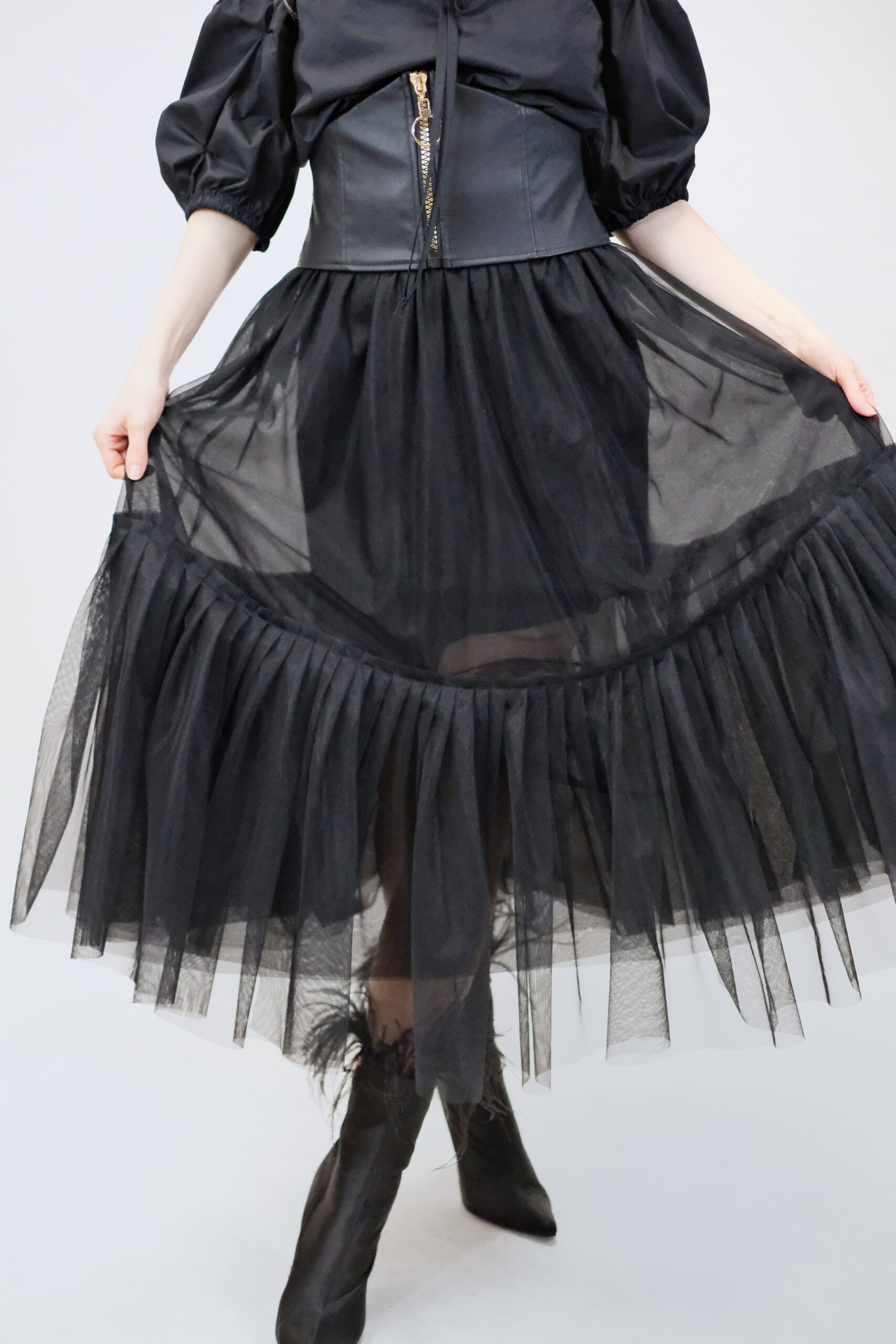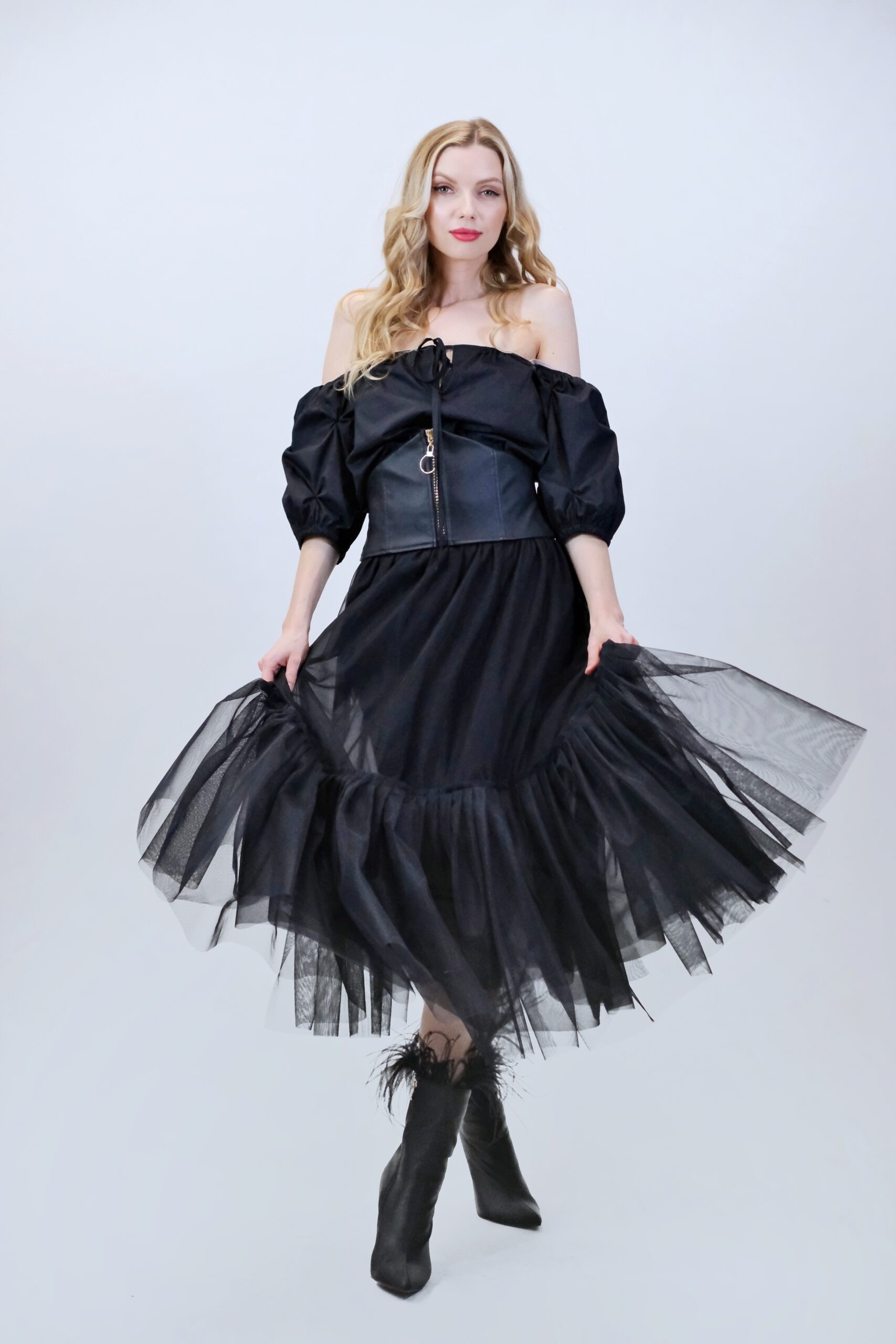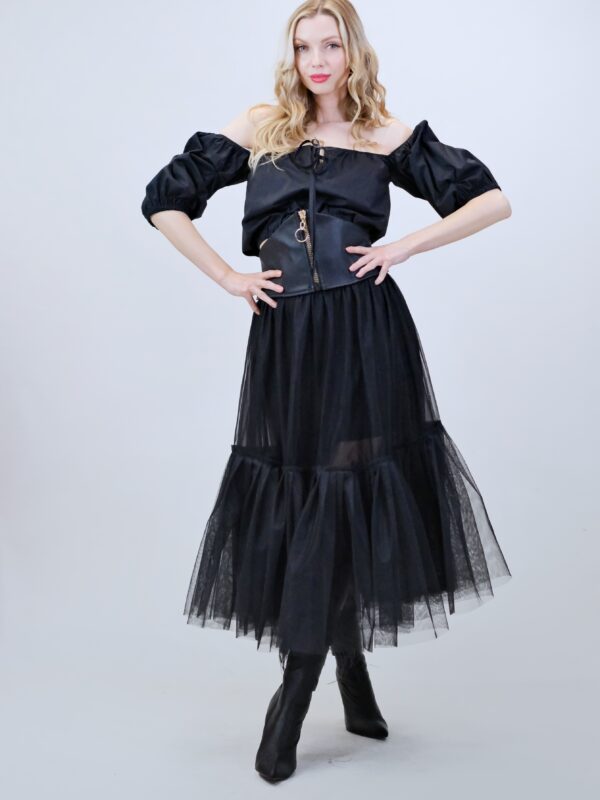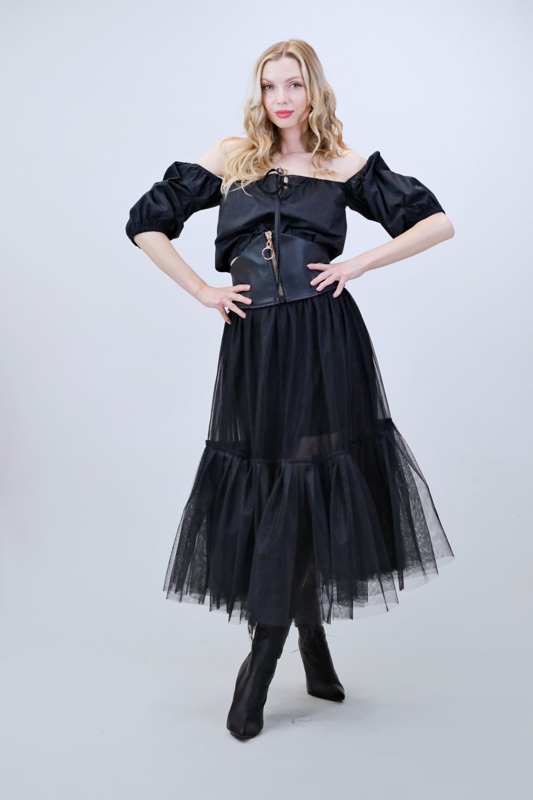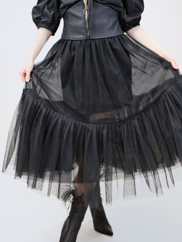 Sukňa je ušitá z nádherného jemného šifónu, ktorý vďaka svojej nepoddajnosti a vrstveniu vytvára nádherný efekt objemu. Sukňa je podšitá nepriesvitnou spodničkou z lesklého saténu, ktorá decentne splýva s tmavým šifónom. Sukňa je v spodnej časti zriasená. Sukňu poľahky skombinujete aj s jednoduchým topom alebo tričkom, ktorému hneď dodáte šmrnc. Pre wau efekt kombinujte s koženými prvkami ako naša aranžérka.