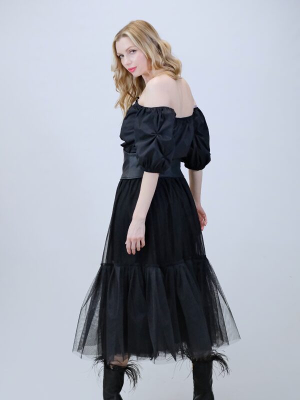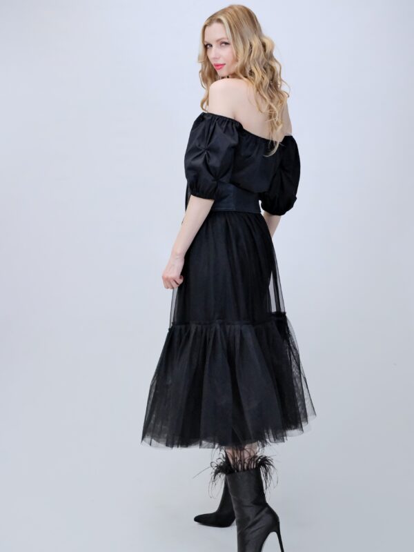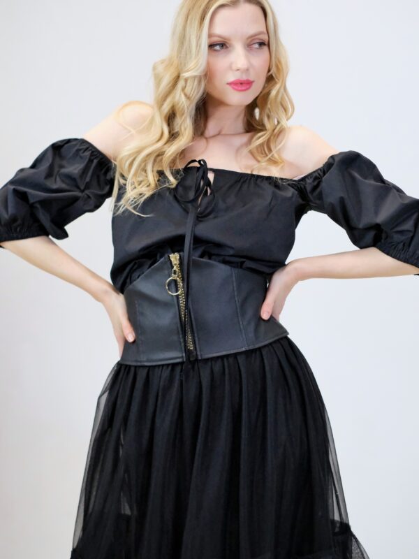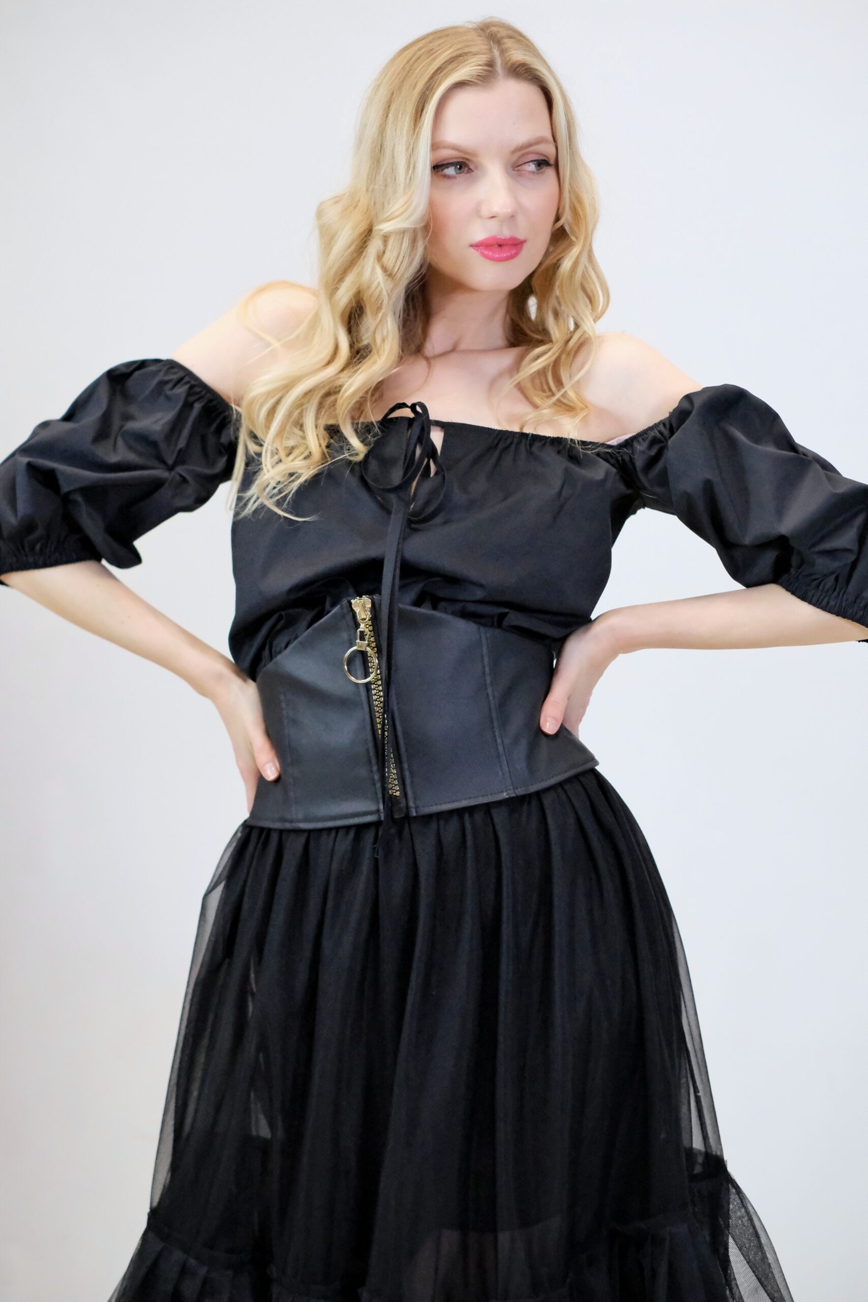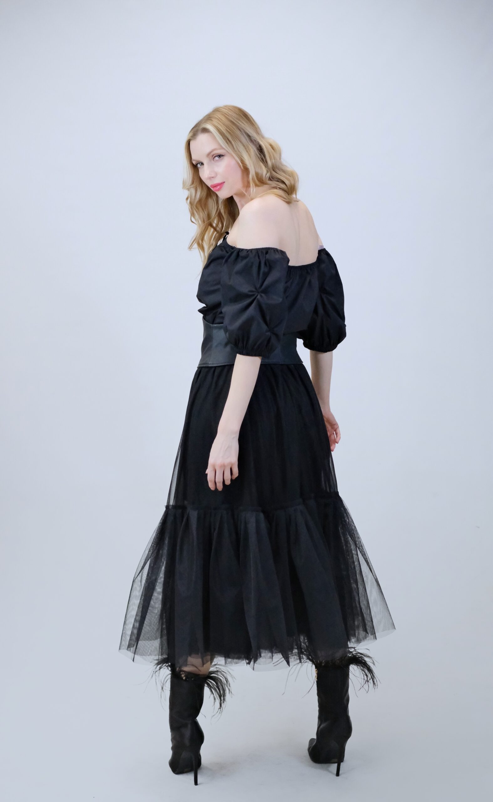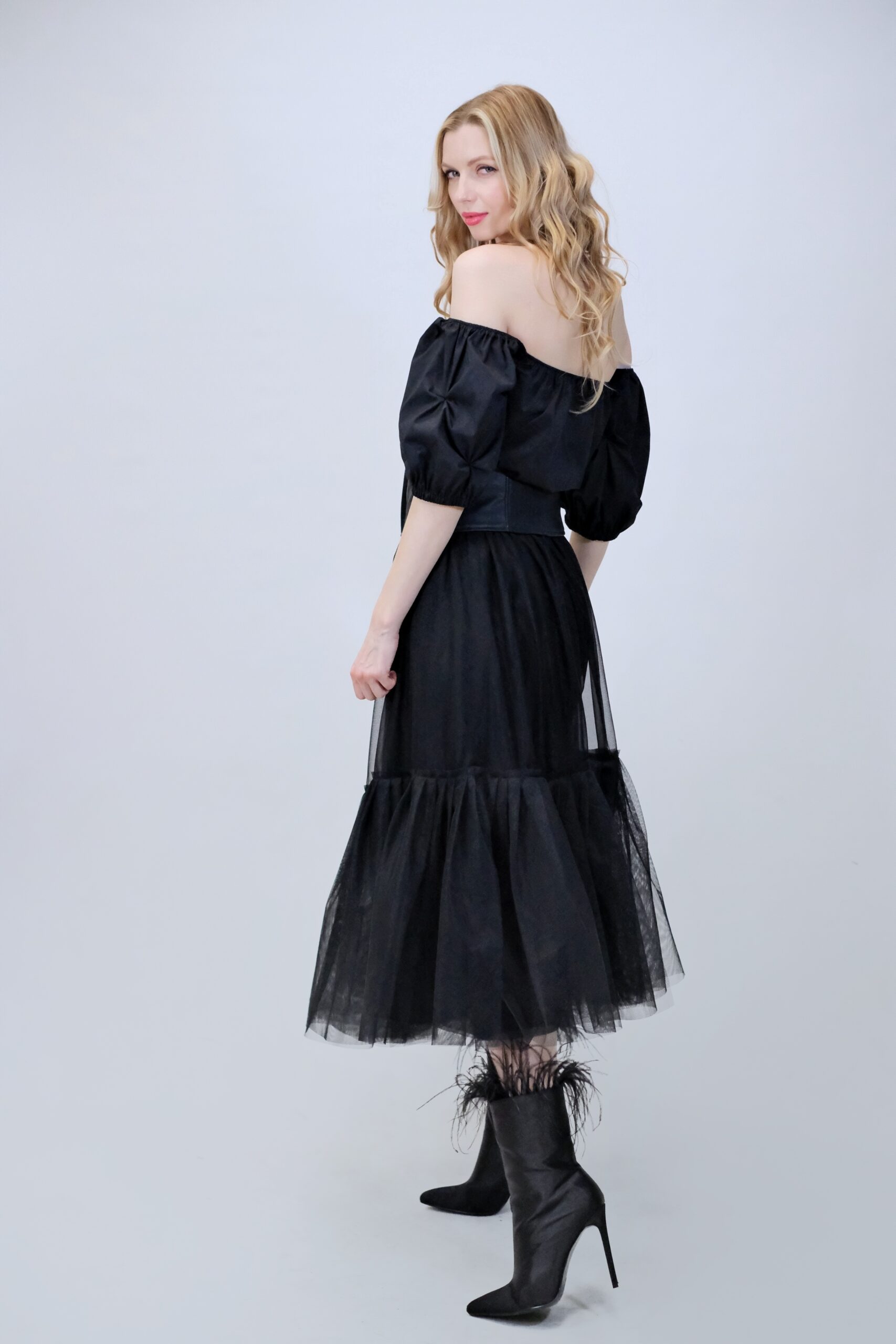 Sukňa je ušitá z nádherného jemného šifónu, ktorý vďaka svojej nepoddajnosti a vrstveniu vytvára nádherný efekt objemu. Sukňa je podšitá nepriesvitnou spodničkou z lesklého saténu, ktorá decentne splýva s tmavým šifónom. Sukňa je v spodnej časti zriasená. Sukňu poľahky skombinujete aj s jednoduchým topom alebo tričkom, ktorému hneď dodáte šmrnc. Pre wau efekt kombinujte s koženými prvkami ako naša aranžérka.