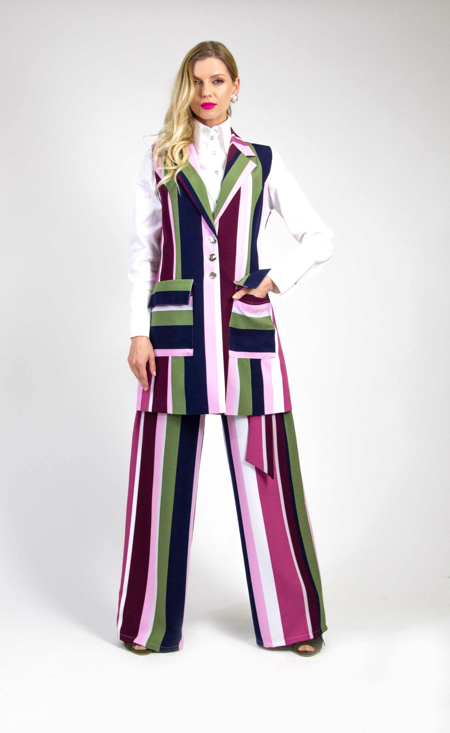 Jednoduché nohavice so zvýšeným pásom a s zaväzovaním v páse. Nohavice sú pozvoľna sa rozširujúce smerom do spodnej časti. Vhodné pre ležerný outfit. Nohavice majú pásikavý vzor s farbami leta aj jeseňe.
