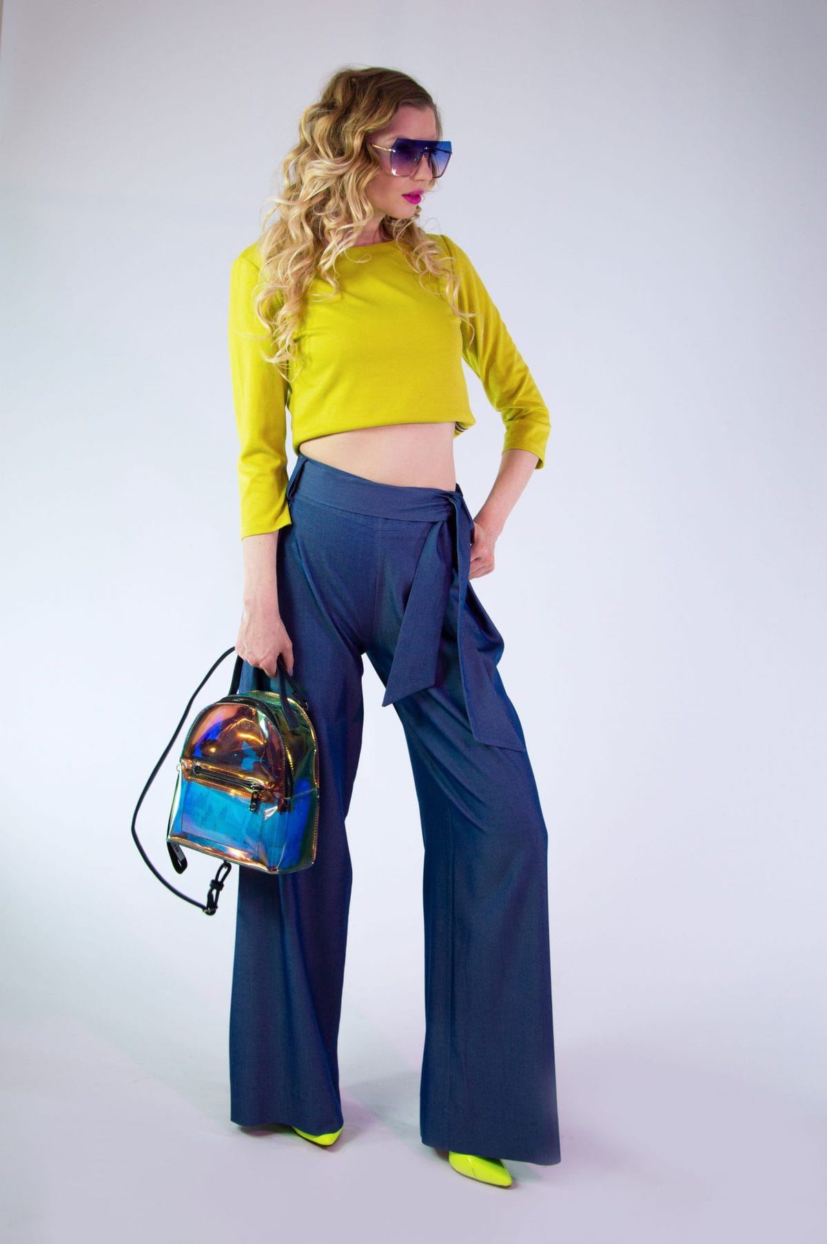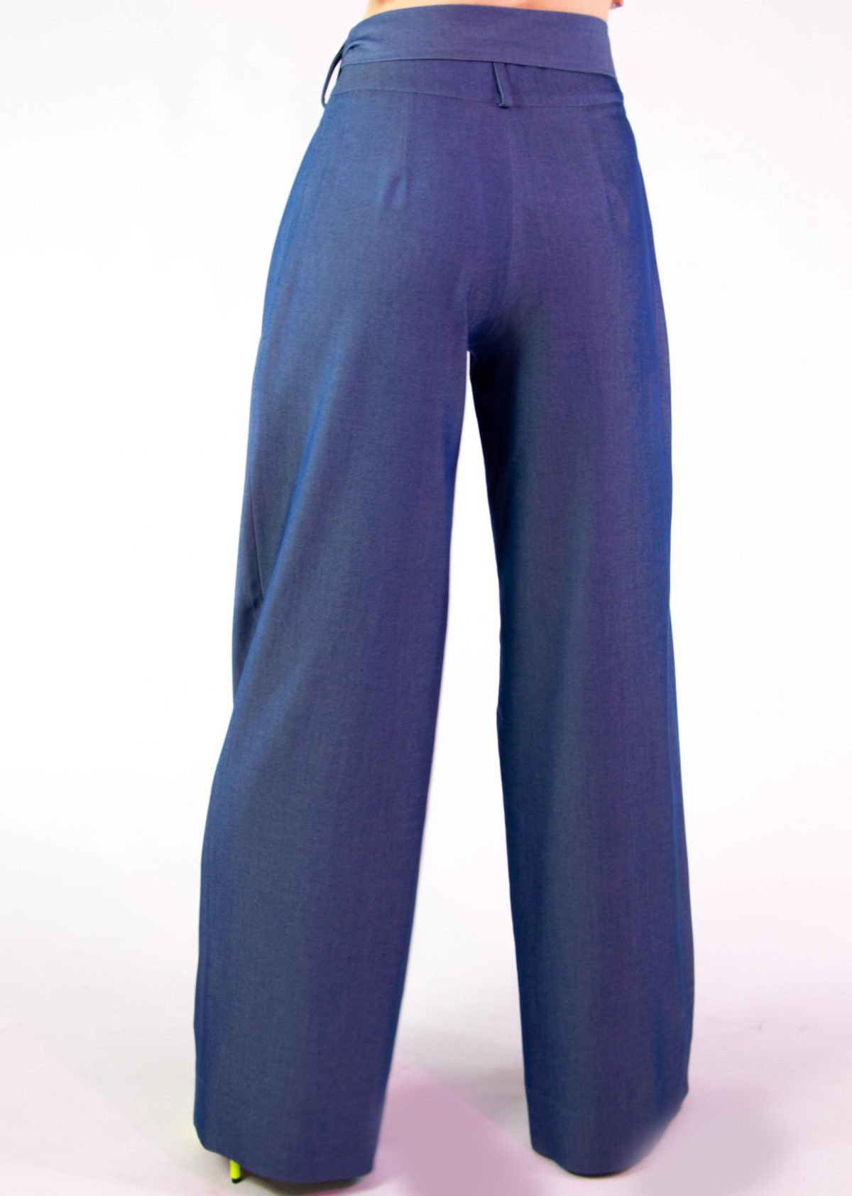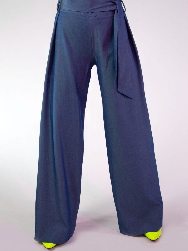 Nohavice ušité v pohodlnom voľnom strihu so zvýšeným pásom. Nohavice sú ušité z materiálu pripomínajúceho denim. Nohavice majú funkčný opasok, ktorý sa dá uviazať aj na mašľu. Vďaka univerzálnemu materiálu ich viete ľahko skombinovať s Vaším šatníkom.