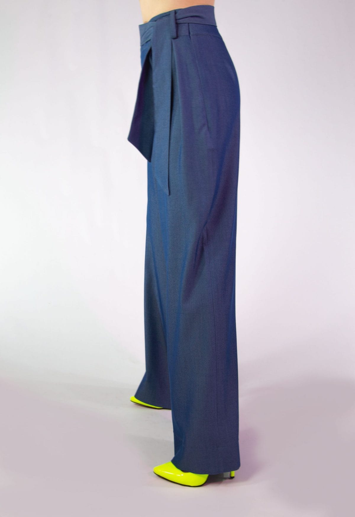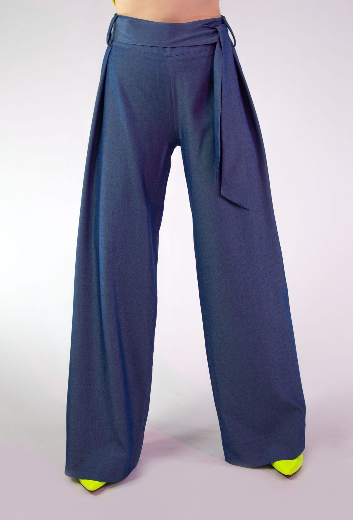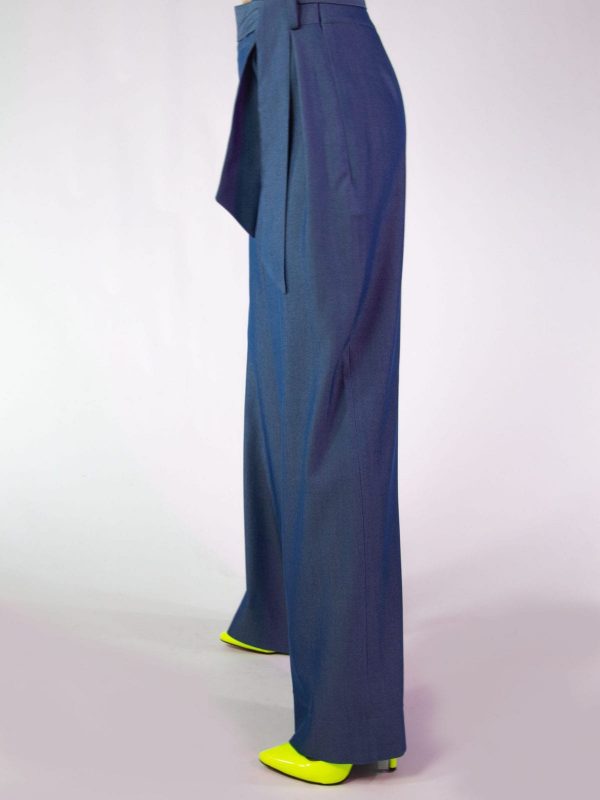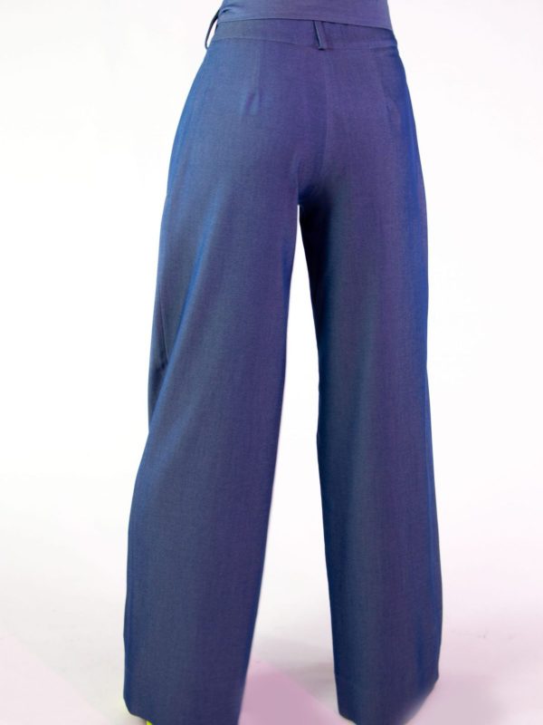 Nohavice ušité v pohodlnom voľnom strihu so zvýšeným pásom. Nohavice sú ušité z materiálu pripomínajúceho denim. Nohavice majú funkčný opasok, ktorý sa dá uviazať aj na mašľu. Vďaka univerzálnemu materiálu ich viete ľahko skombinovať s Vaším šatníkom.