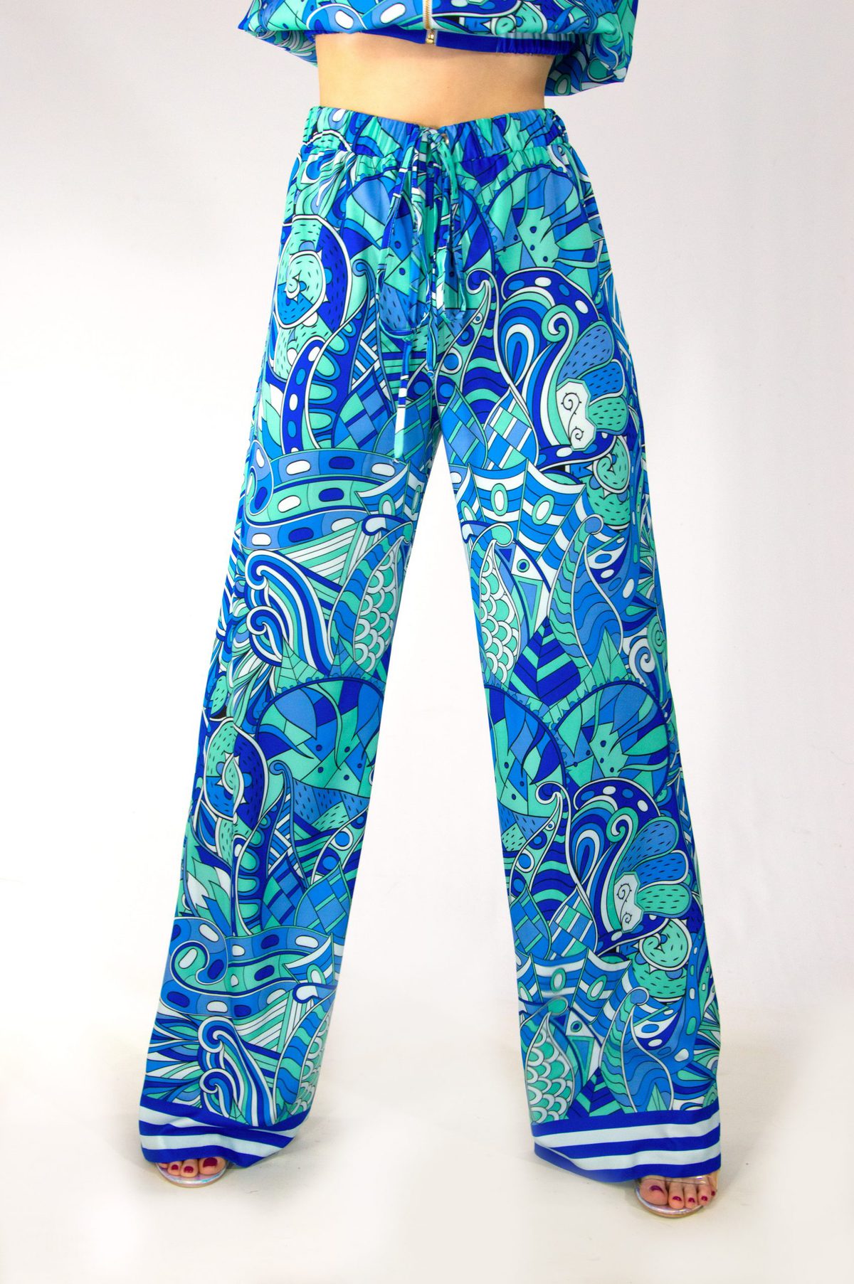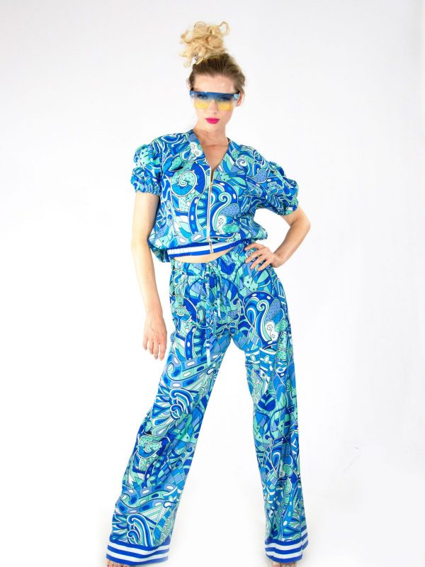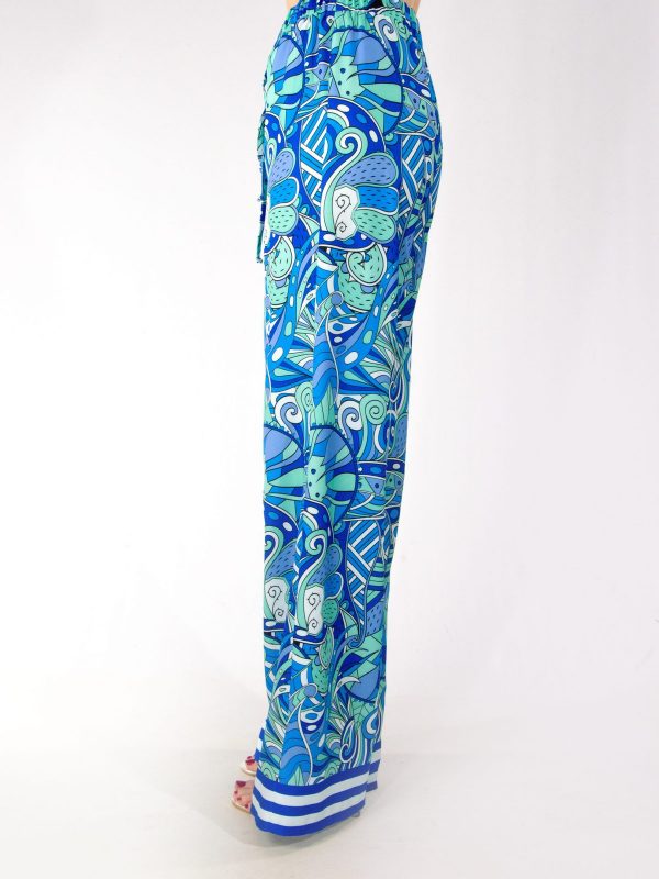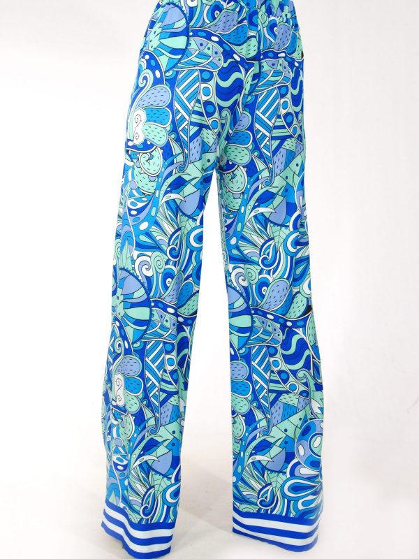 Výrazný orientálny vzor hrá všetkými odtieňmi modrej farby a skvele sa hodí aj na prechodné obdobie po lete. Nohavice sú ušité v pohodlnom širokom strihu s gumičkou v páse, takže o komfort máte postarané. Zaujímavým detailom, ktorú nohaviciam dodáva námornícky look s nádychom gréckych ostrovov je práve pružkový patent, ktorým sú lemované. Pre ucelený look skombinujte s Bomberou Fishy.
