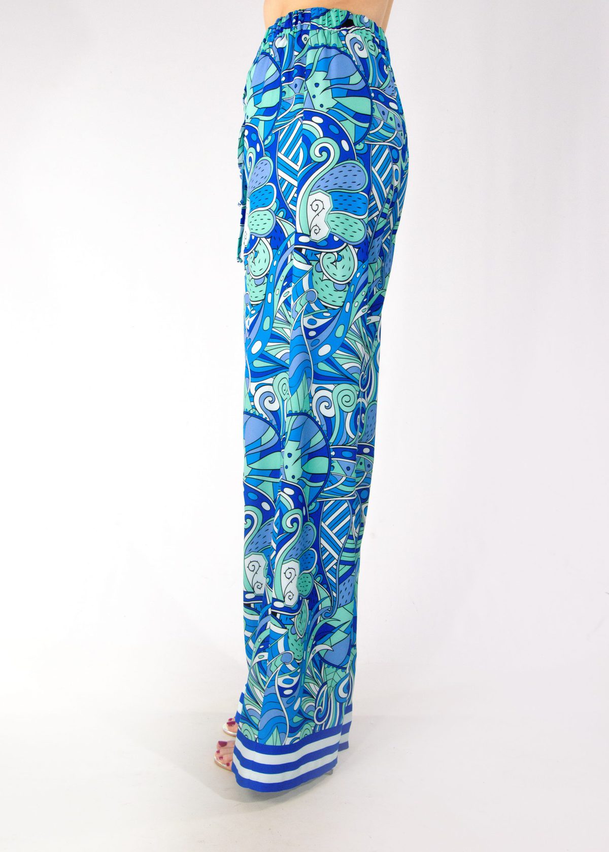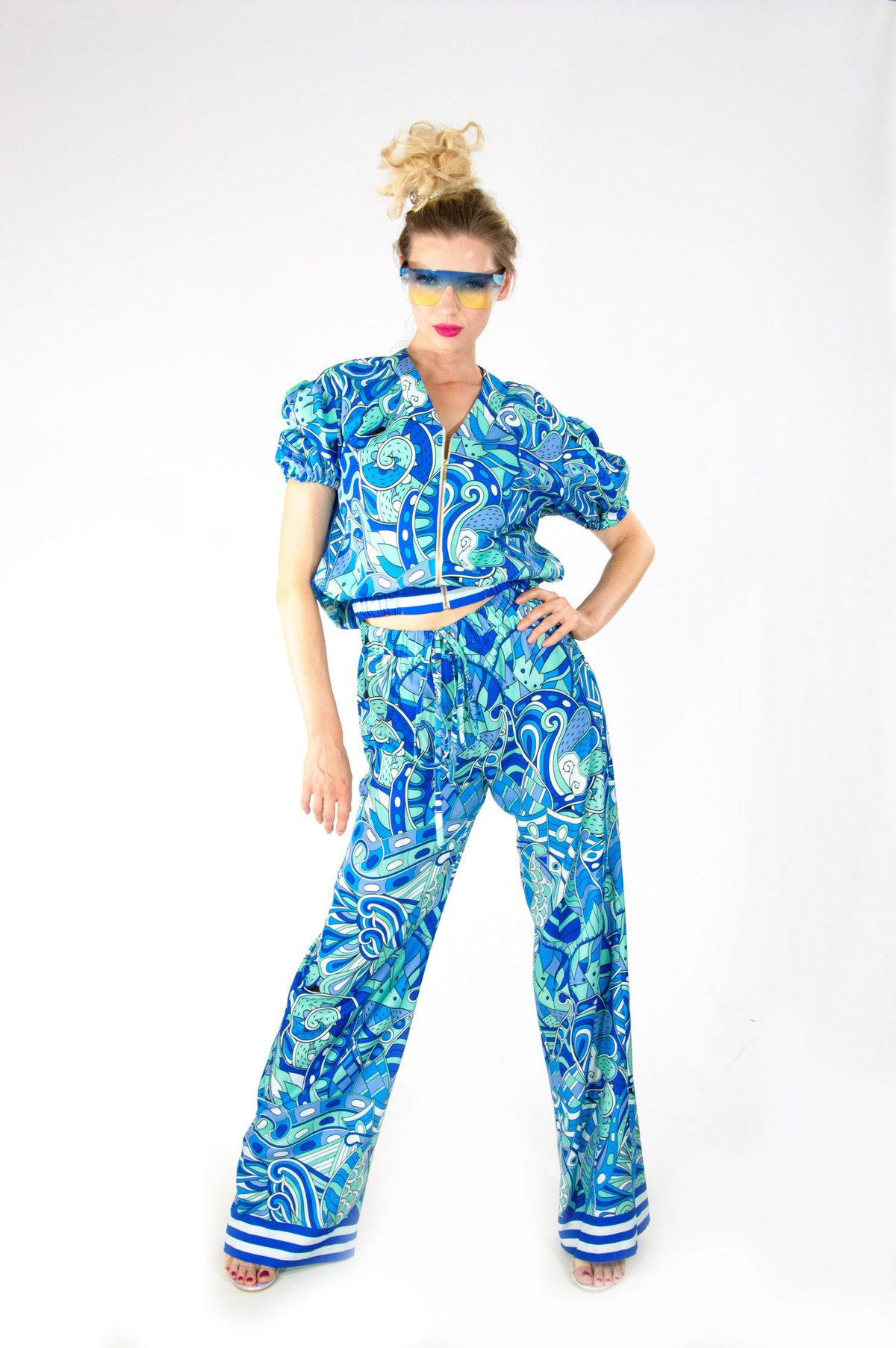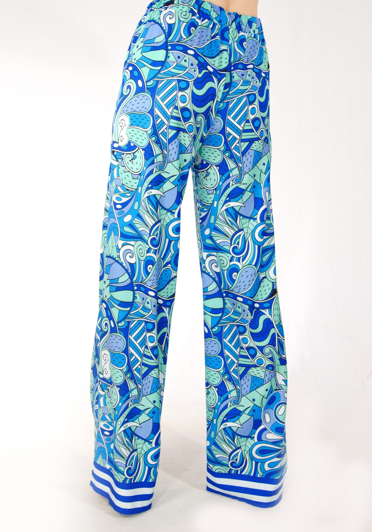 Výrazný orientálny vzor hrá všetkými odtieňmi modrej farby a skvele sa hodí aj na prechodné obdobie po lete. Nohavice sú ušité v pohodlnom širokom strihu s gumičkou v páse, takže o komfort máte postarané. Zaujímavým detailom, ktorú nohaviciam dodáva námornícky look s nádychom gréckych ostrovov je práve pružkový patent, ktorým sú lemované. Pre ucelený look skombinujte s Bomberou Fishy.