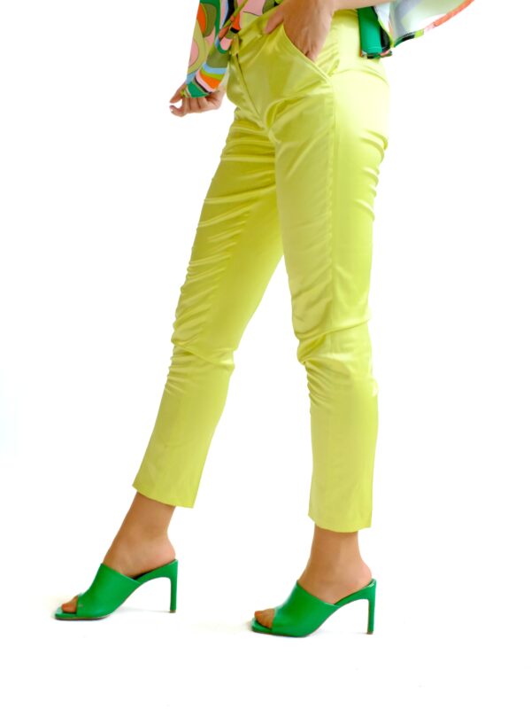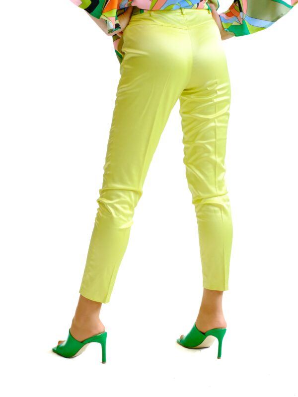 Nohavice sú ušité v úzkou strihu z pohodlného materiálu, ktorý sa prispôsobí postave. Nohavice sú navrhnuté v žiarivej citrónovo žltej farbe, ktorá sa skvele kombinuje s tmavými ako aj jasnými farbami. Nohavice majú zvýšený pás.