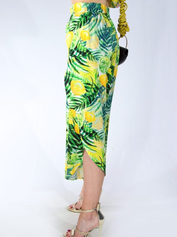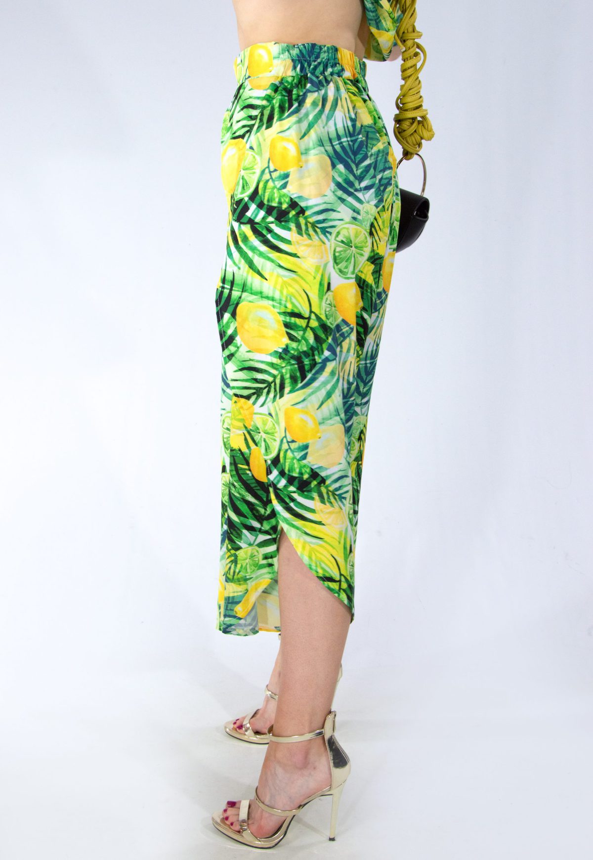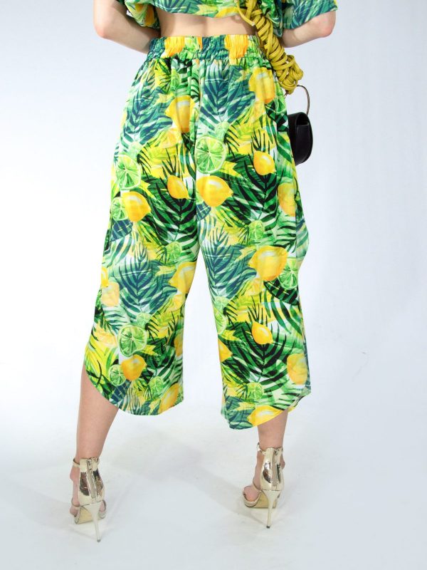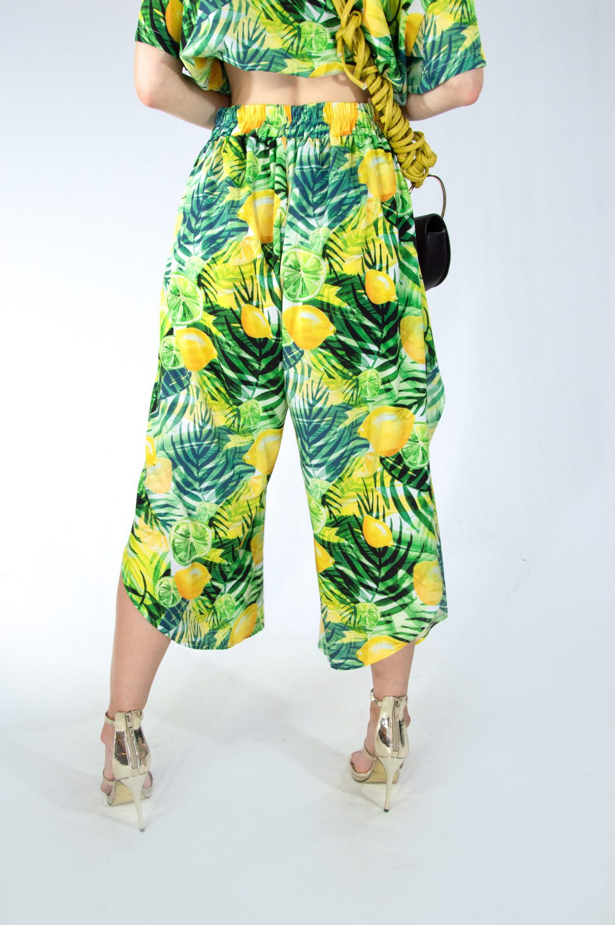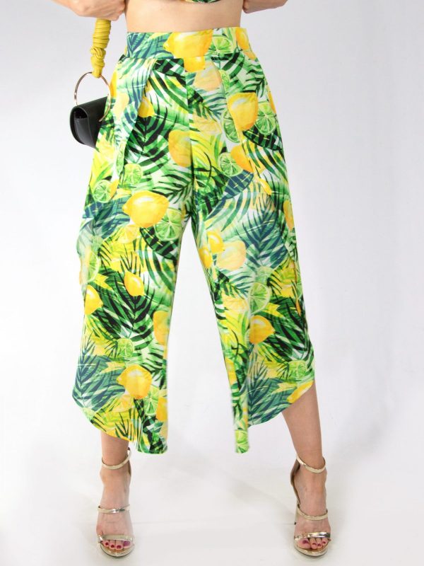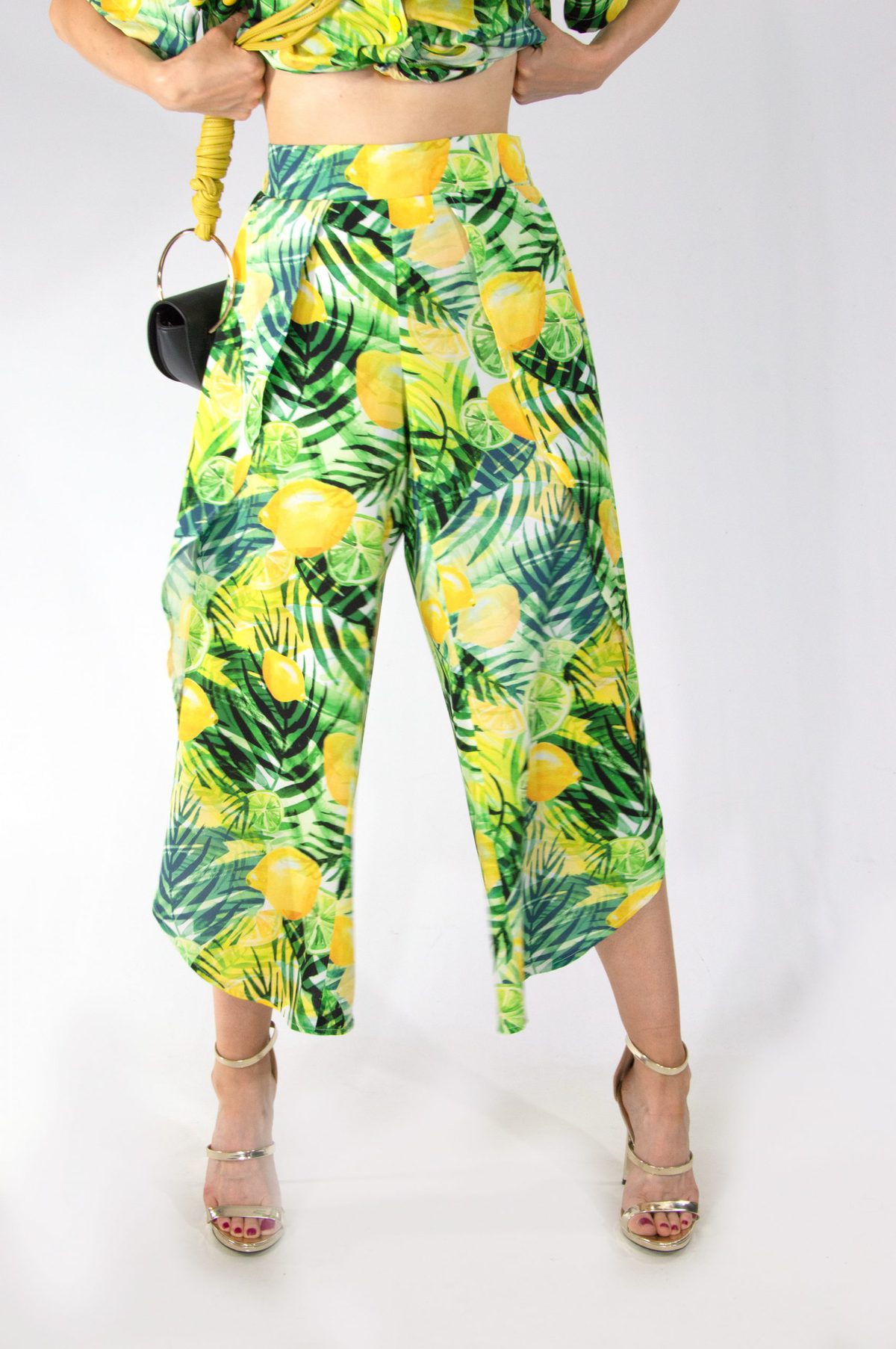 Nohavice ušité v rafinovanom letnom strihu pripomínajúcemu zatvárajúce sa lupene ruží. Pri pohybe môžu pôsobiť aj ako sukňa. Nohavice majú výrazný letný vzor citrónu, ktorý žiari odtieňmi žltej a zelenej. Zladte s žltými doplnkami pre svieži letný look.