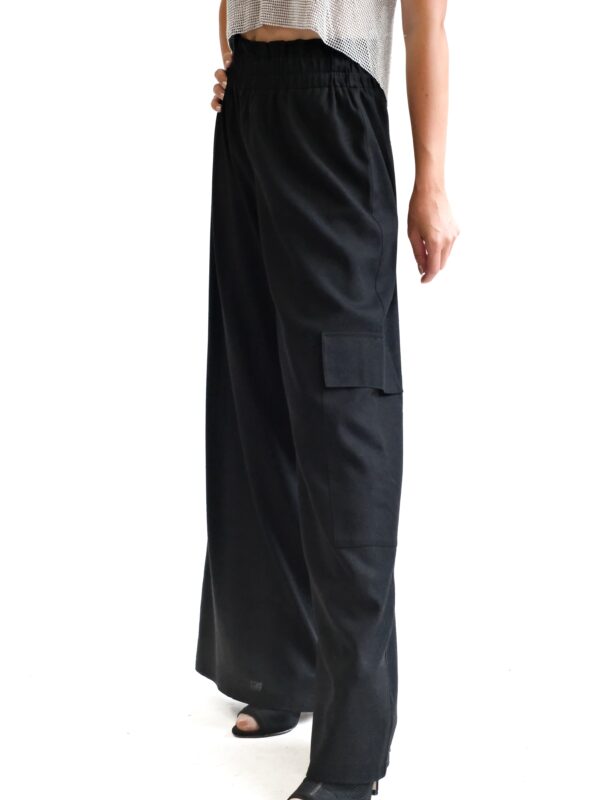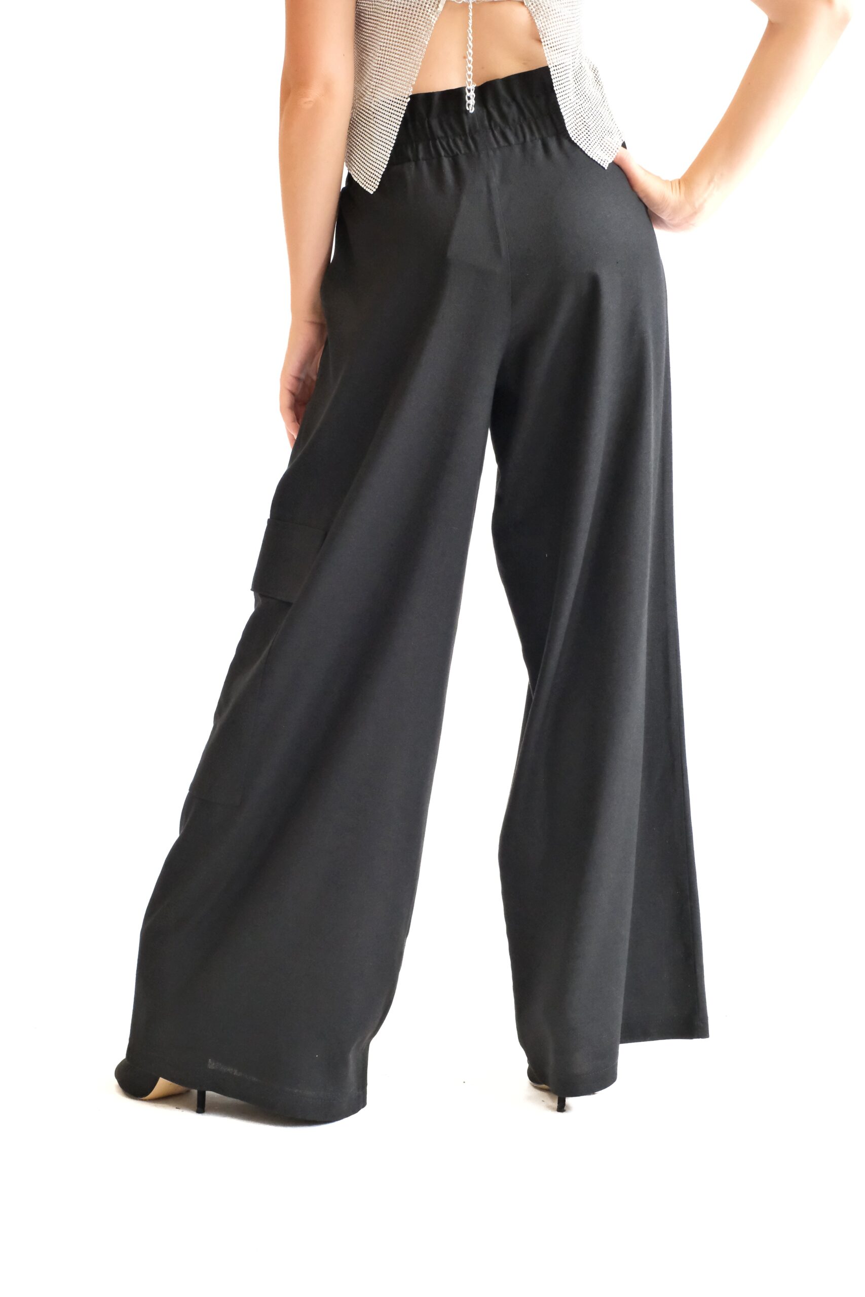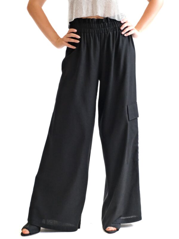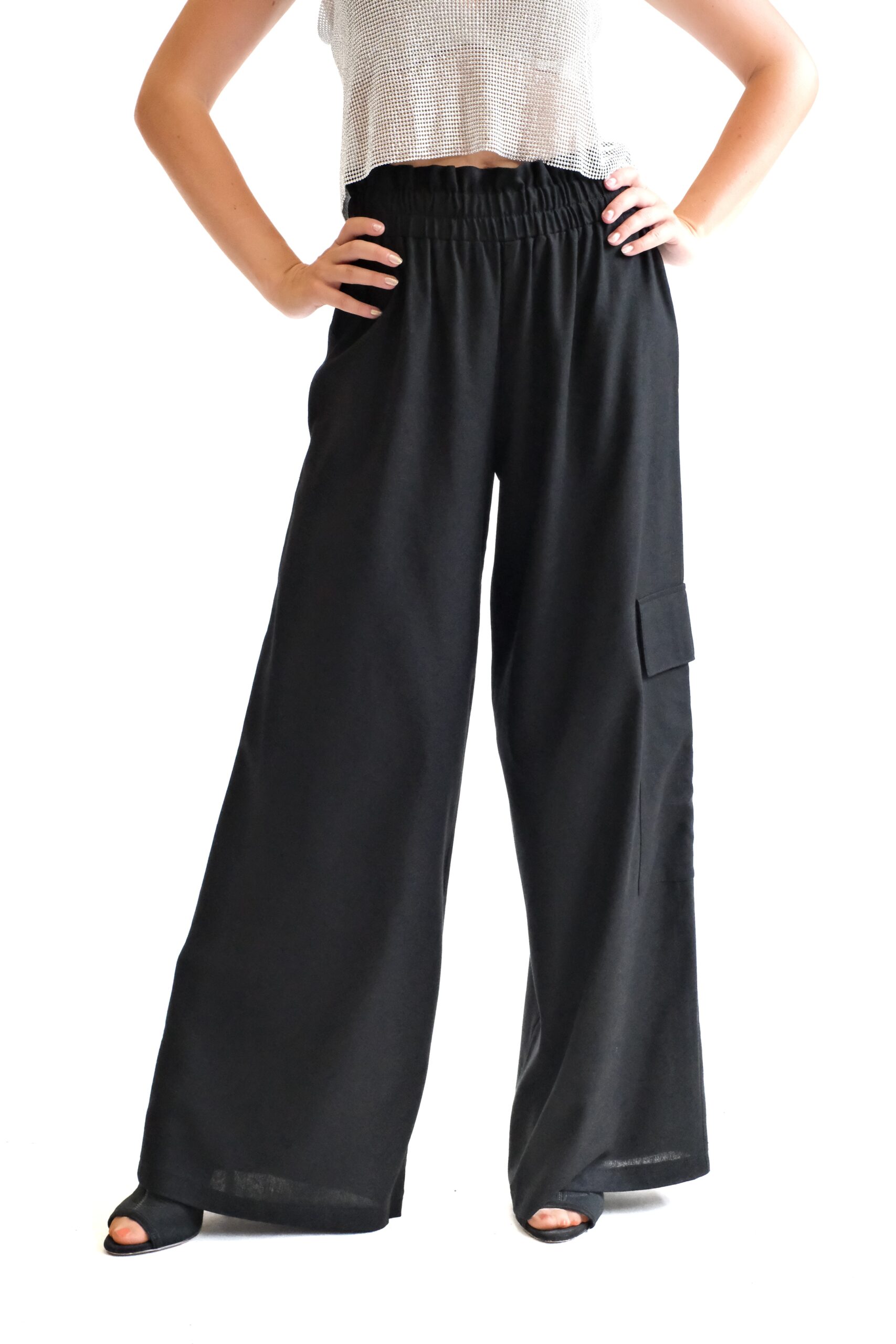 Nohavice sú ušité v širokom strihu s gumičkou v páse, ktorá im v kombinácii s priedušným a ľahkým materiálom dodáva komfort, v ktorom sa budete cítiť výborne aj počas horúcich letných dní. Nohavice majú našité jedno asymetrické vrecko. Nohavice sú ušité v nesmrteľnej čiernej farbe, ktorá sa výborne kombinuje s celým šatníkom. Pre kompletný look obliekajte spolu so Sakom Ostirie.
