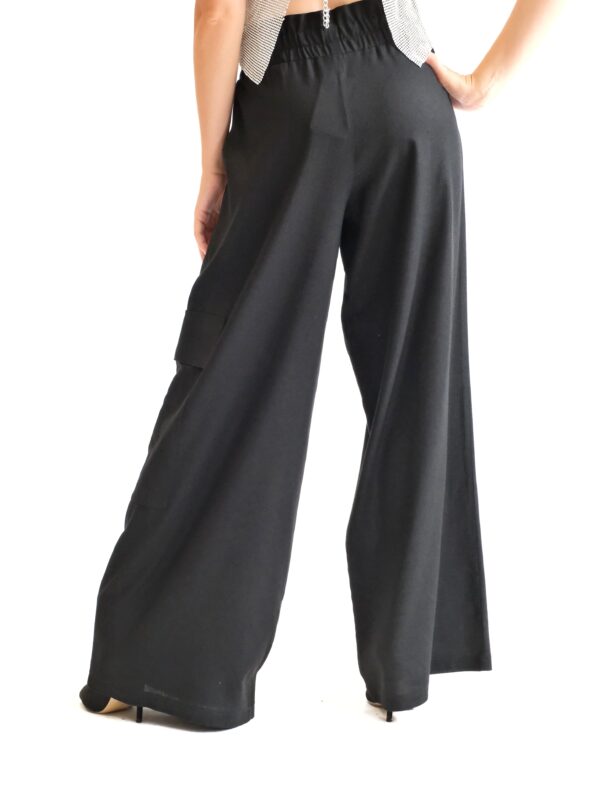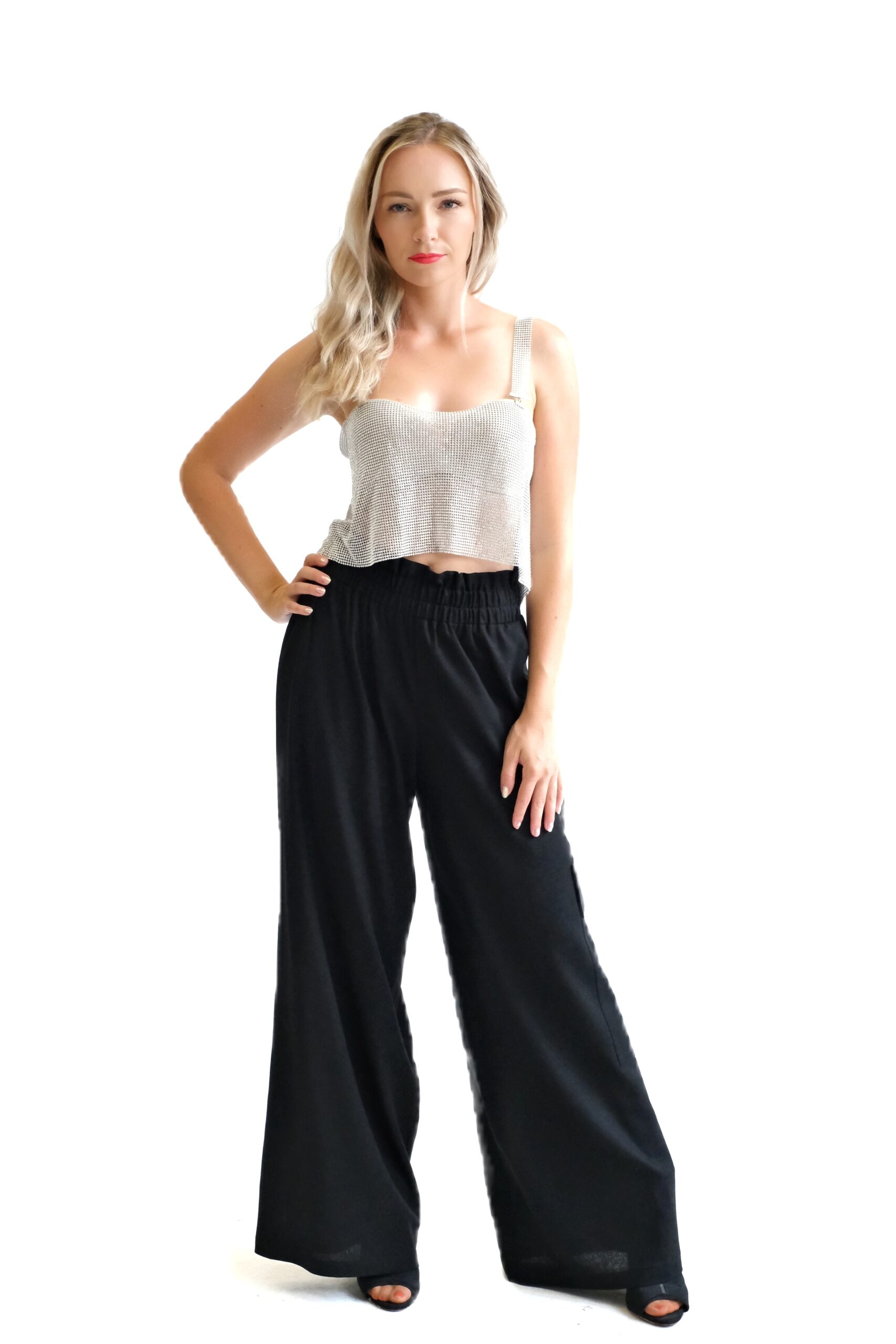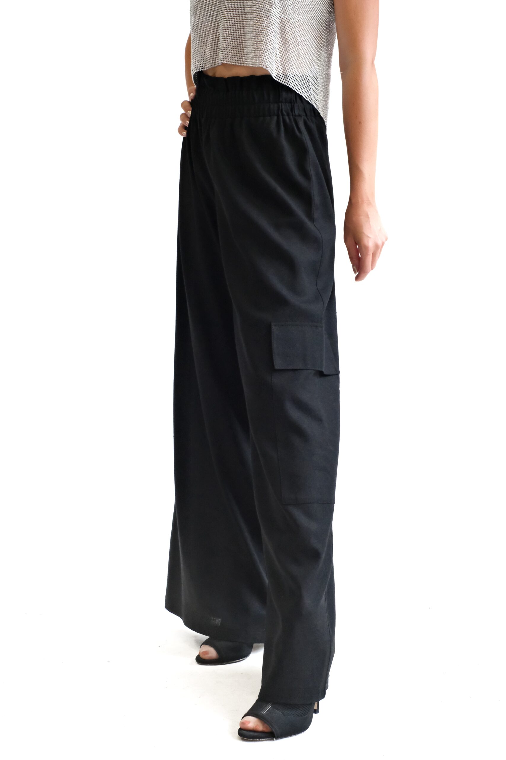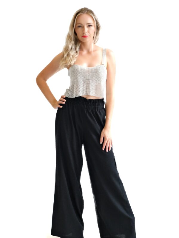 Nohavice sú ušité v širokom strihu s gumičkou v páse, ktorá im v kombinácii s priedušným a ľahkým materiálom dodáva komfort, v ktorom sa budete cítiť výborne aj počas horúcich letných dní. Nohavice majú našité jedno asymetrické vrecko. Nohavice sú ušité v nesmrteľnej čiernej farbe, ktorá sa výborne kombinuje s celým šatníkom. Pre kompletný look obliekajte spolu so Sakom Ostirie.
