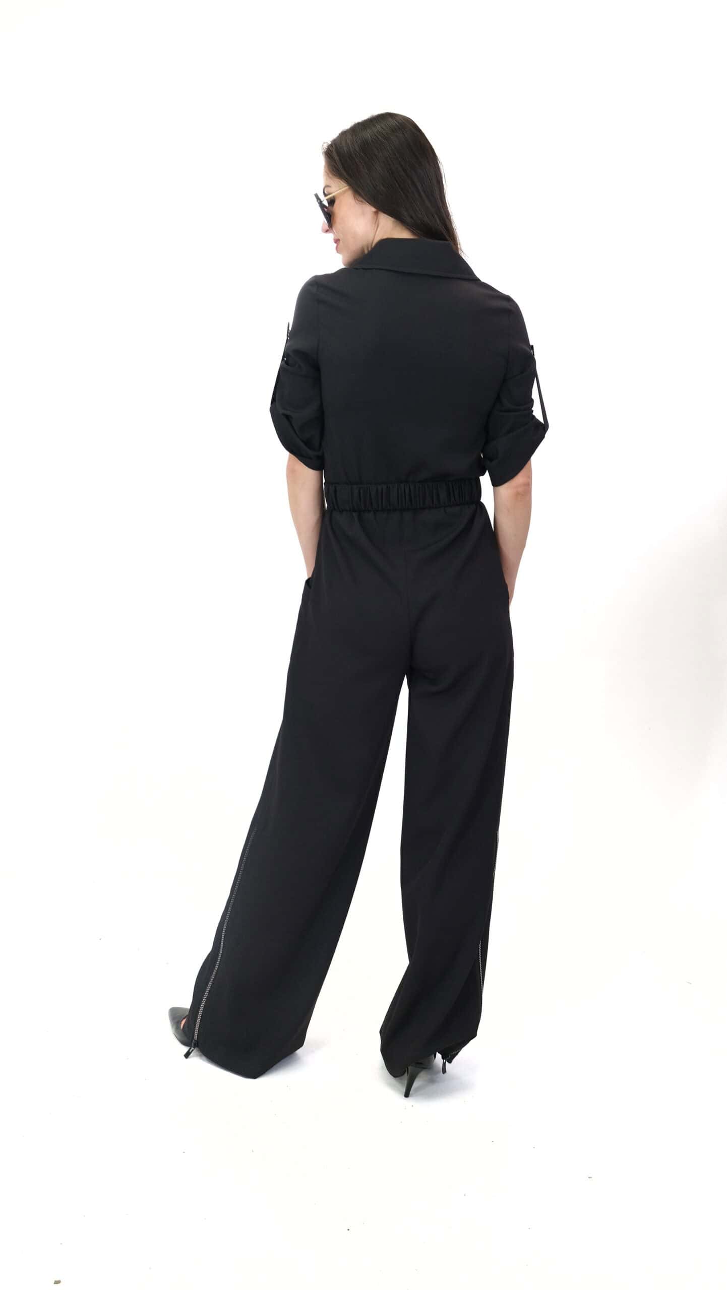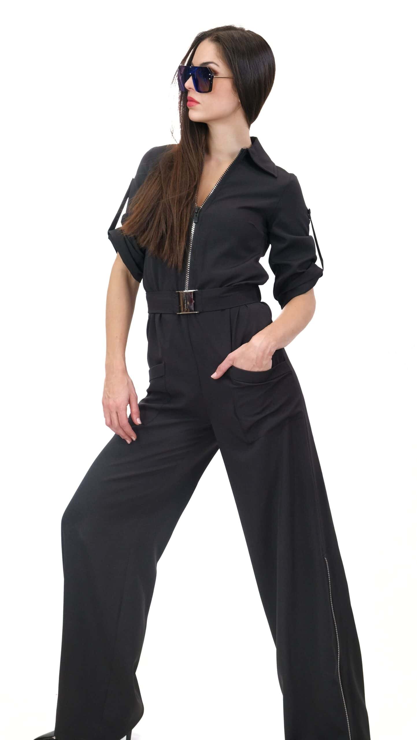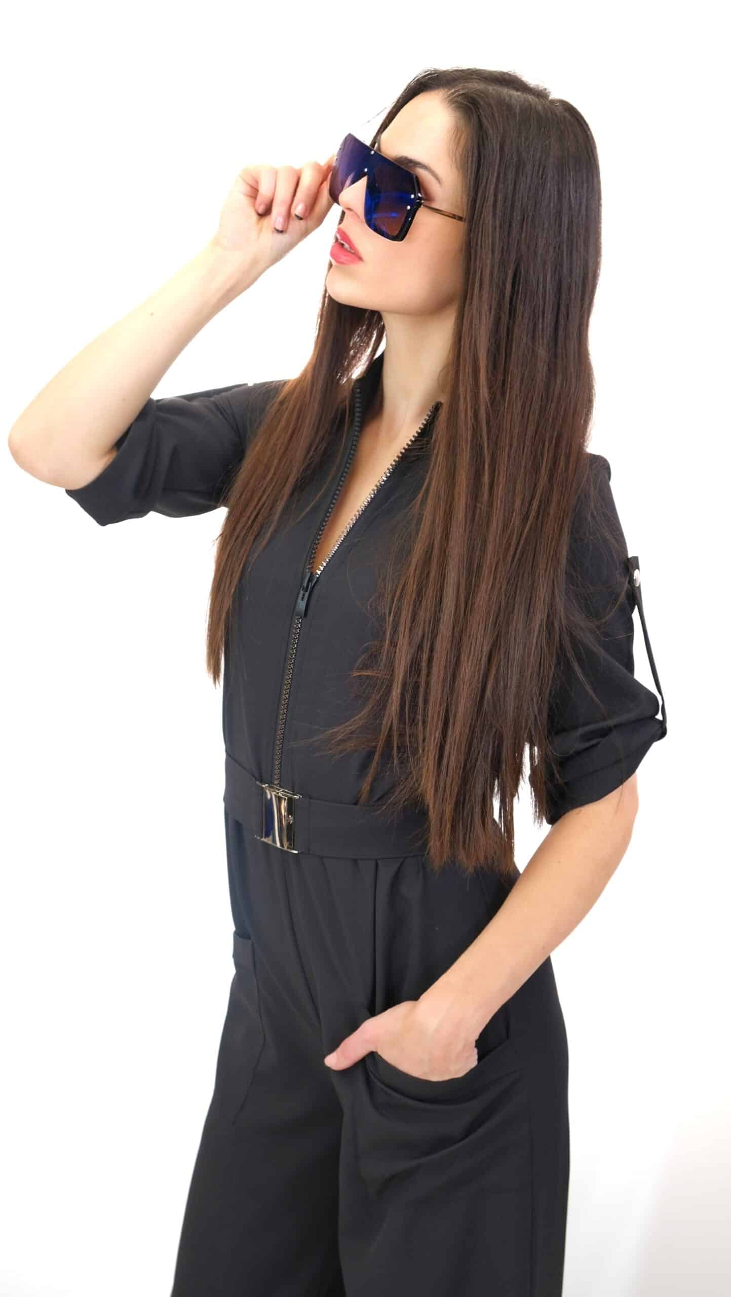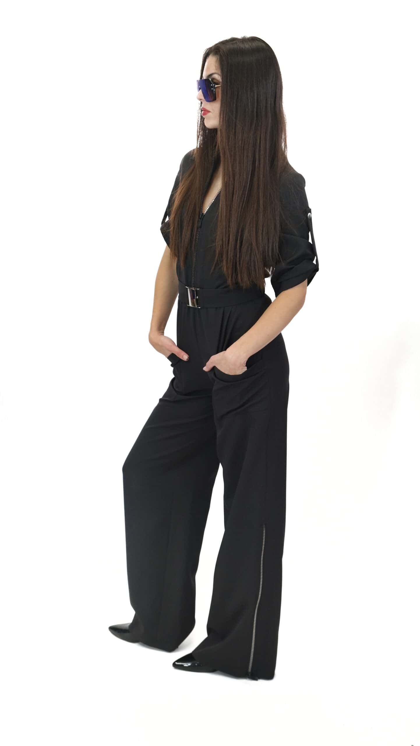 Overal je navrhnutý vo voľnejšom strihu, v ktorom sa aj vďaka vhodne umiestnenému zipsu budete cítiť komfortne počas celého dňa. Overal má praktické vrecká hlboké vrecká a rukávy sa dajú vyhrnúť čo mu dodáva ležérny štýl . Overal je prestrihnutý v páse, na ktorý viete krásne umiestniť opasok s ozdobnou sponou, čo je súčasť overalu. Zaujímavým detailom sú zipsy na spodku nohavíc, ktoré sa dajú roztvoriť. Overal je ušitý v nadčasovej čiernej, ktorá sadne každej jednej z Vás skombinujte ho s koženou bundou pre rockerský štýl.