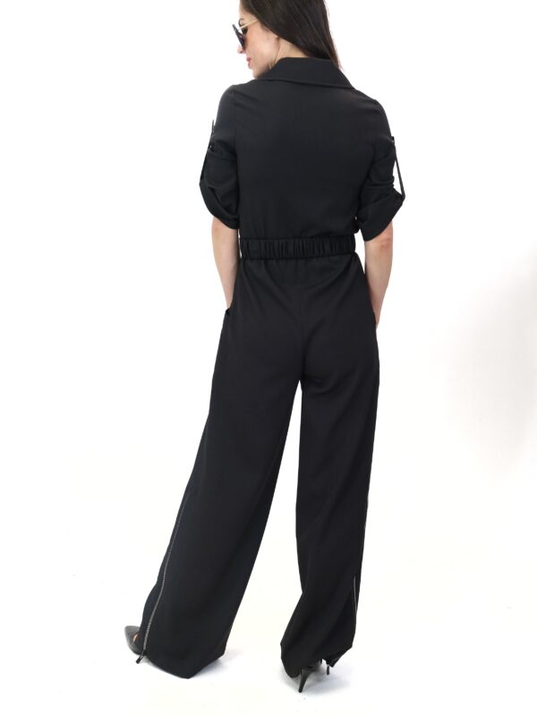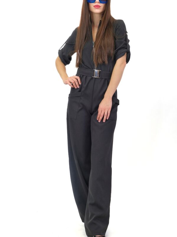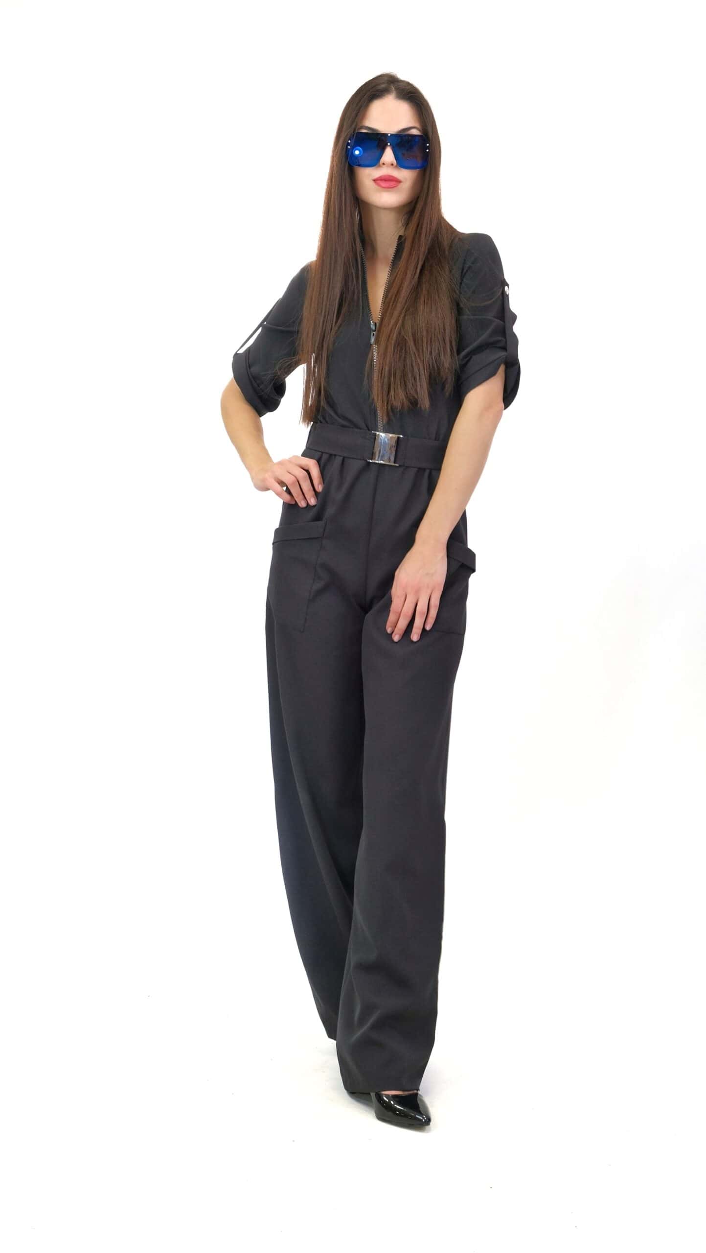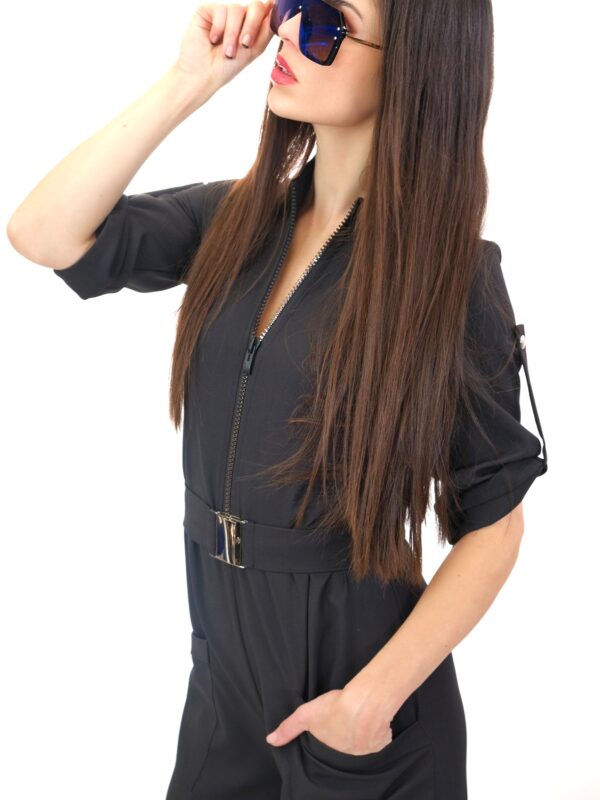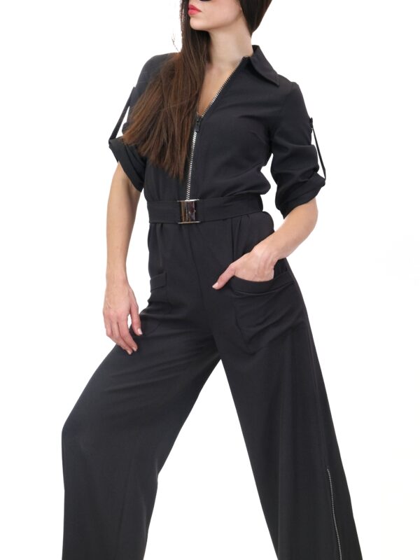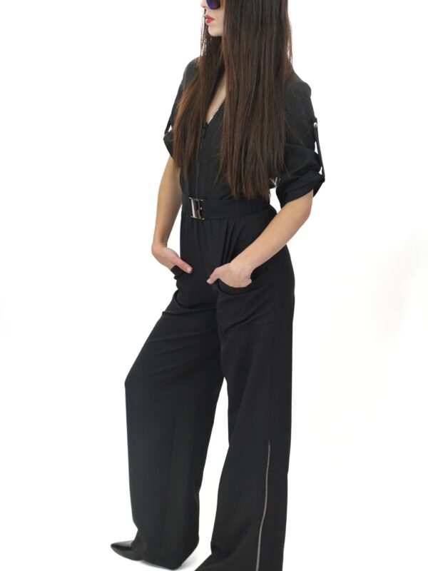Overal je navrhnutý vo voľnejšom strihu, v ktorom sa aj vďaka vhodne umiestnenému zipsu budete cítiť komfortne počas celého dňa. Overal má praktické vrecká hlboké vrecká a rukávy sa dajú vyhrnúť čo mu dodáva ležérny štýl . Overal je prestrihnutý v páse, na ktorý viete krásne umiestniť opasok s ozdobnou sponou, čo je súčasť overalu. Zaujímavým detailom sú zipsy na spodku nohavíc, ktoré sa dajú roztvoriť. Overal je ušitý v nadčasovej čiernej, ktorá sadne každej jednej z Vás skombinujte ho s koženou bundou pre rockerský štýl.