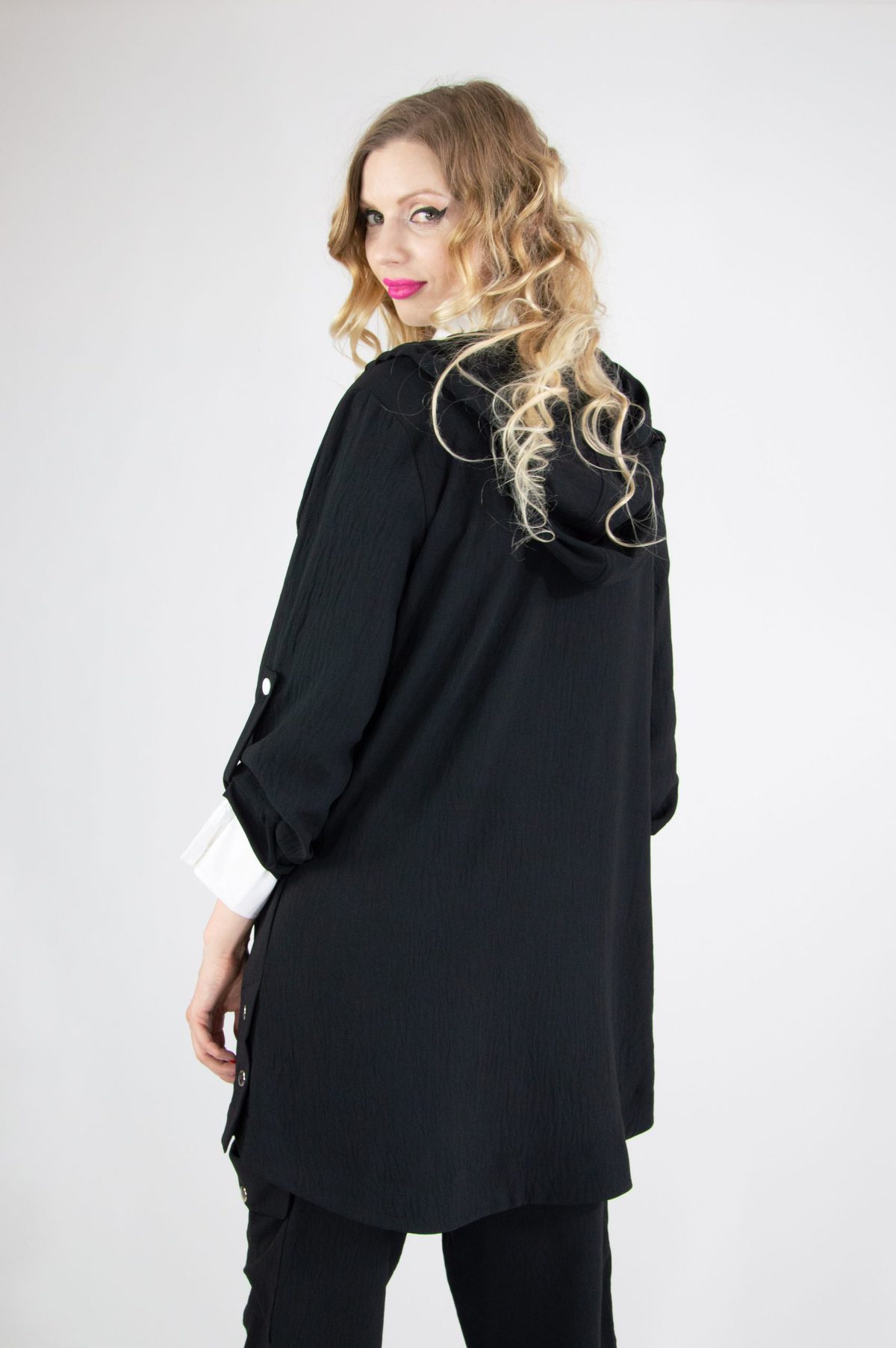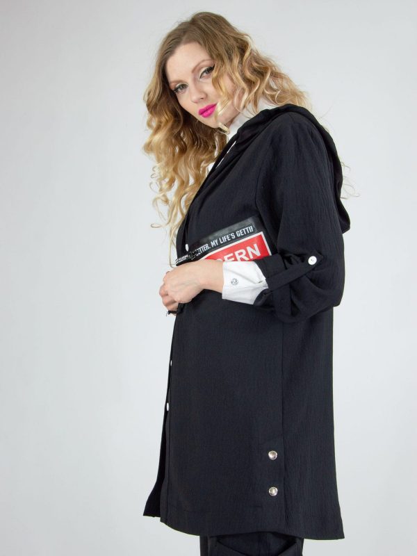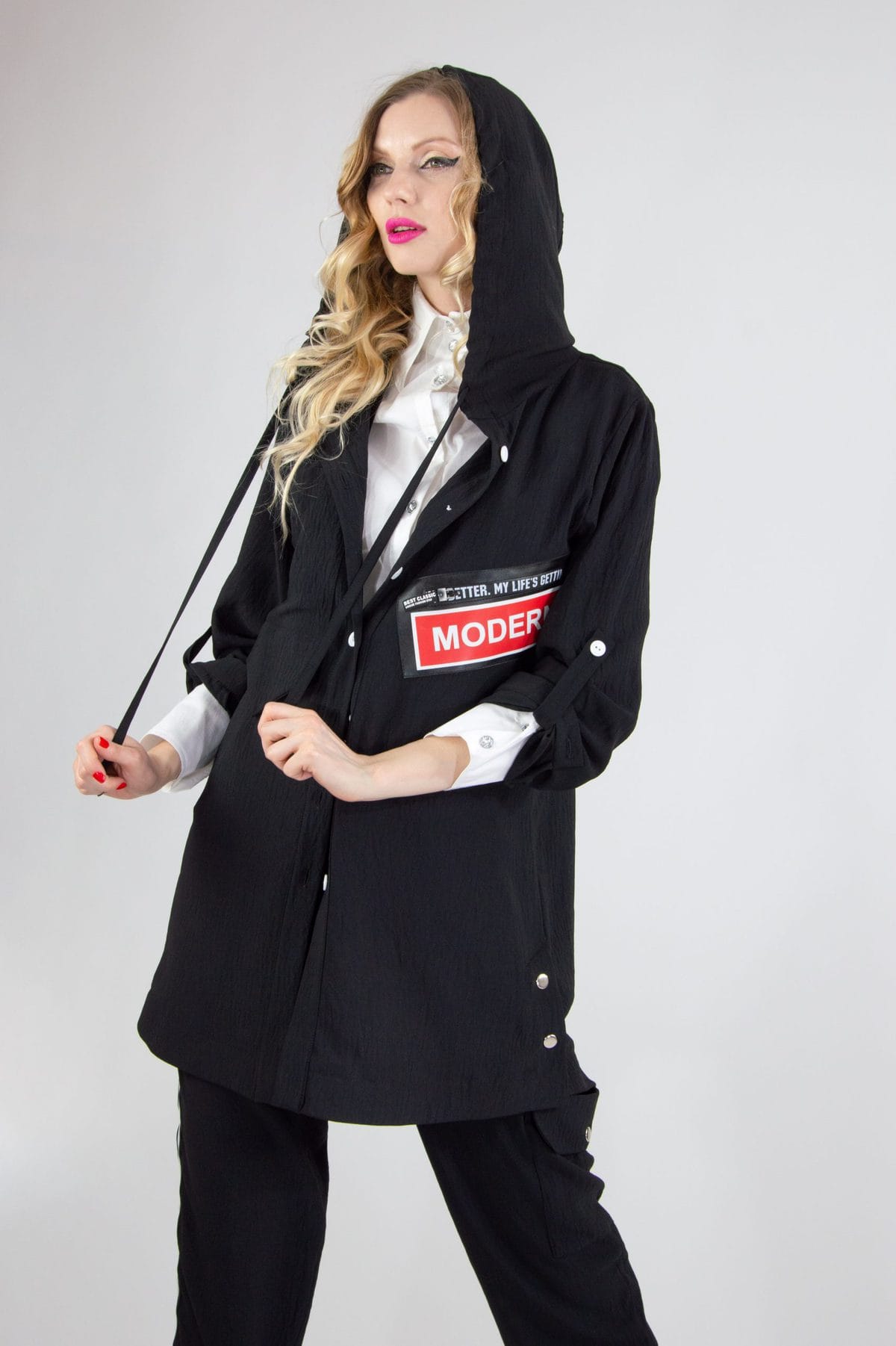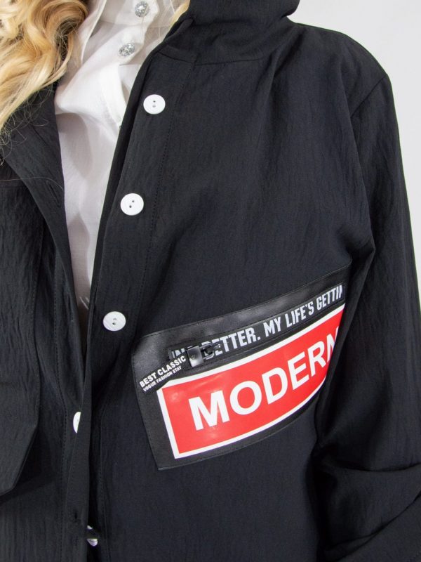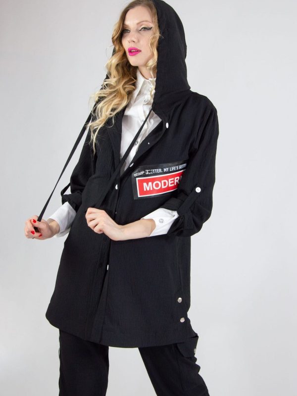 Plášť navrhnutý v pohodlnom oversize strihu. Vďaka áčkovej siluete skvele sedí na každú postavu. Plášť ma funkčnú kapucňu. Navrhnutý v nadčasovej čiernej farbe s výraznou nášivkou oživí každý jarný šatník.